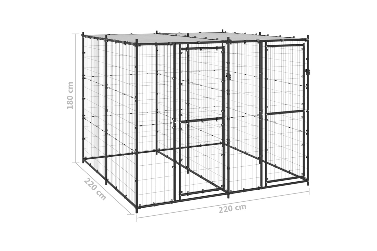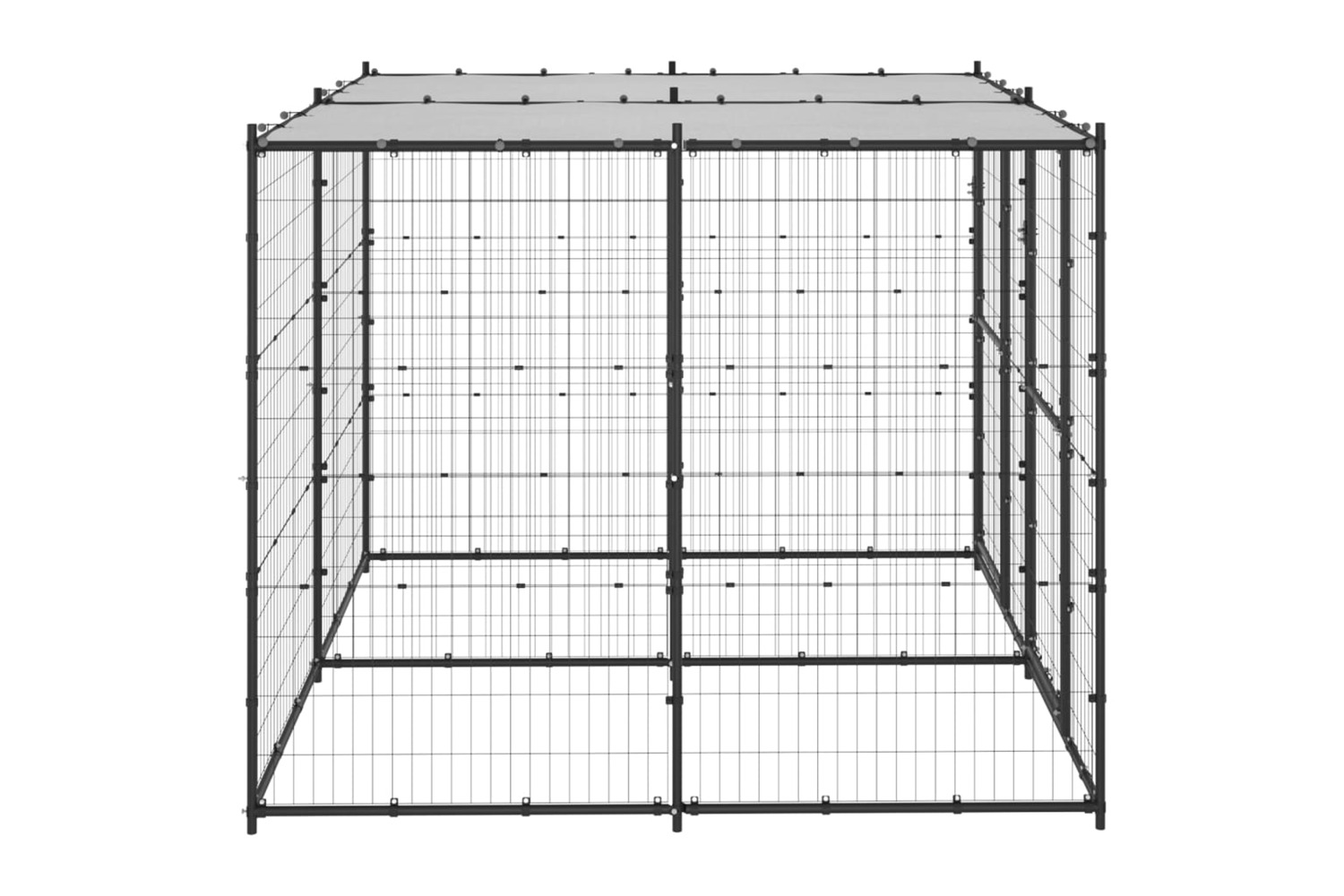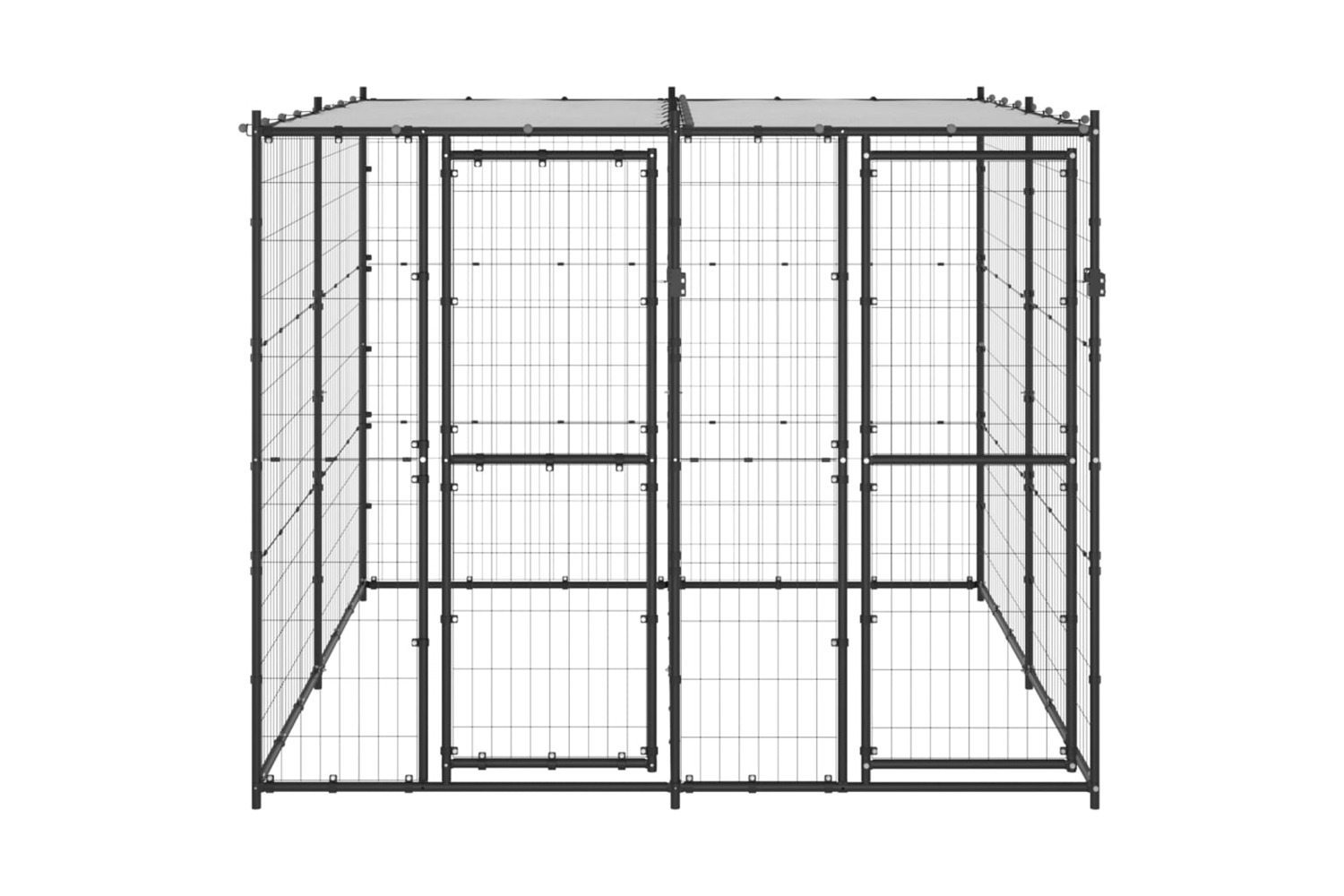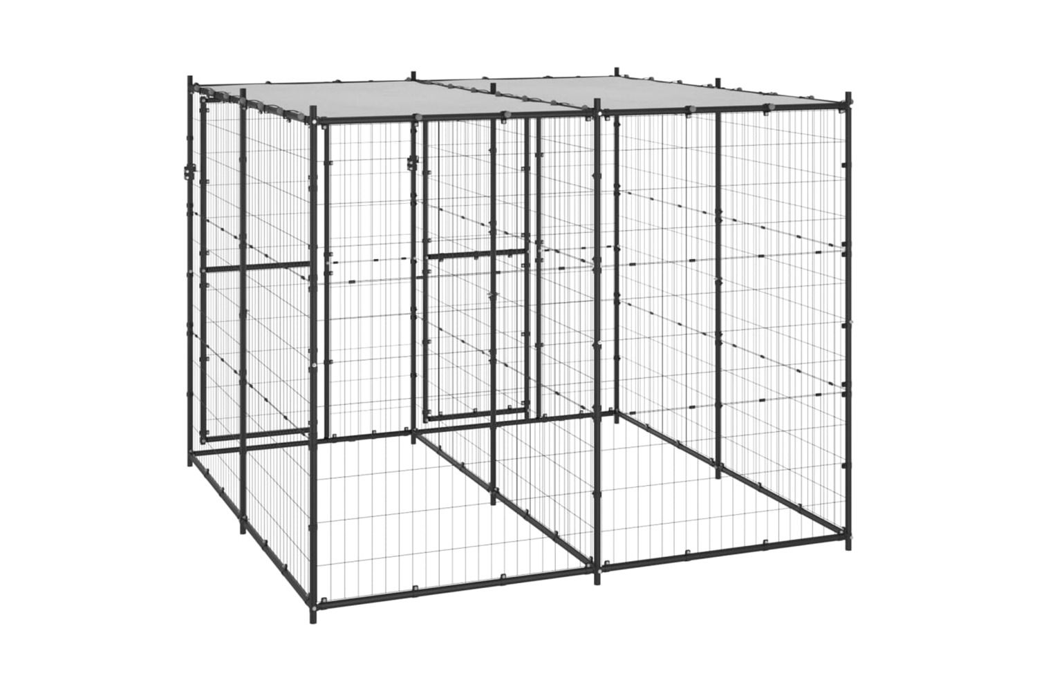 This dog kennel provides ample exercise space. The mesh all around helps prevent mischief and unexpected accidents while enabling ventilation. Thanks to the sturdy powder-coated steel construction, this dog kennel is durable and built to last. Made of PE, the included top canopy is water-resistant and UV-resistant, providing protection from sun, rain, snow, as well as other weather conditions. The hinged door with a lockable latch system ensures extra security and safety for your dogs.