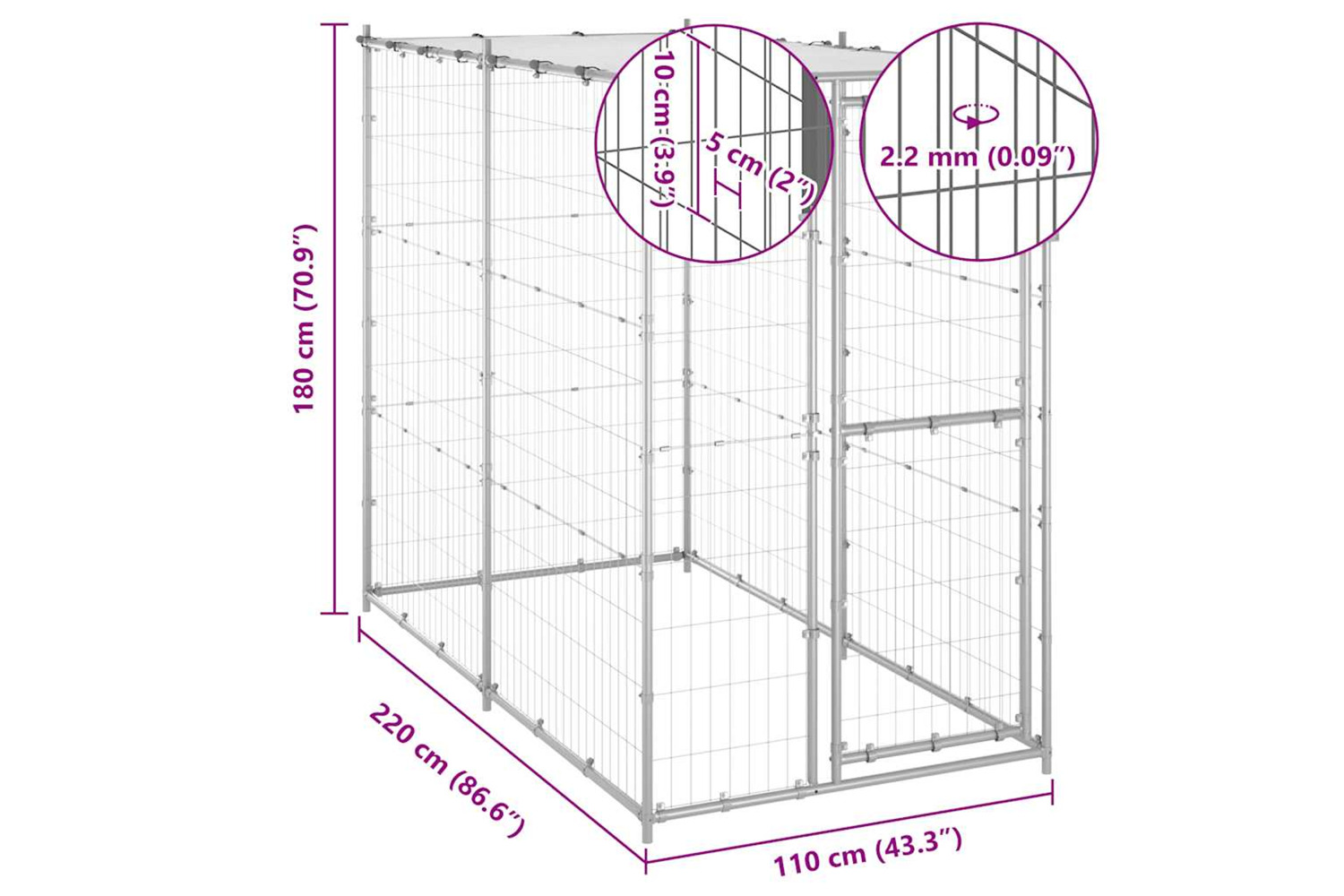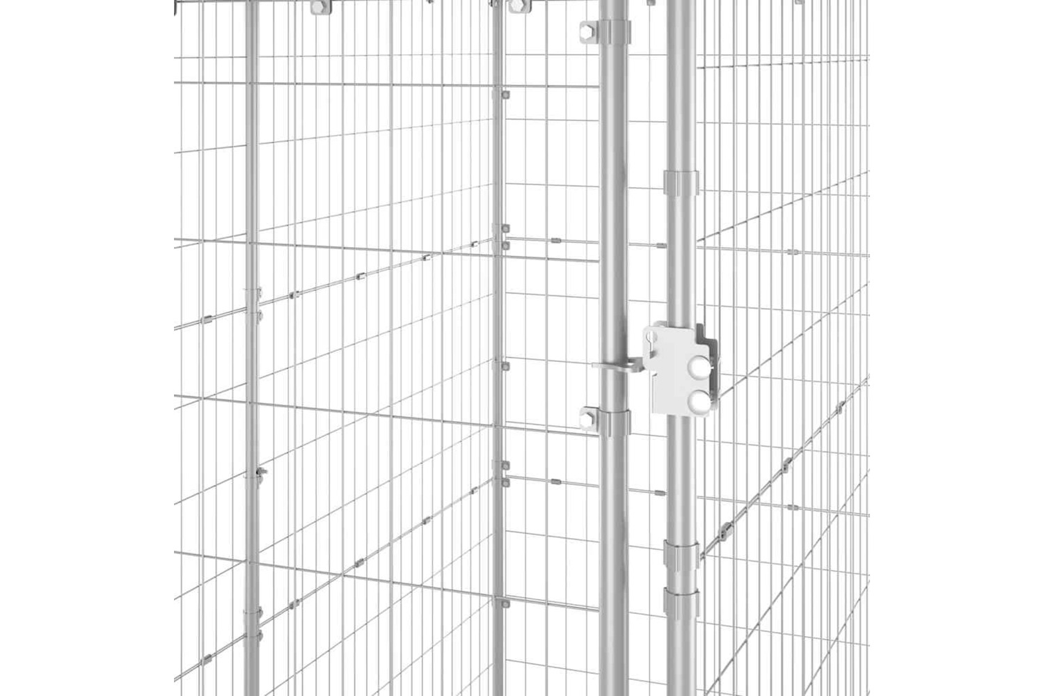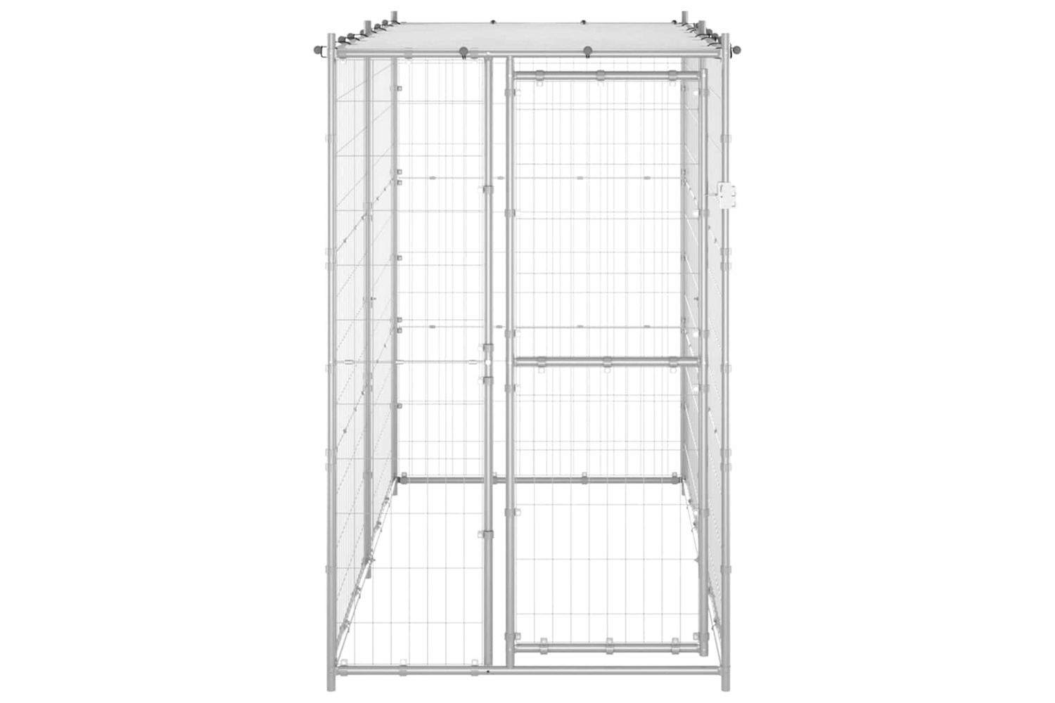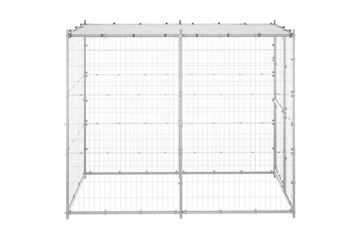 This dog kennel provides ample exercise space. The mesh all around helps prevent mischief and unexpected accidents while enabling ventilation. Thanks to the sturdy galvanised steel construction, this dog kennel is durable and built to last. Made of PE, the included top canopy is water-resistant and UV-resistant, providing protection from sun, rain, snow, as well as other weather conditions. The hinged door with a lockable latch system ensures extra security and safety for your dogs.