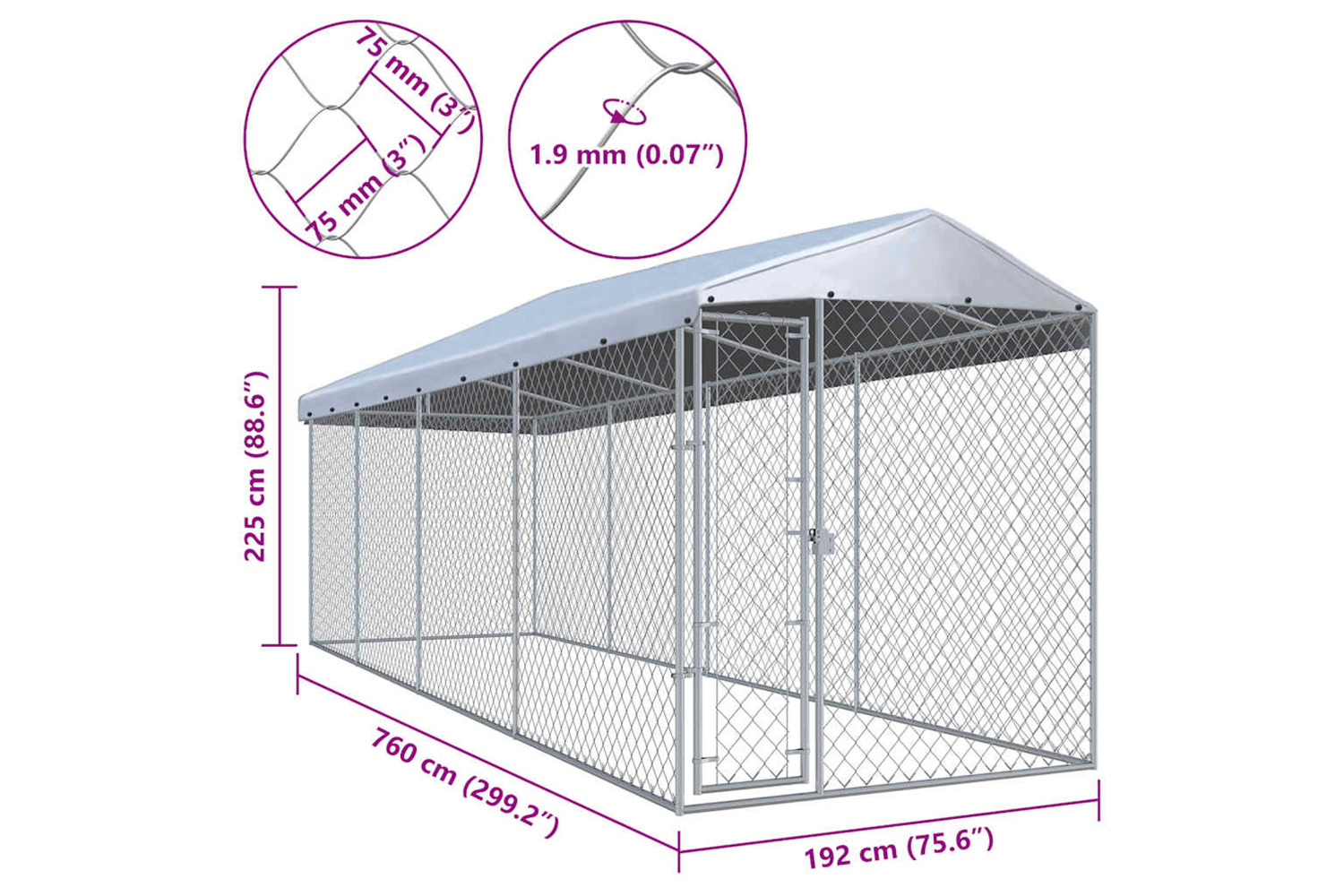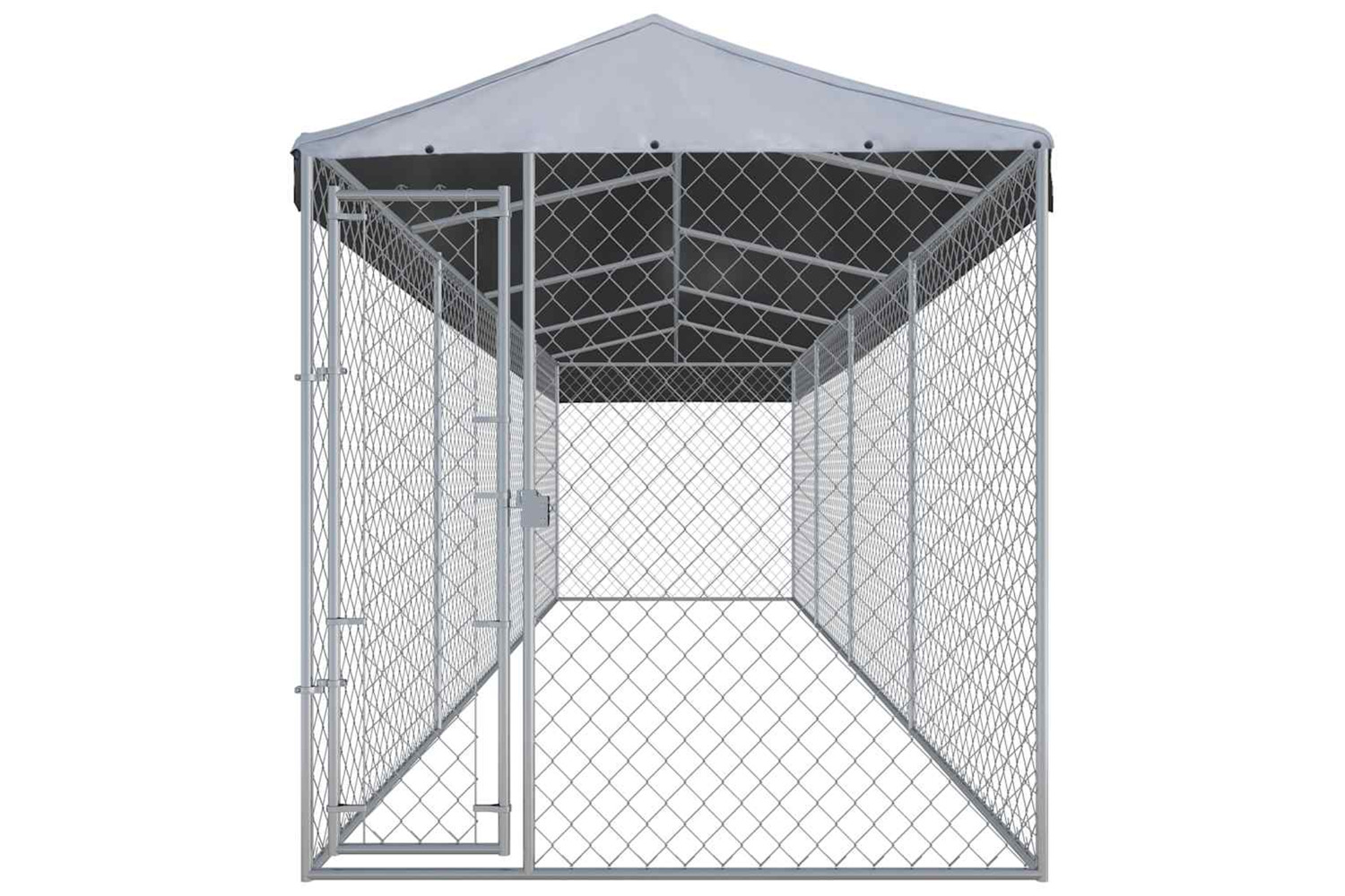 This large dog kennel provides ample exercise space while the chain link mesh all around helps prevent mischief and unexpected accidents, while enabling ventilation. Thanks to the sturdy and heavy-duty galvanised steel construction, this dog kennel is durable and built to last. The included top canopy, made of 100% polyethylene, is fire-resistant and UV protected, providing protection from sun, rain, snow and other weather conditions. The hinged door ensures extra security and safety for your dogs thanks to the lockable latch system. Assembly is really easy.