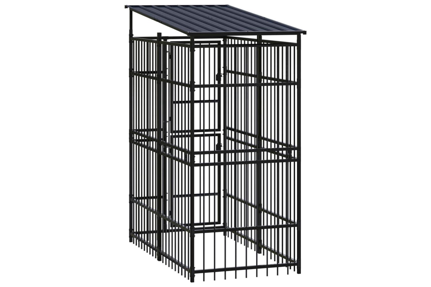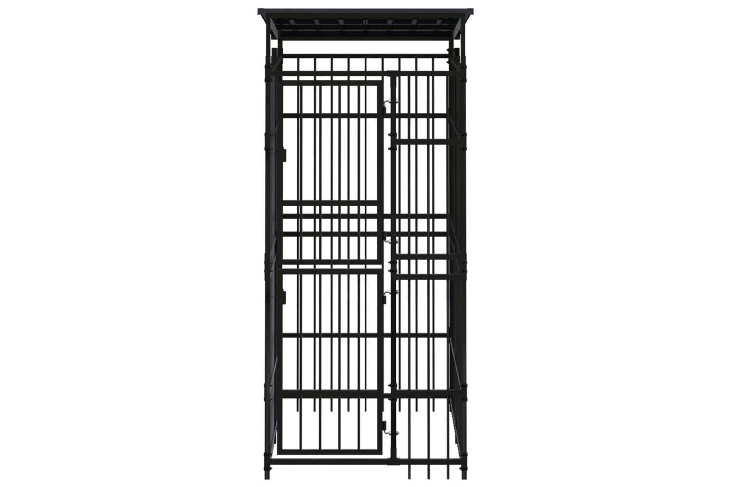 This dog kennel provides ample exercise space. The walls of steel bars help prevent mischief and unexpected accidents while enabling ventilation. Thanks to the sturdy powder-coated steel construction, this dog kennel is durable and built to last. The roof provides protection from sun, rain, snow, as well as other weather conditions. The hinged door with a lockable latch system ensures extra security and safety for your dogs.