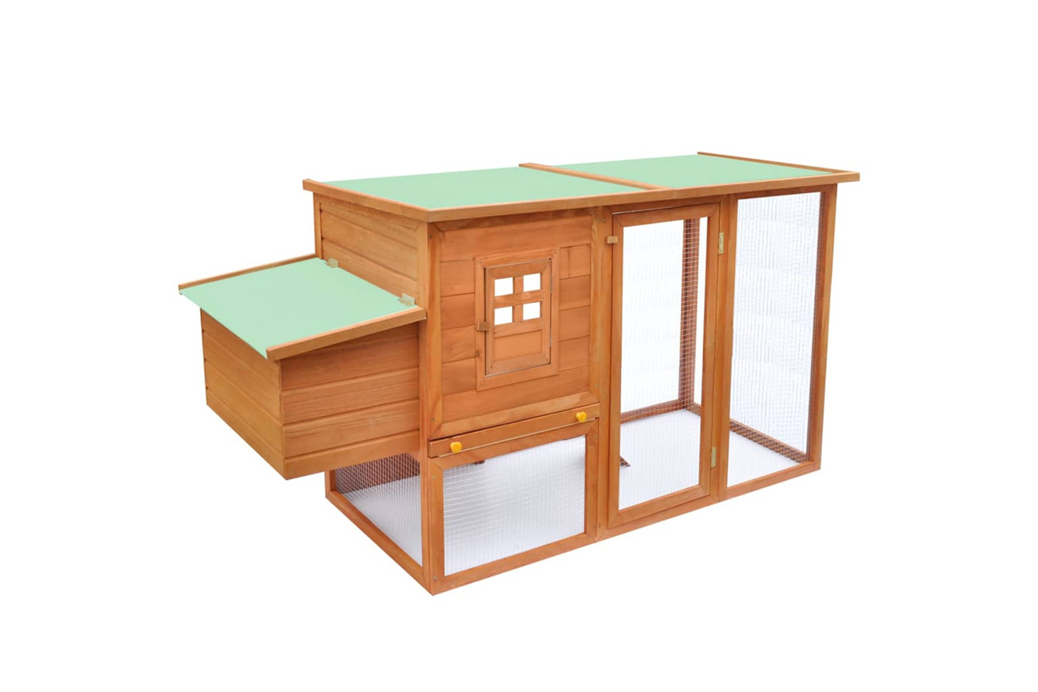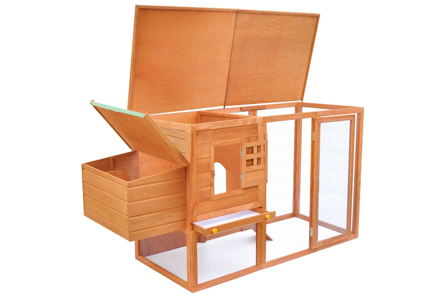Thanks to the close-knit iron wire mesh, your chickens will always get enough fresh air. An easy-climb ramp leads from the lower ground level to the upper floor. A pull-out tray allows an easy cleaning. And the door can be easily locked with a slide-bolt latch. In addition, an egg cage is designed for you to put the eggs in a safe place.