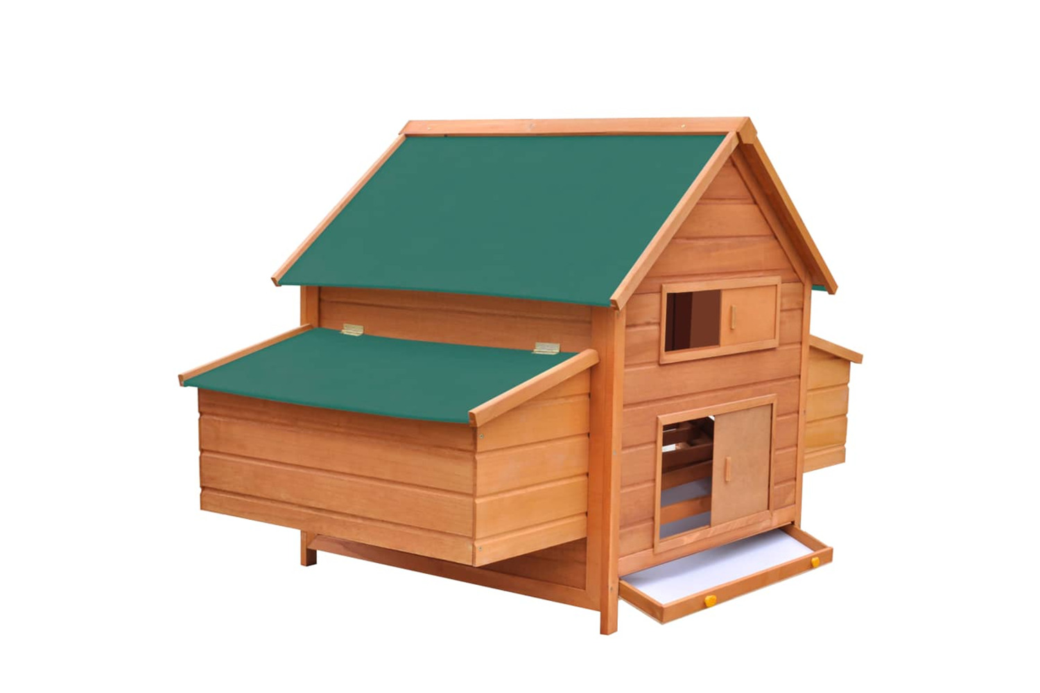 Made of high-quality pinewood, the coop is durable. The green waterproof fabric on the roofs keeps rain away, creating warm, comfortable resting areas inside the hen house.