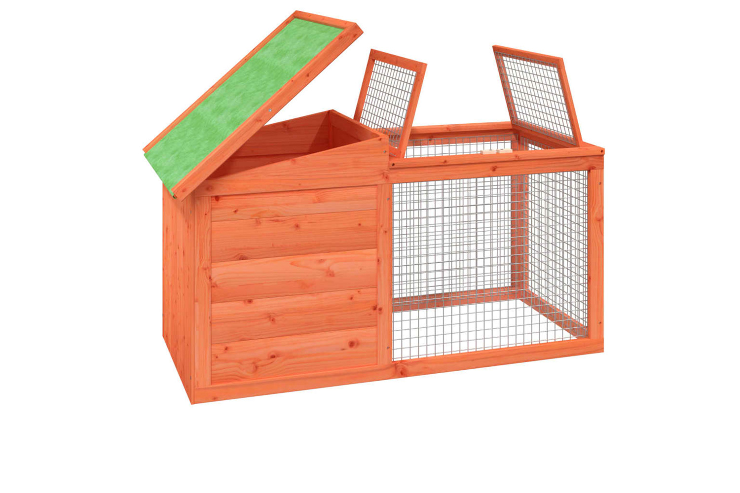 This rabbit hutch with a spacious activity centre and a sleeping area, offers a safe and comfortable place for your furry friends like bunnies, guinea pigs, small ducks, and other small pets to play and rest.