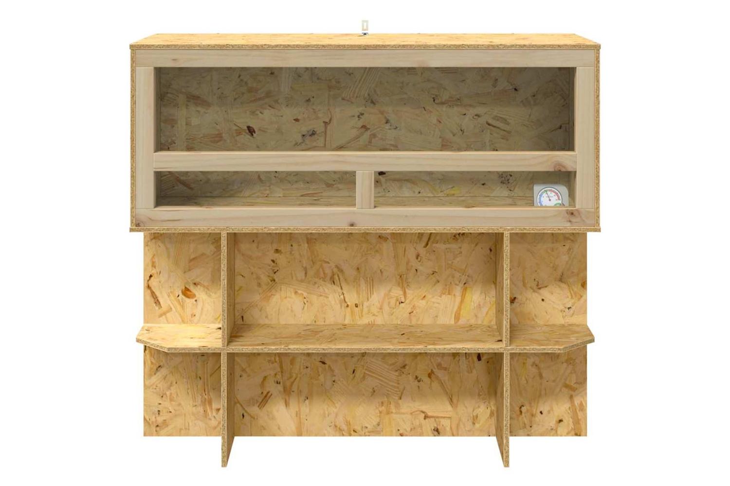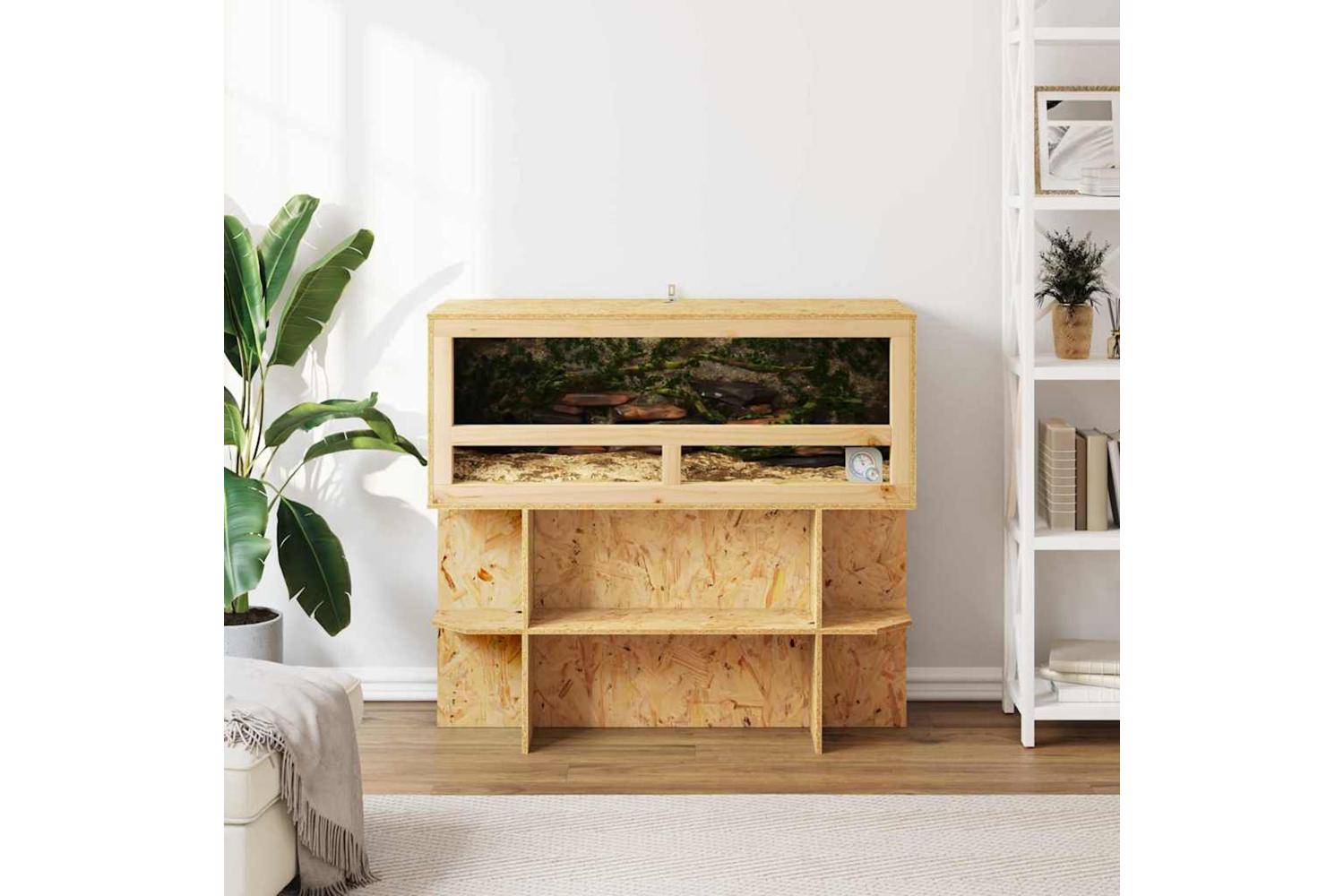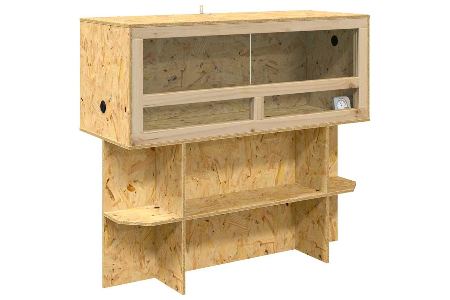 This OSB terrarium brings a charming blend of rustic appeal and functionality. Its rectangular design, crafted with OSB and glass, provides a spacious and safe environment for your reptile pets. The terrarium's brown exterior exudes warmth, creating a cozy habitat that complements any indoor setting. Designed to accommodate a range of reptiles, its free-standing shelves and painted finish offer both style and durability, making it a versatile addition to your pet supplies.