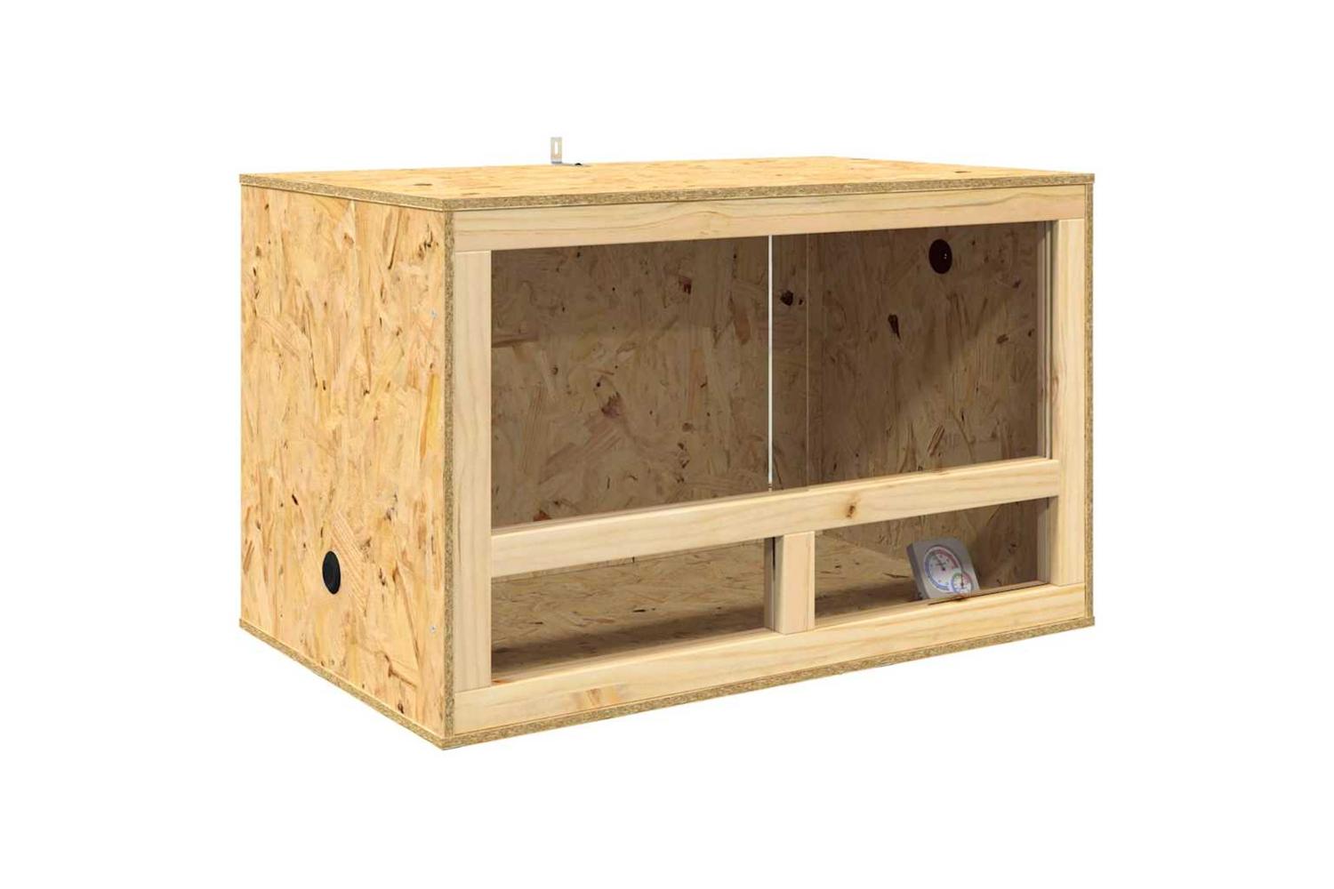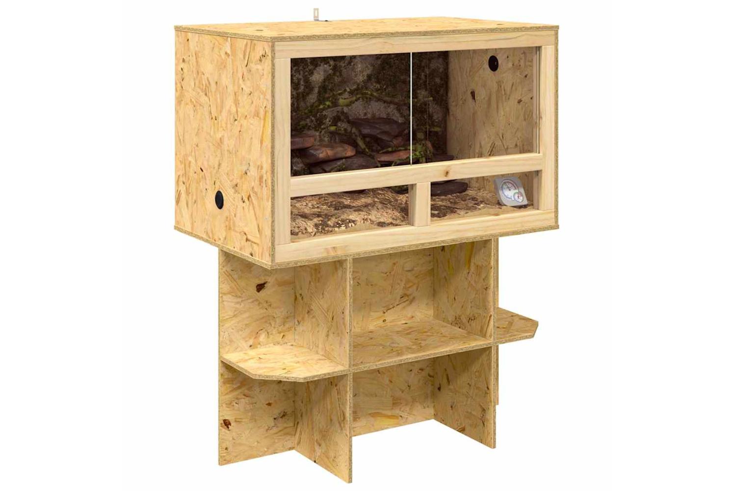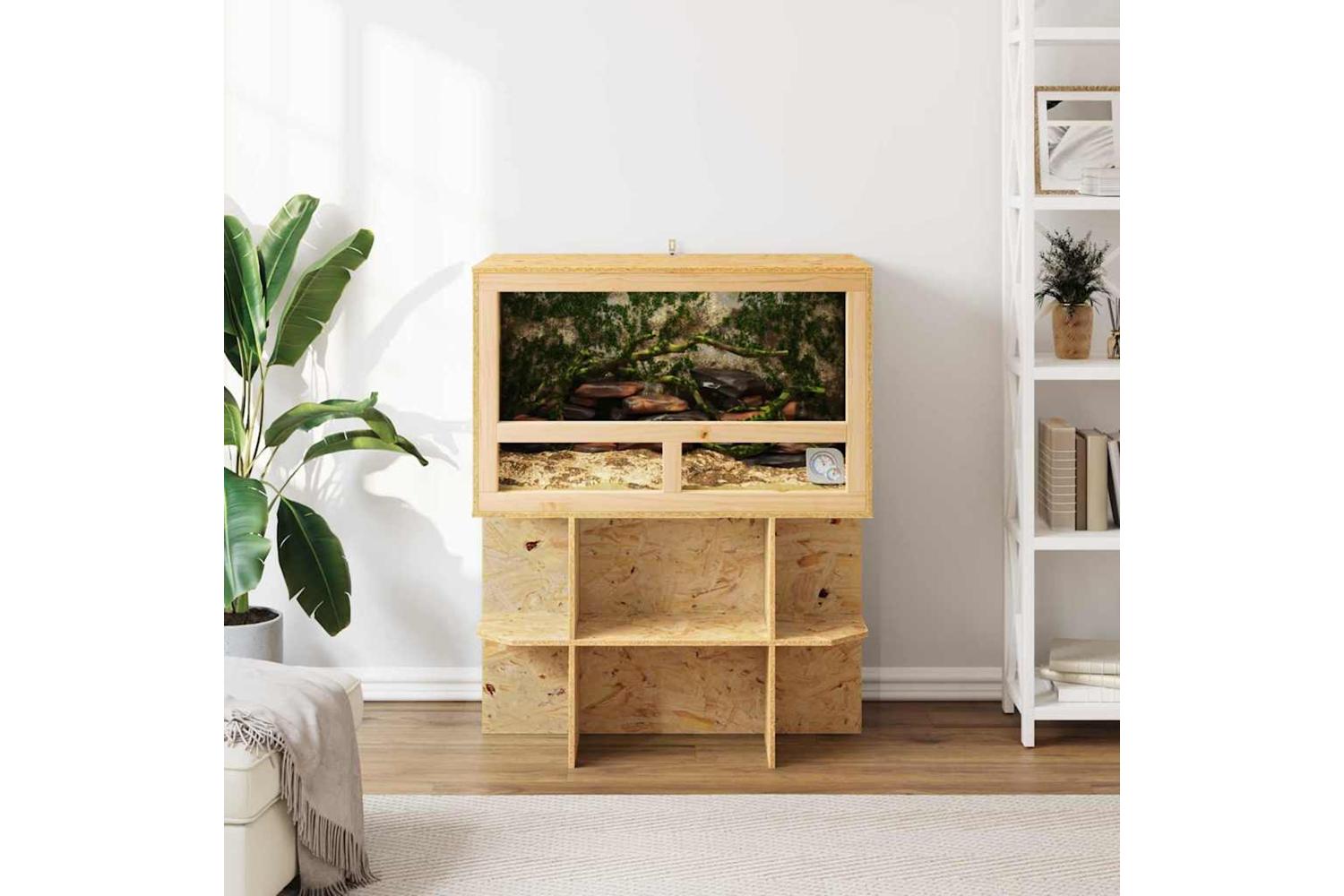 This rustic and spacious terrarium features a robust design suitable for various reptile and rodent pets. Its natural appearance and rugged style make it perfect for indoor settings, while an OSB and glass structure complements the space. The matte finish ensures a refined non-reflective look, that effortlessly blends into your home decor.