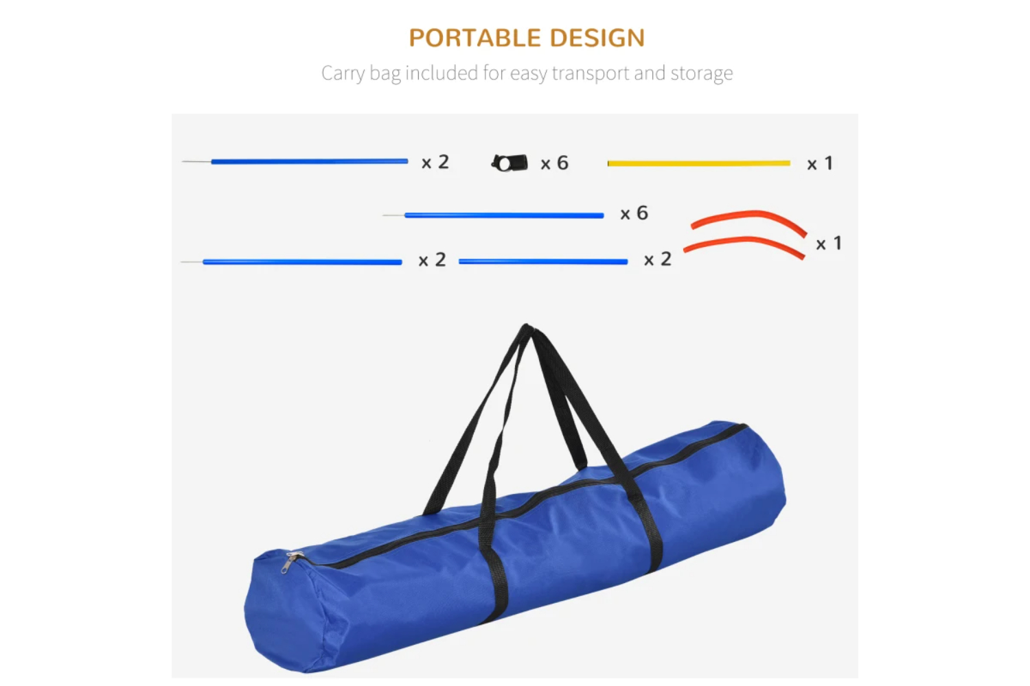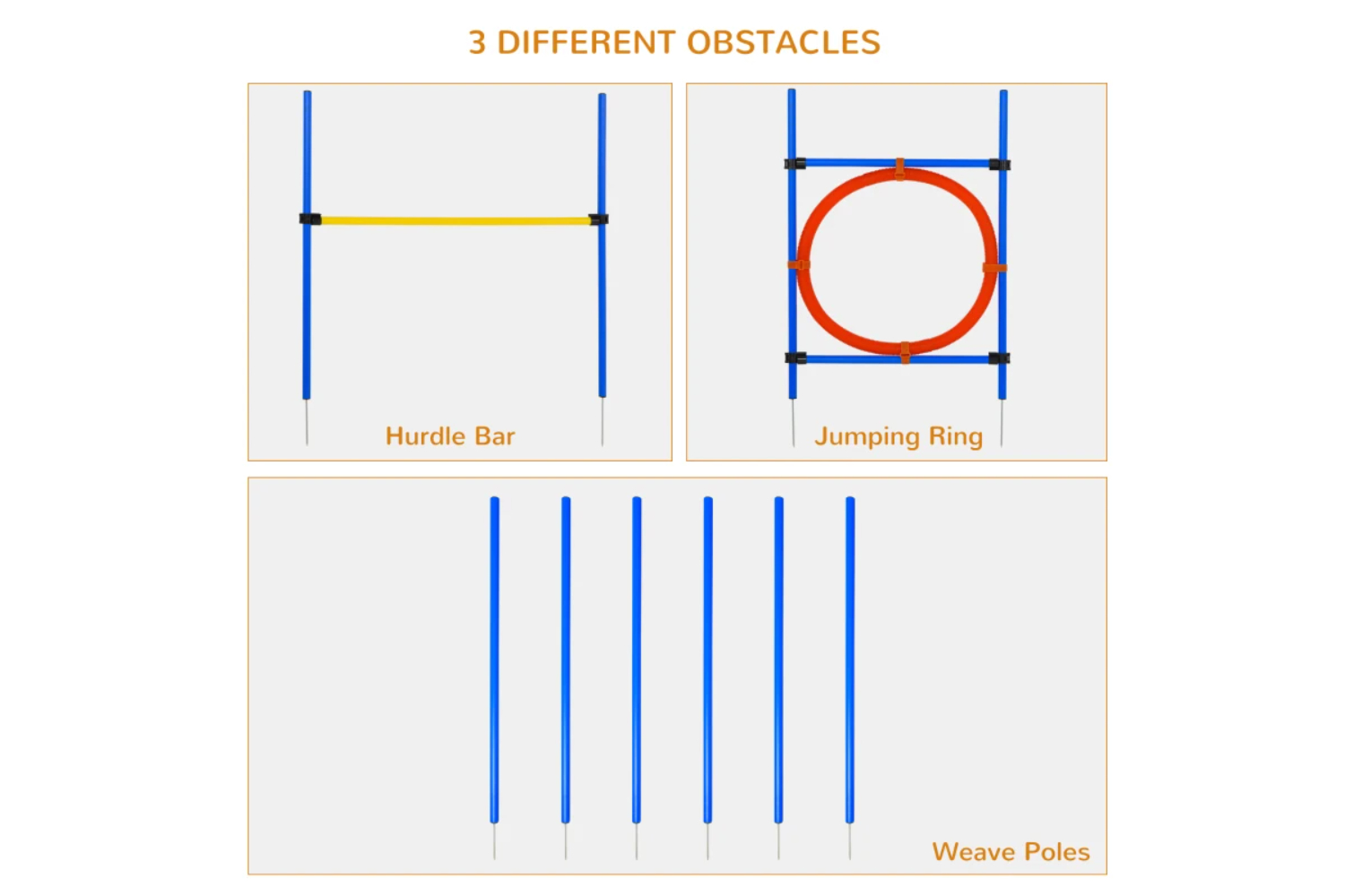 PawHut dog agility equipment set include Jump Hurdle, Weaves Holes, Hoop Jump to provide professional and safe training. The set is designed light and sturdy and it offers you various ways to train and show your dog! Wish you a good time with your dogs! All of these 3 tools are easy to assemble and store, and comes with a carrying bag.