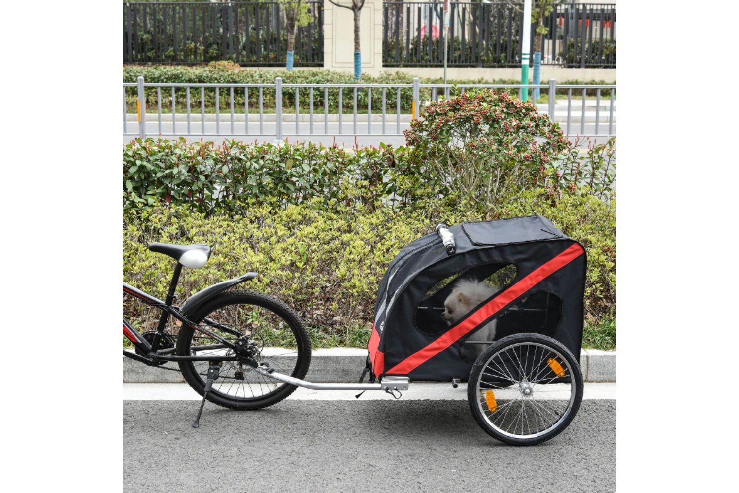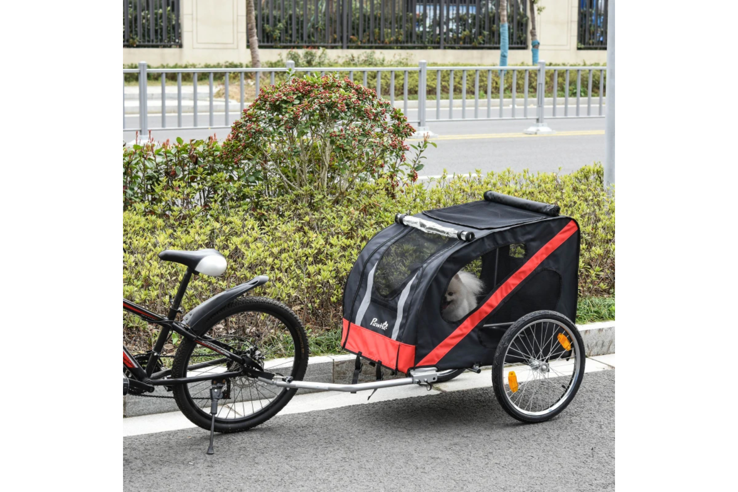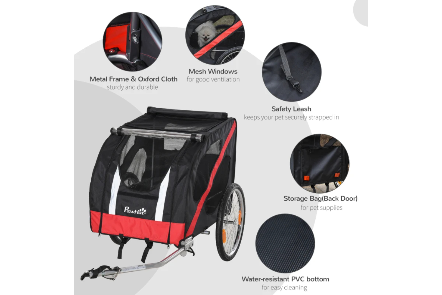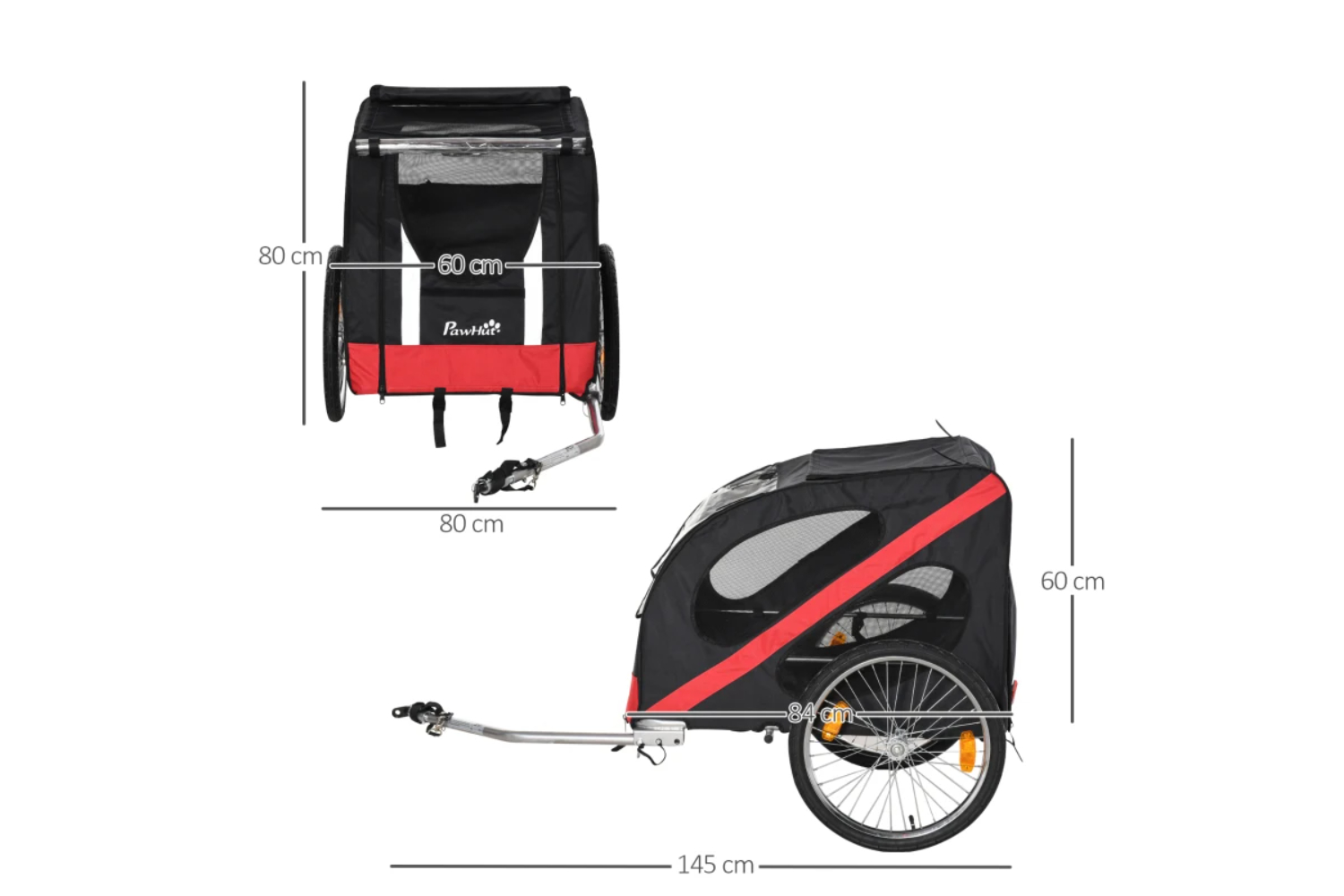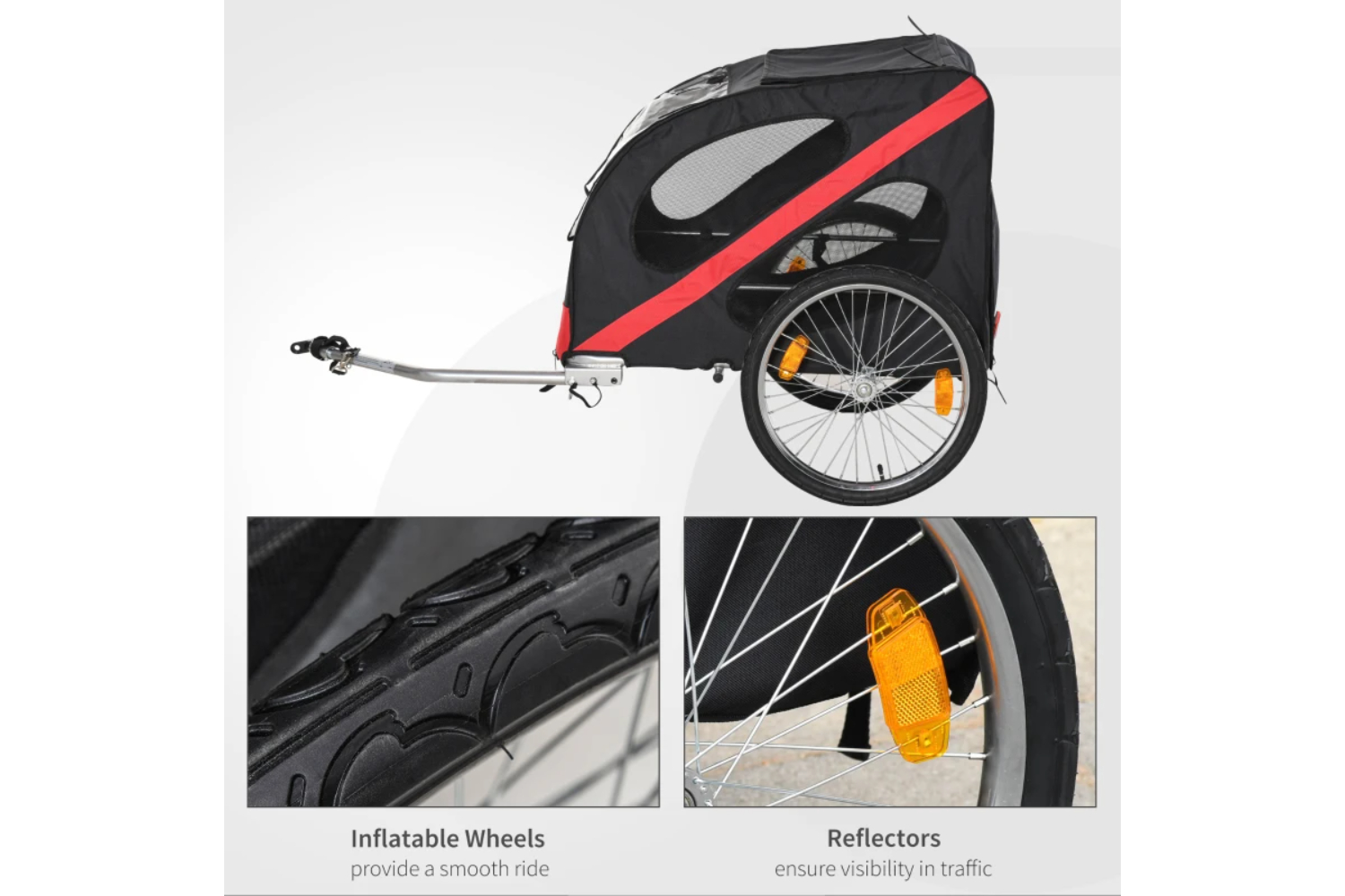 This pet bike trailer is a great way to maintain an active lifestyle for you and your pets. This pet bike trailer can be set up in minutes. The mesh zippered screen on front, top and back allow for maximum airflow for your pet. Exciting biking and outdoor adventures don’t have to stop when your pet gets old. With this dog bike trailer, simply hook it up to your bike, put your pet inside, store your cargo in the convenient back storage unit. The rewindable Oxford cloth and PVC cord will help keep away wind, rain, sun, and road debris.