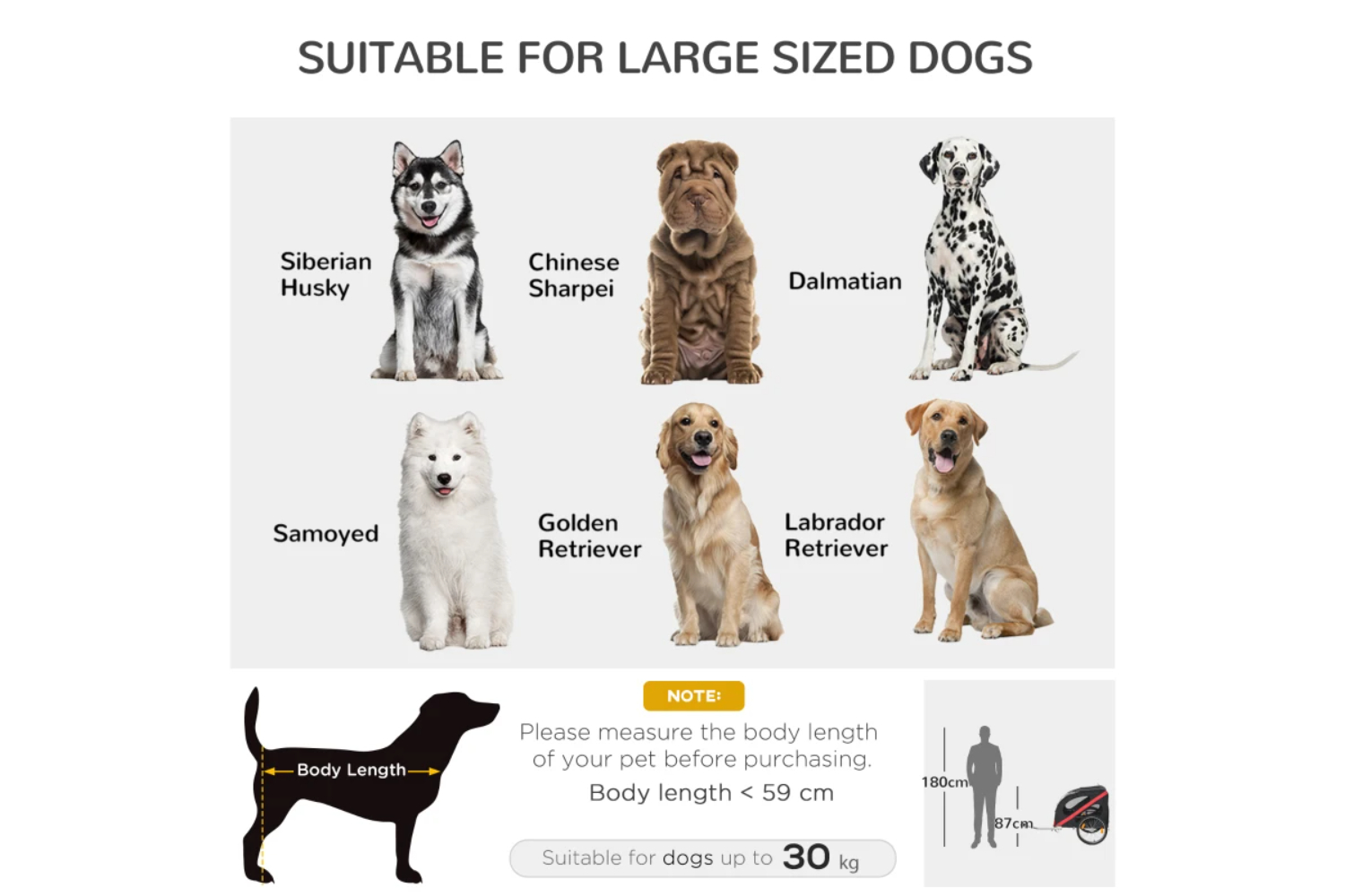 This is a decent option if you want to transport multiple small dogs (≈10kg each) or just a couple of larger dogs. The listing is a tad misleading as the Storage bag in question is a zipper pouch on the rear of the trailer for storing maybe a dog lead or a frisbee. It's not a storage bag for the trailer itself. The size of the trailer is a bit awkward as it doesn't fit through standard household doorframes so needs to be assembled and disassembled outside, which thankfully doesn't take too long. The dogs stay nice and dry when it's raining and the hitch adapter for the bike was easy to install on my bike. The weight capacity in the provided documents is much higher than the listed rating, I believe it said over 100kgs.