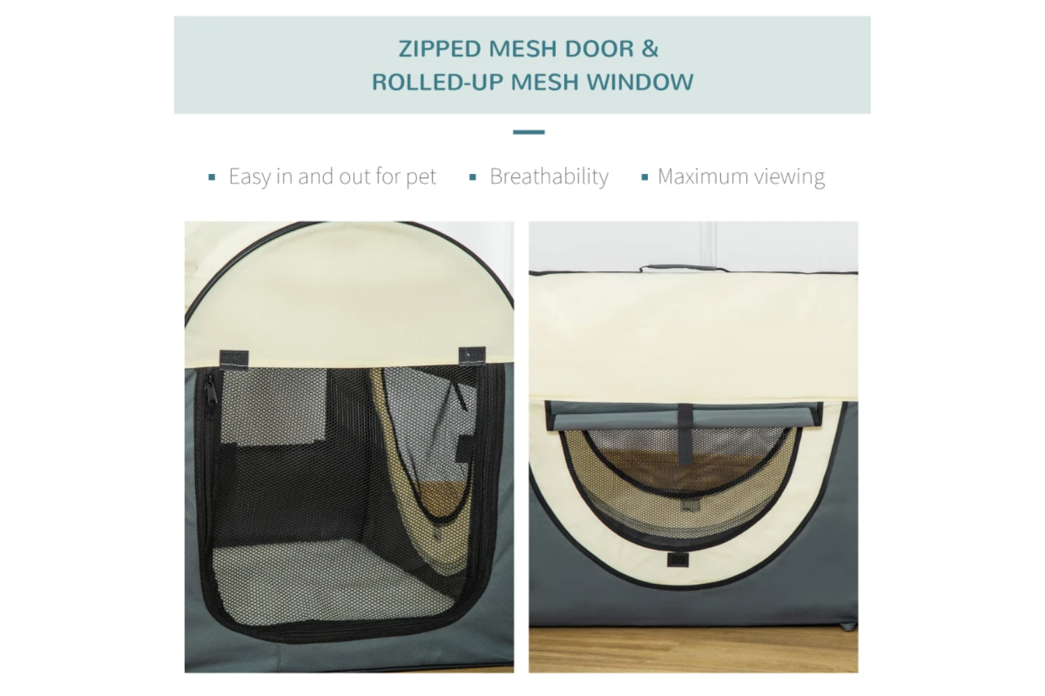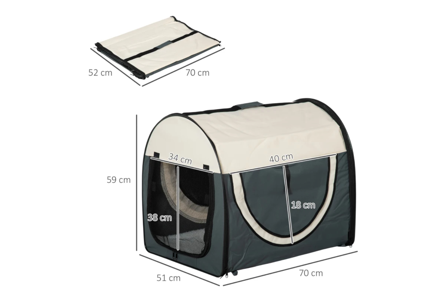 Material: Oxford cloth, SteelFolding dimensions: 70L x 52W x 7H cmDoor size: 34W x 38H cmWindow size: 40W x 18h cm. 55w x 16h cmProduct Features: