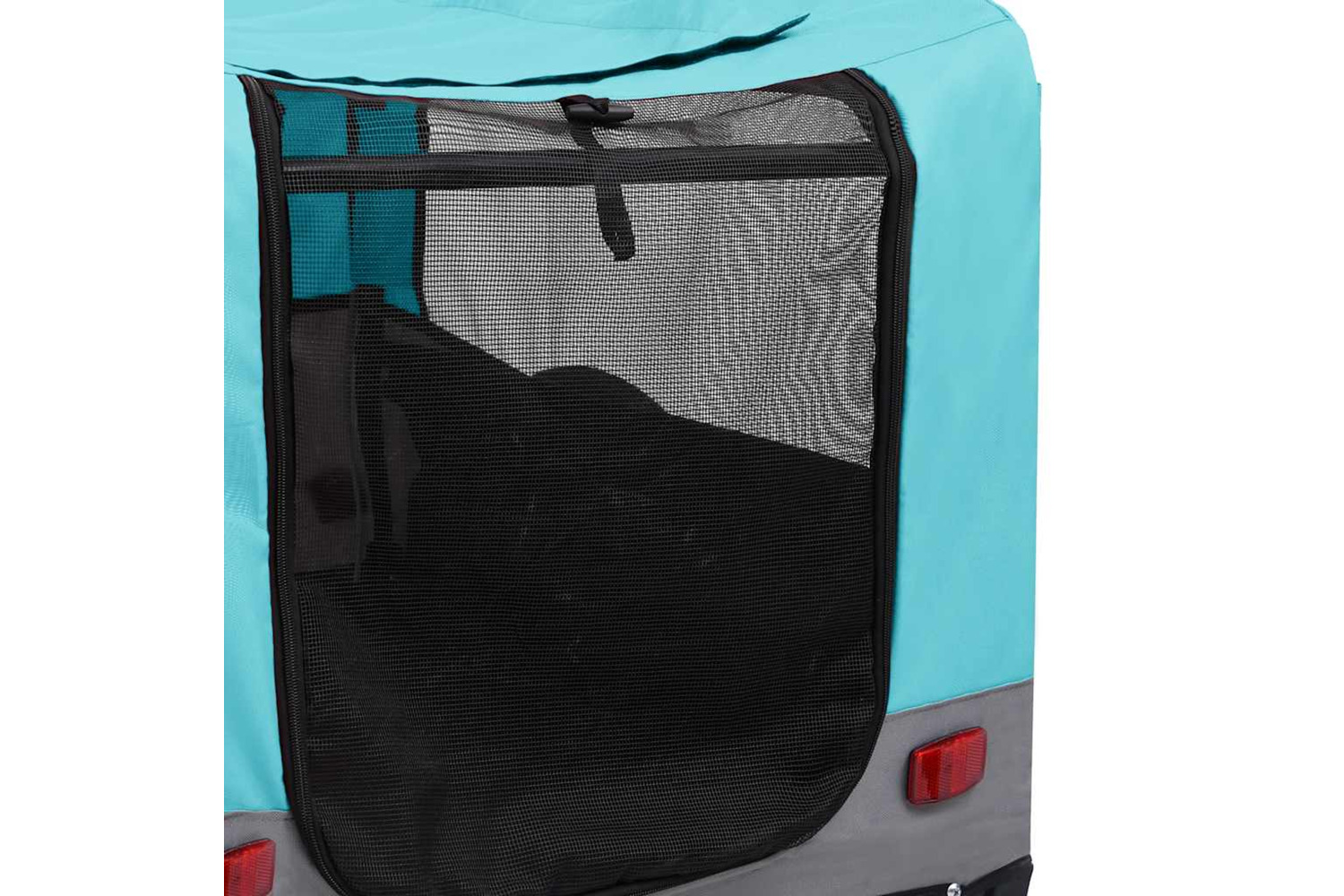 The pet trailer has a sturdy steel frame and is made of oxford fabric, making it durable and easy to maintain. Its mesh windows on both sides allow for maximum air circulation, while the front and back offer dual entry for added convenience. The pet bike trailer has a suspension for a smooth ride, and the front wheel can swivel 360 degrees for strolling. The safety rotating joint ensures that the trailer remains upright if the bicycle falls over. The dog bike carrier has a quick release hitch for easy attachment to a bike. Additionally, the tow bar can be folded to save space.