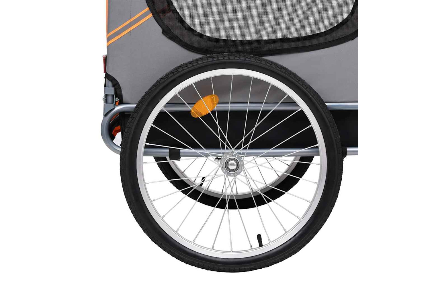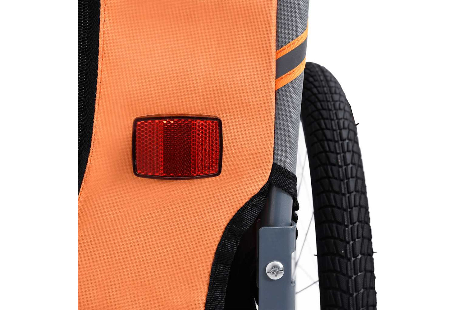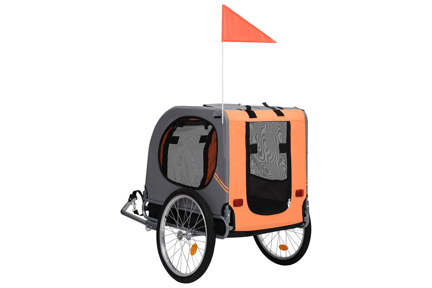 This dog bike trailer has a sturdy steel frame and is made of oxford fabric that makes it water resistant, durable and easy to maintain. Its mesh windows on both sides allow for air circulation, while the front and back offer dual entry for added convenience. The pet bike trailer has a suspension for a smooth ride and a leash hook in the interior for attaching a dog leash. The reflectors on each wheel and on the back help keep you and your pet visible to others. The rotating safety joint ensures that the trailer remains standing if the bicycle falls over. The base is reinforced with a special lining which is non slip and moisture resistant. The dog bike trailer has a quick-release hitch for easy attachment to the bike. This dog trailer can be folded to save space when not in use. It is easy to assemble.