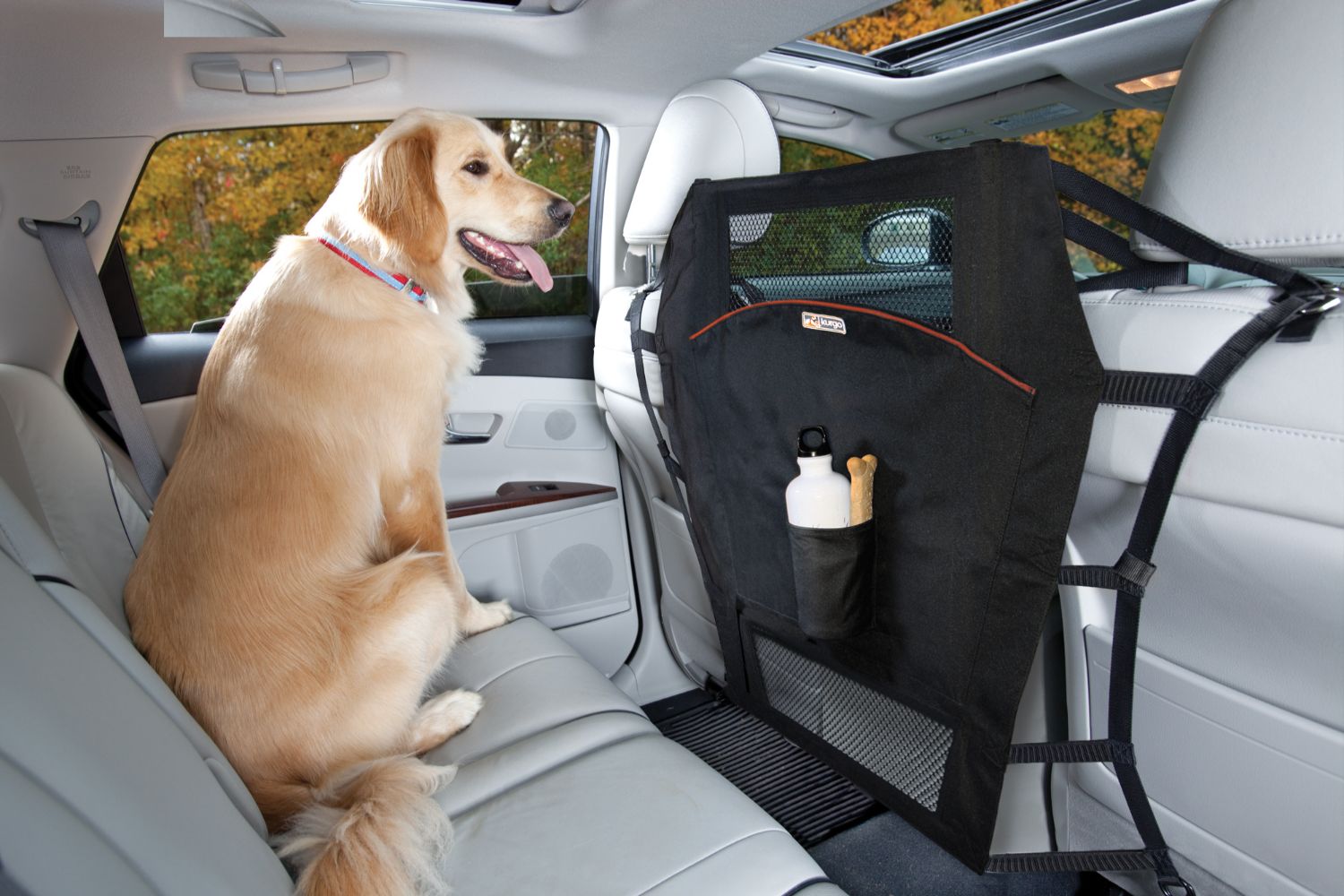 Attach the Barrier to the backs of your front seats, and the simple cloth barrier keeps your dog where she belongs for the sake of car safety, not to mention the cleanliness of the driving area. The mesh top means she can still see you and anything else that catches her interest.