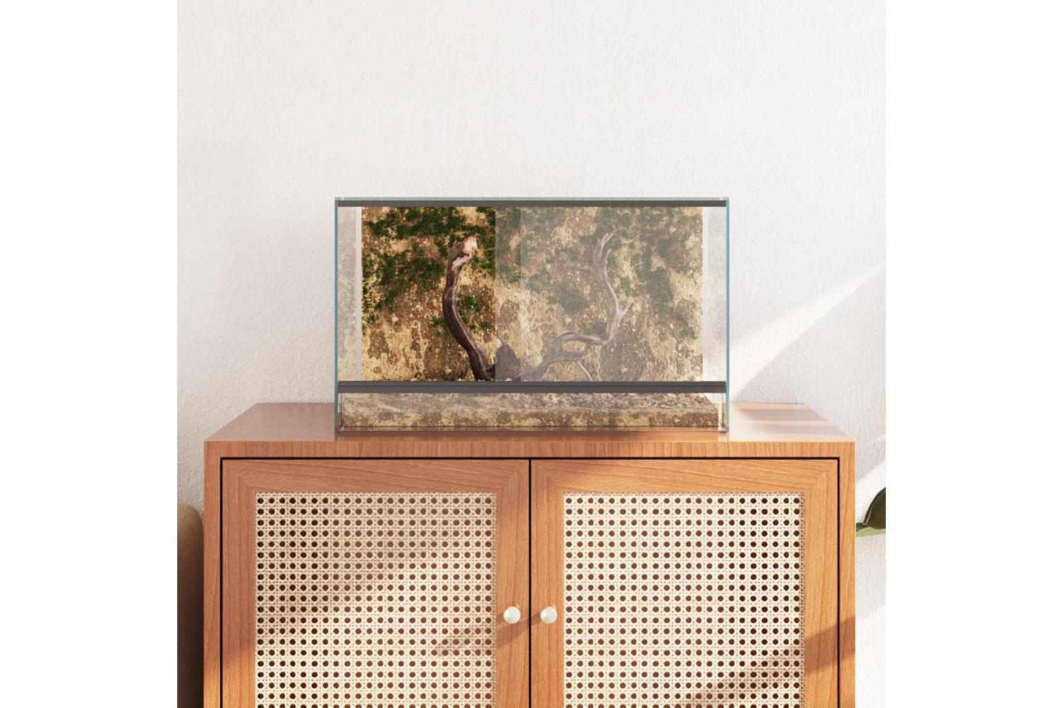 This Glass Reptile and Amphibian Habitat provides a refined setting for your pets, designed for their comfort and visibility. With its modern style, it fits seamlessly into both indoor and outdoor environments, offering an elegant look with its transparent glass material. The enclosure's smooth texture and clean lines make it a sophisticated addition to any space, providing a full view experience for pet owners who wish to observe their animals closely.