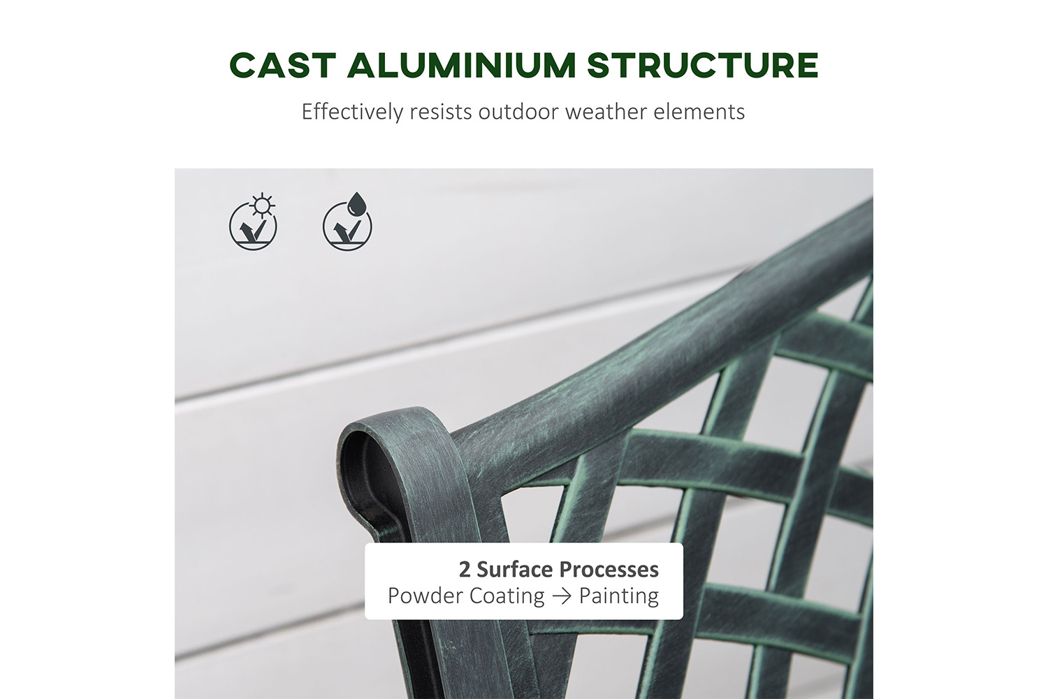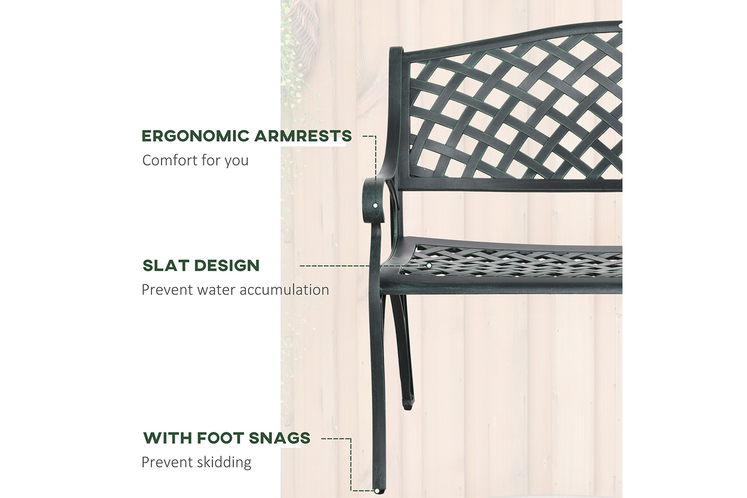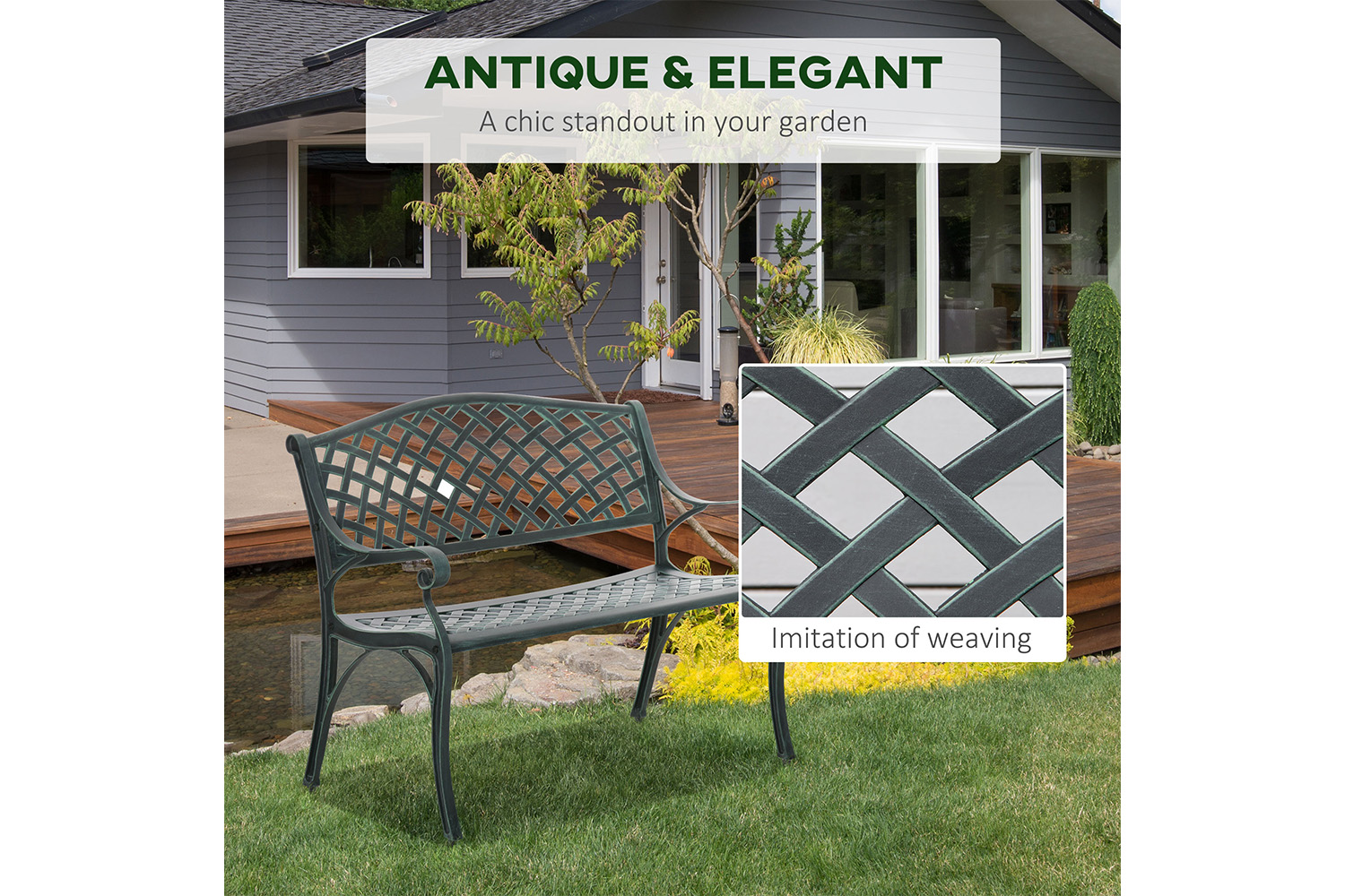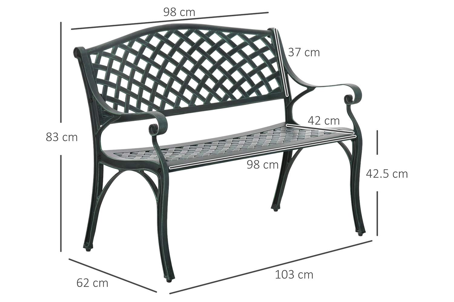 Sit back, relax and enjoy the summer with a friend and Outsunny. This park-style outdoor bench is like a loveseat for your lawn. Made of metal lattice patterns, it's a striking centerpiece for your front porch. Built to withstand weight, water, and weather, it was formed with a heavy-duty twice-coated aluminum frame. First, with a powder coating, then with a sealing paint, so it's double protected. With a high-rise back, curved seat, and enough armrests for two to sit comfortably.