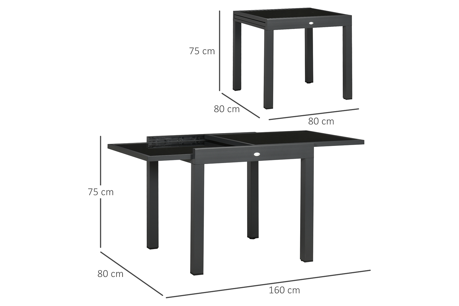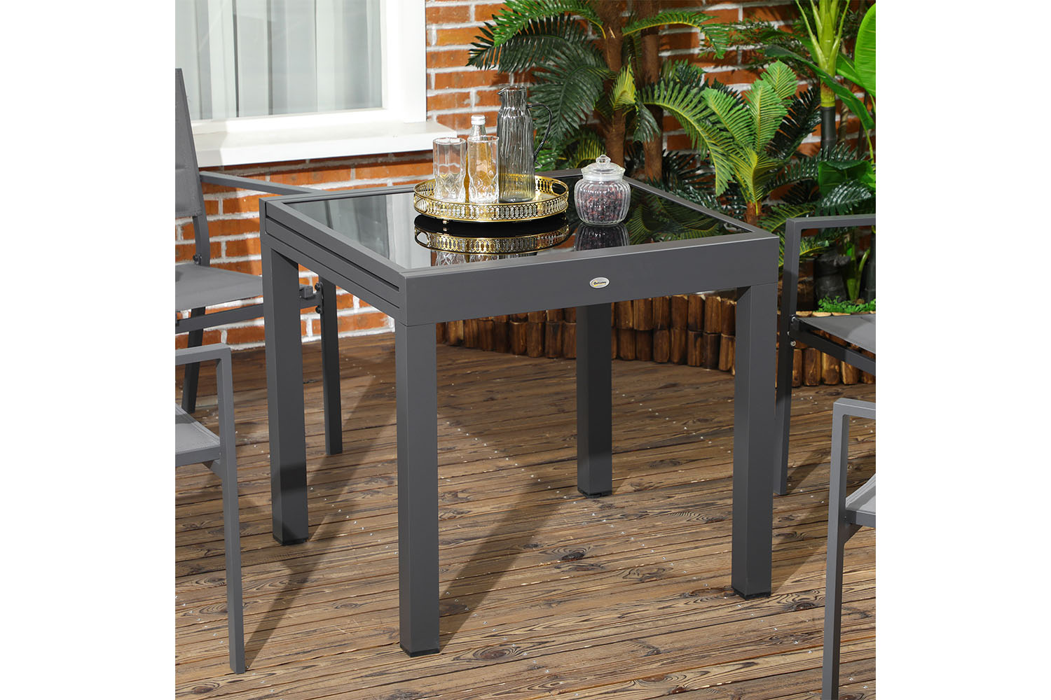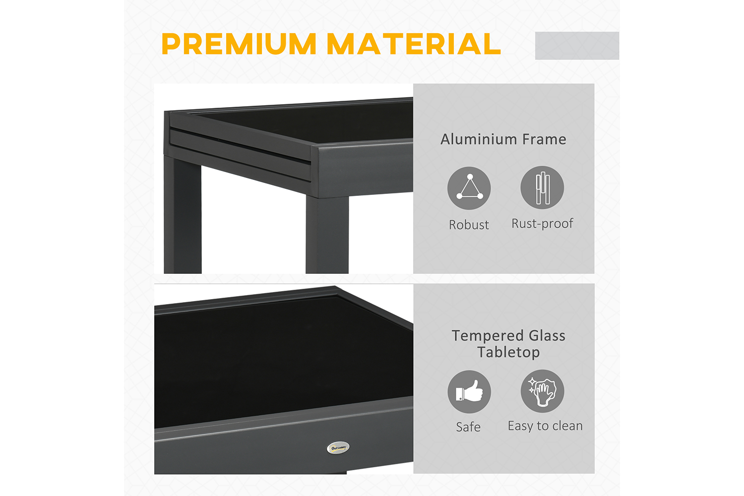 Want a place to put on backyard barbecues and cosy campfires? Like to read in the breeze? Need a table? Outsunny has a patio dining table to help you put on the picnic of your dreams. The sturdy aluminium frame with quality tempered glass table top is stable and easy to maintain. Also add enduring beauty, style, and grace to your environment with this essential part of any outdoor living space like the backyard, front yard, balcony, garden, or deck. Put some party into your patio with Outsunny.