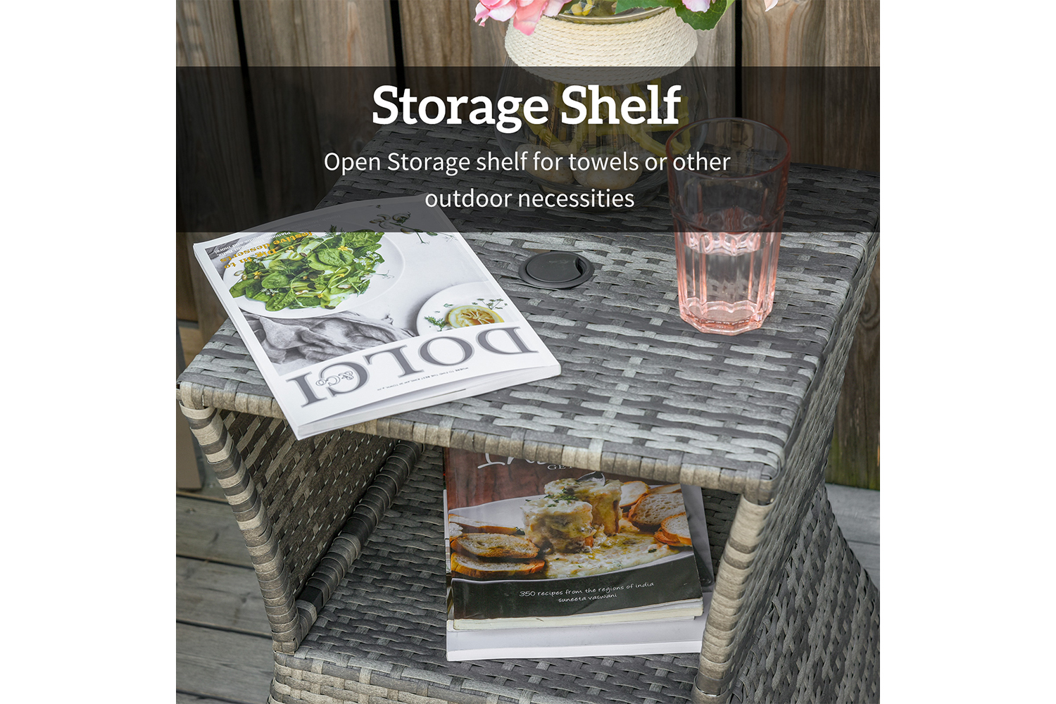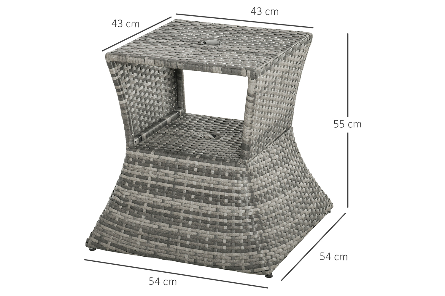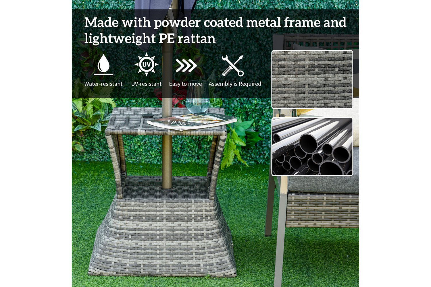 This PE wicker rattan patio table from Outsunny is a stylish and convenient complement for your outdoor furniture needs. With its contemporary shape, you can arrange it near your seating area to place snacks and beverages, or even use it as a stand for your garden. Made of environment-friendly PE rattan and a sturdy metal frame, it ensures years of reliable use. Best of all, the table features a center hole for placing an umbrella allowing you to relax in the shade.