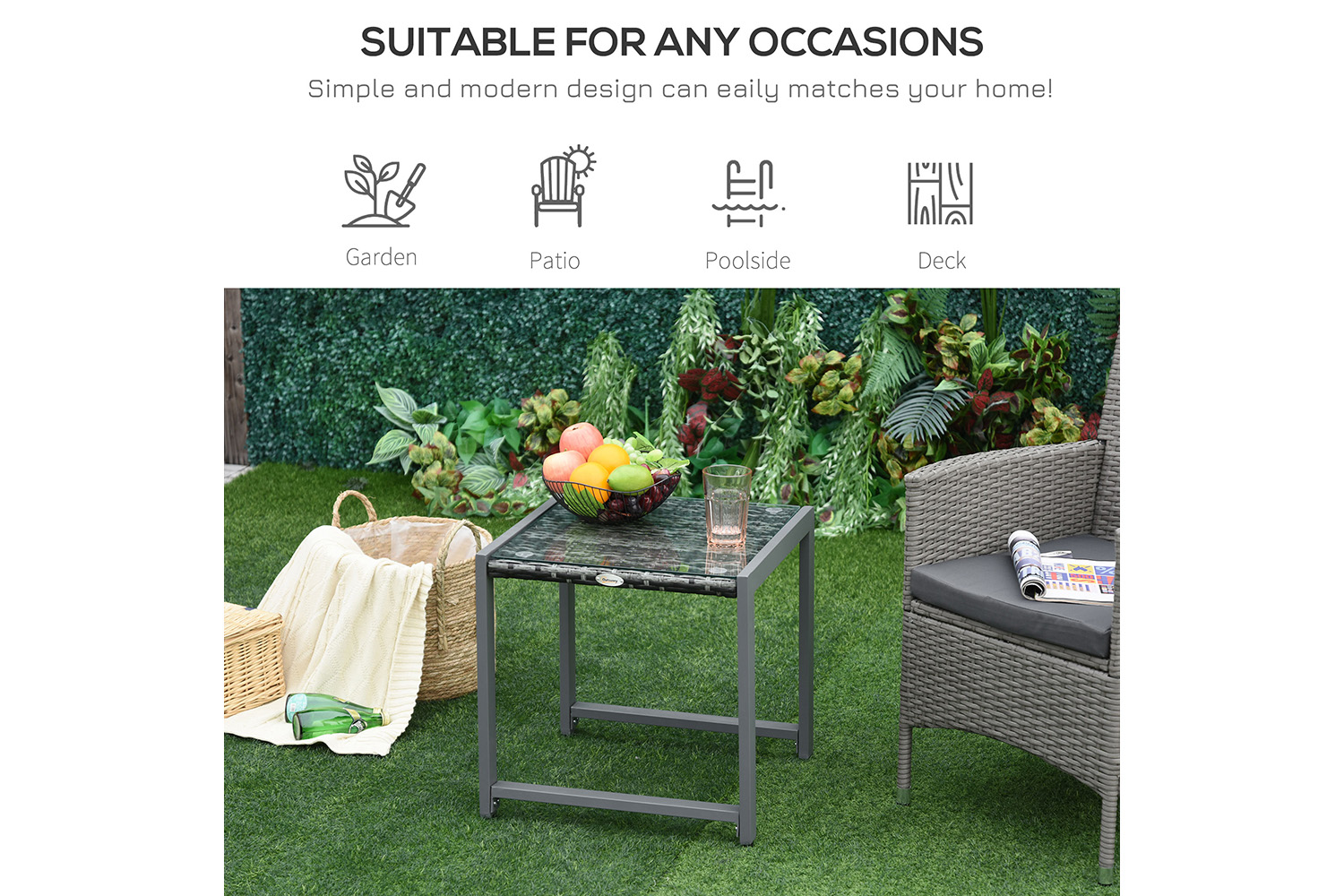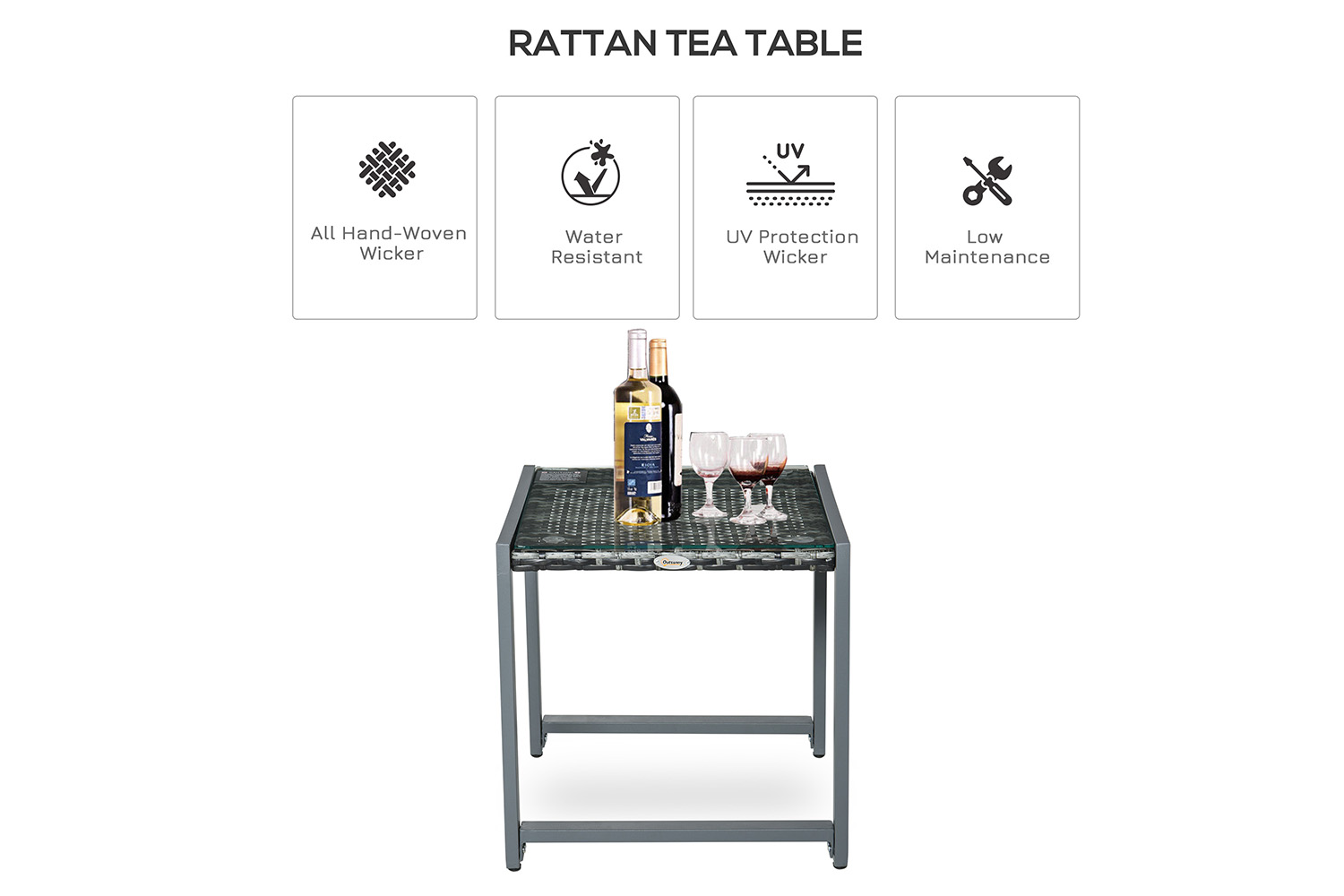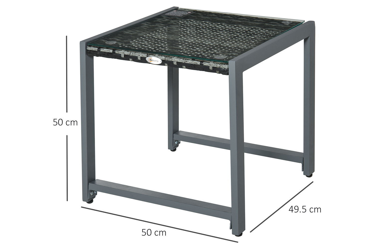 This patio table from Outsunny is perfect for dining and relaxing outdoors. Made from PE wicker in a soft grey tone, it is weather resistant and low maintenance, with an aluminum frame underneath for extra strength and stability. Sitting on the top, the large and sleek tempered glass panel provides plenty of room for keeping drinks, food and more. It is finished with adjustable pads on the feet to keep the table stable at all times and it goes perfectly with Outsunny matching chairs.