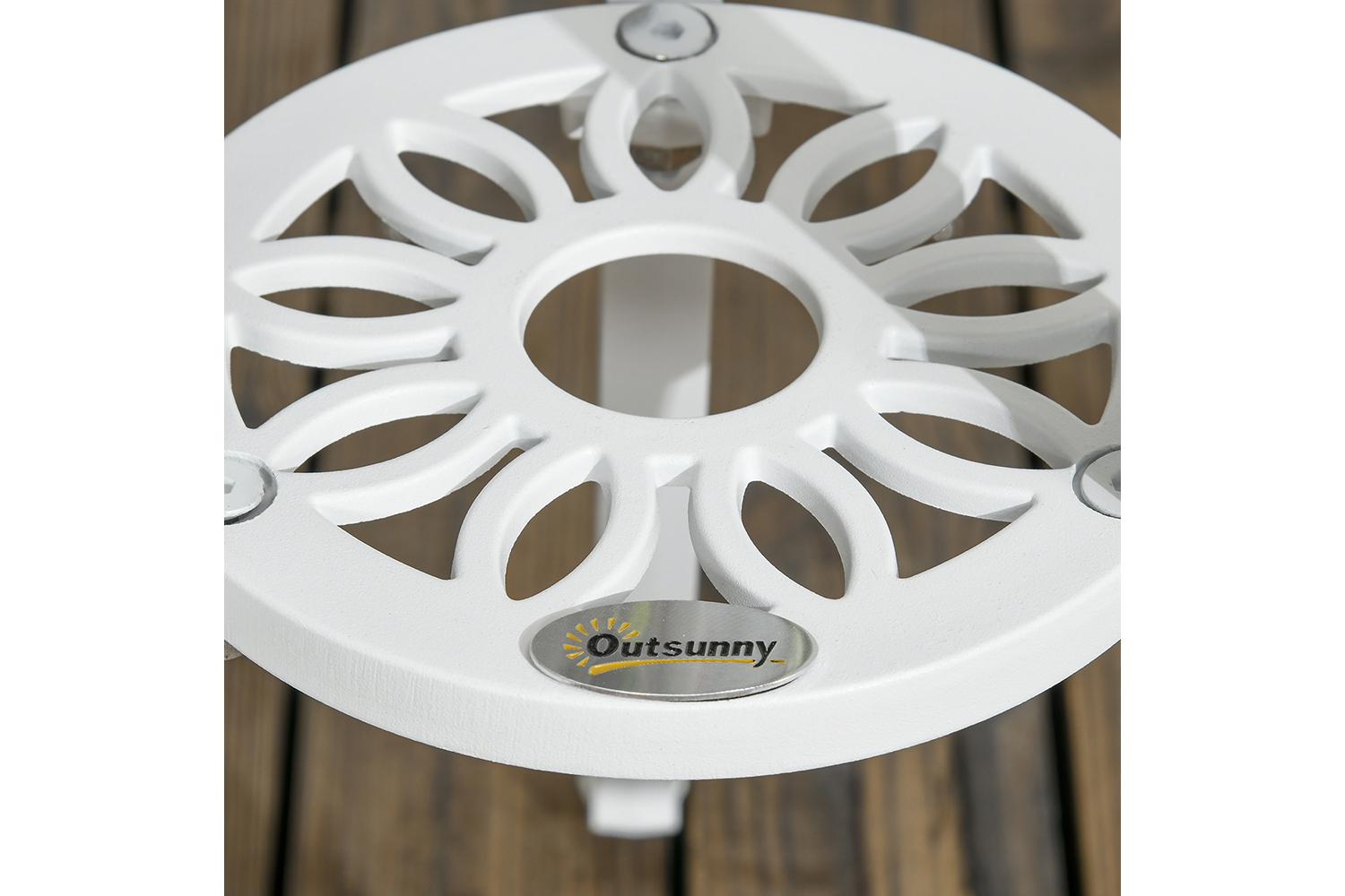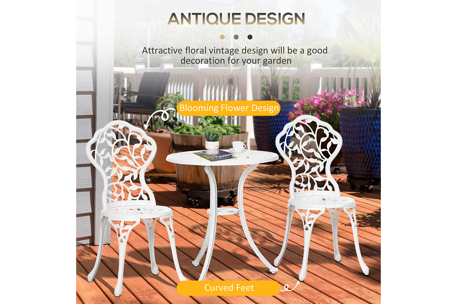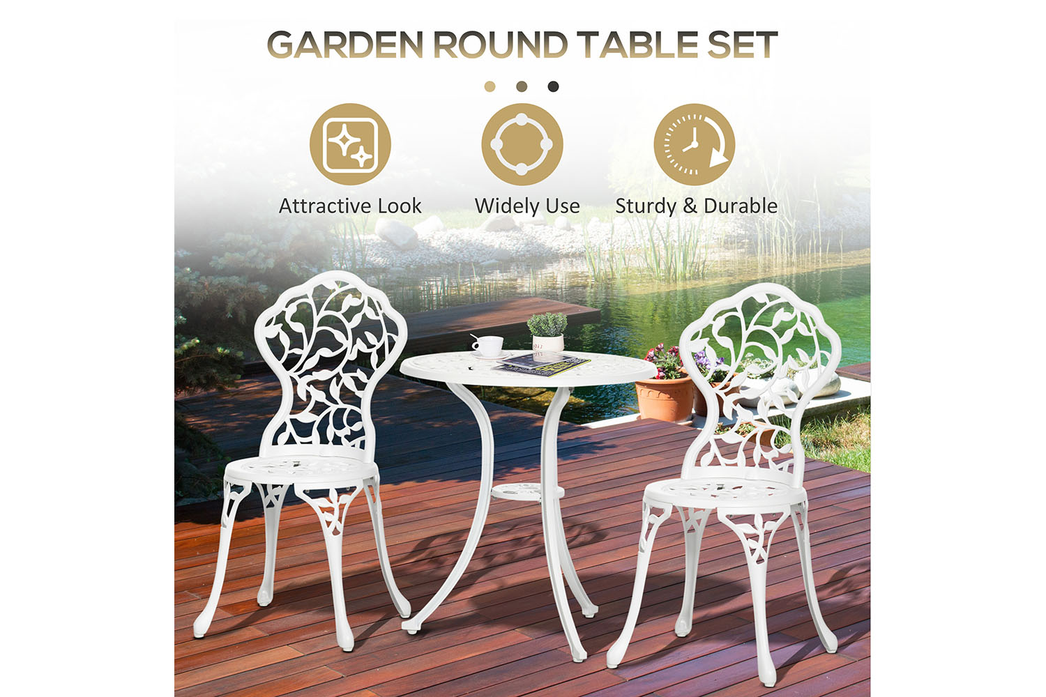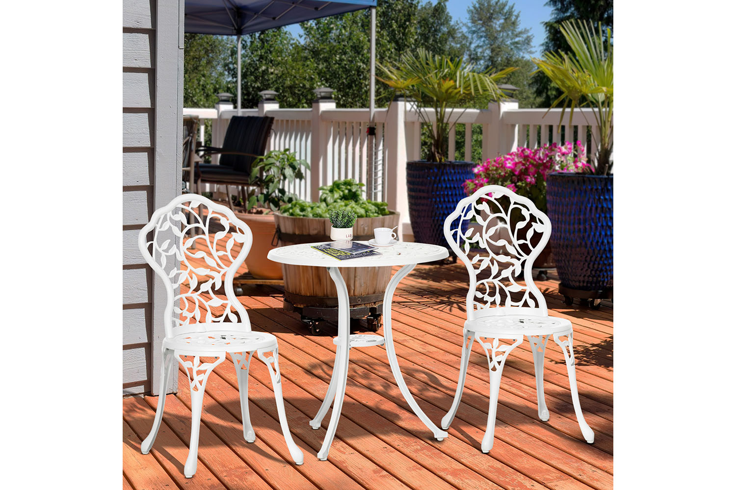 This Outsunny outdoor bistro set is for practically every outdoor space. The cut-out leaf design is pretty and elegant. Made from aluminium, the frames are strong, supportive you when you sit and relax. The metal is also resistant to peeling and corrosion for prolonged wear. Two chairs and a table mean you can gather round with company, wherever you choose to.
