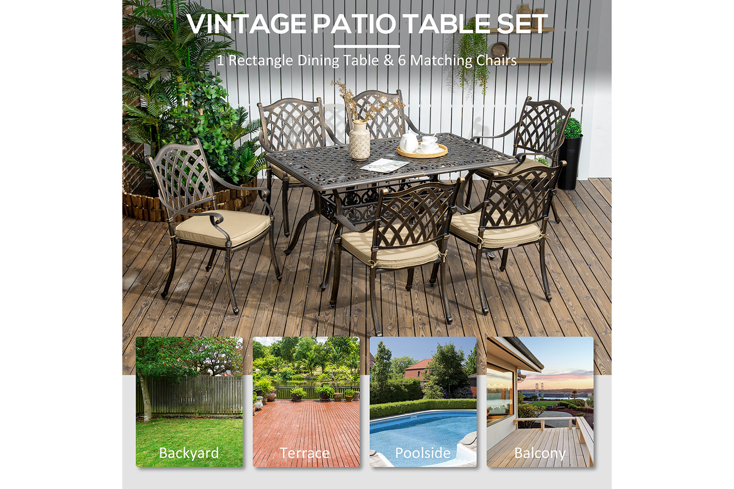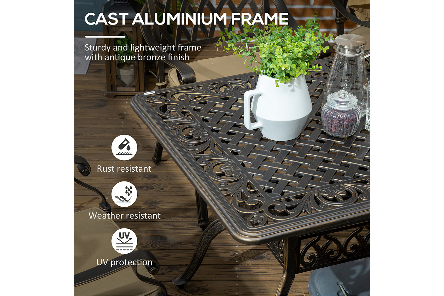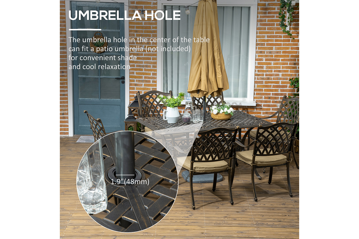 The garden table and chairs set includes six chairs and matching table with an umbrella hole - you've got everything you need to dine and relax with family and friends. Cast aluminium structure makes all pieces strong and sturdy, suitable for plenty of outdoor use. The seats come with cushions for comfort; their curved backs and arms offer body support. Place your parasol in the middle table hole to keep protected from glaring sunlight.
