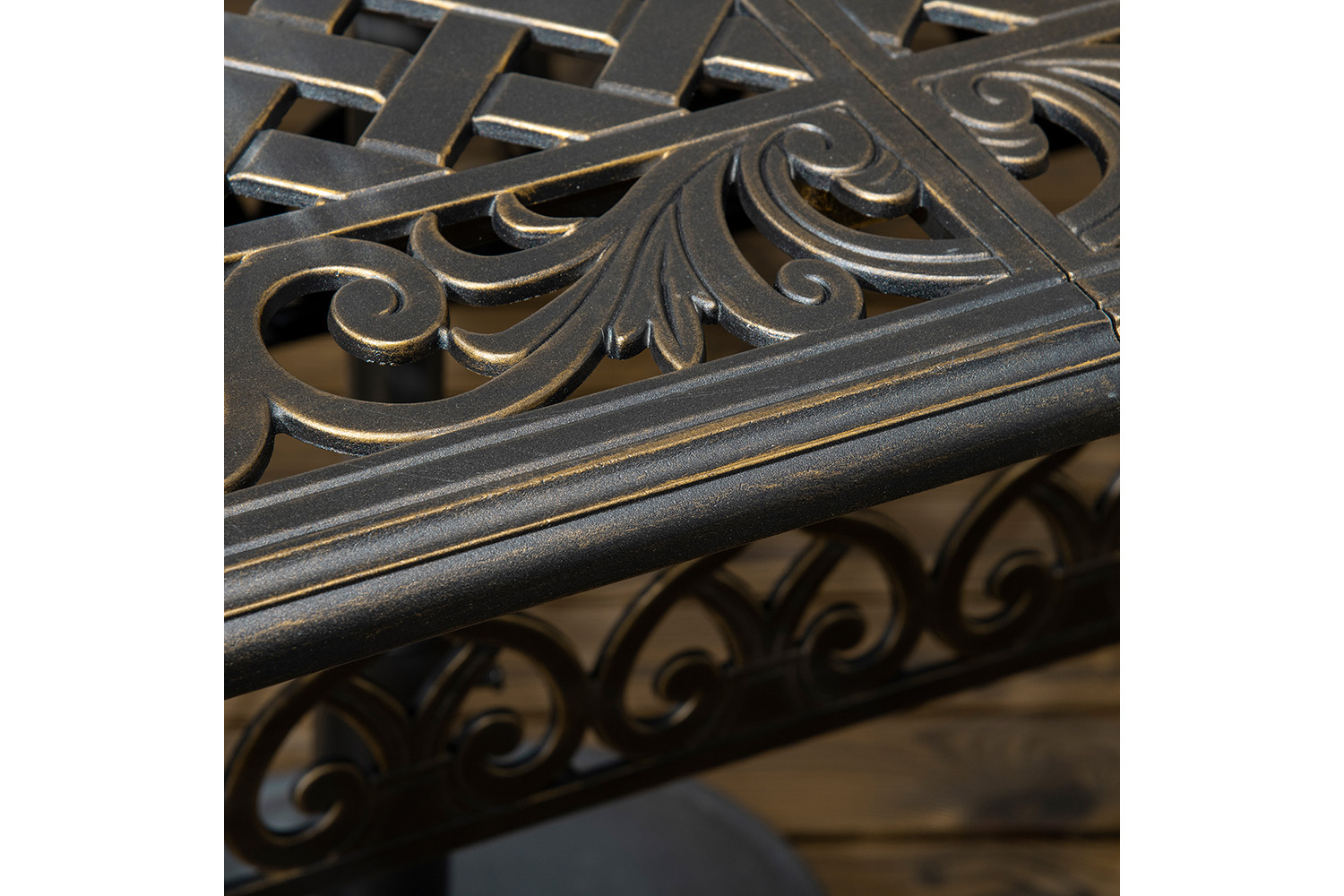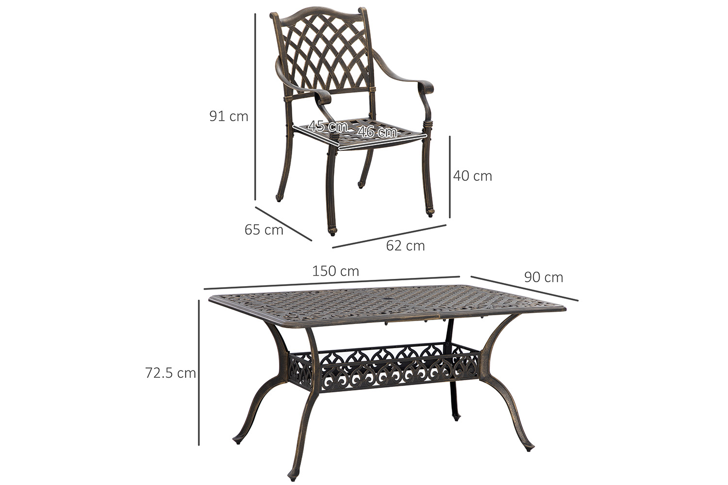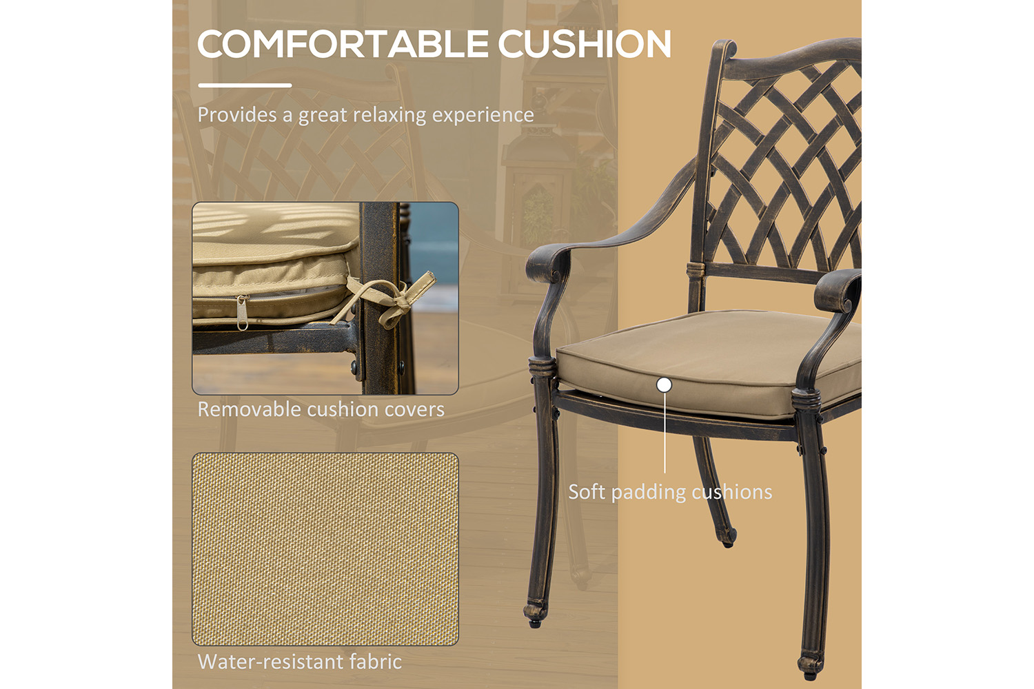 The garden table and chairs set includes six chairs and matching table with an umbrella hole - you've got everything you need to dine and relax with family and friends. Cast aluminium structure makes all pieces strong and sturdy, suitable for plenty of outdoor use. The seats come with cushions for comfort; their curved backs and arms offer body support. Place your parasol in the middle table hole to keep protected from glaring sunlight.