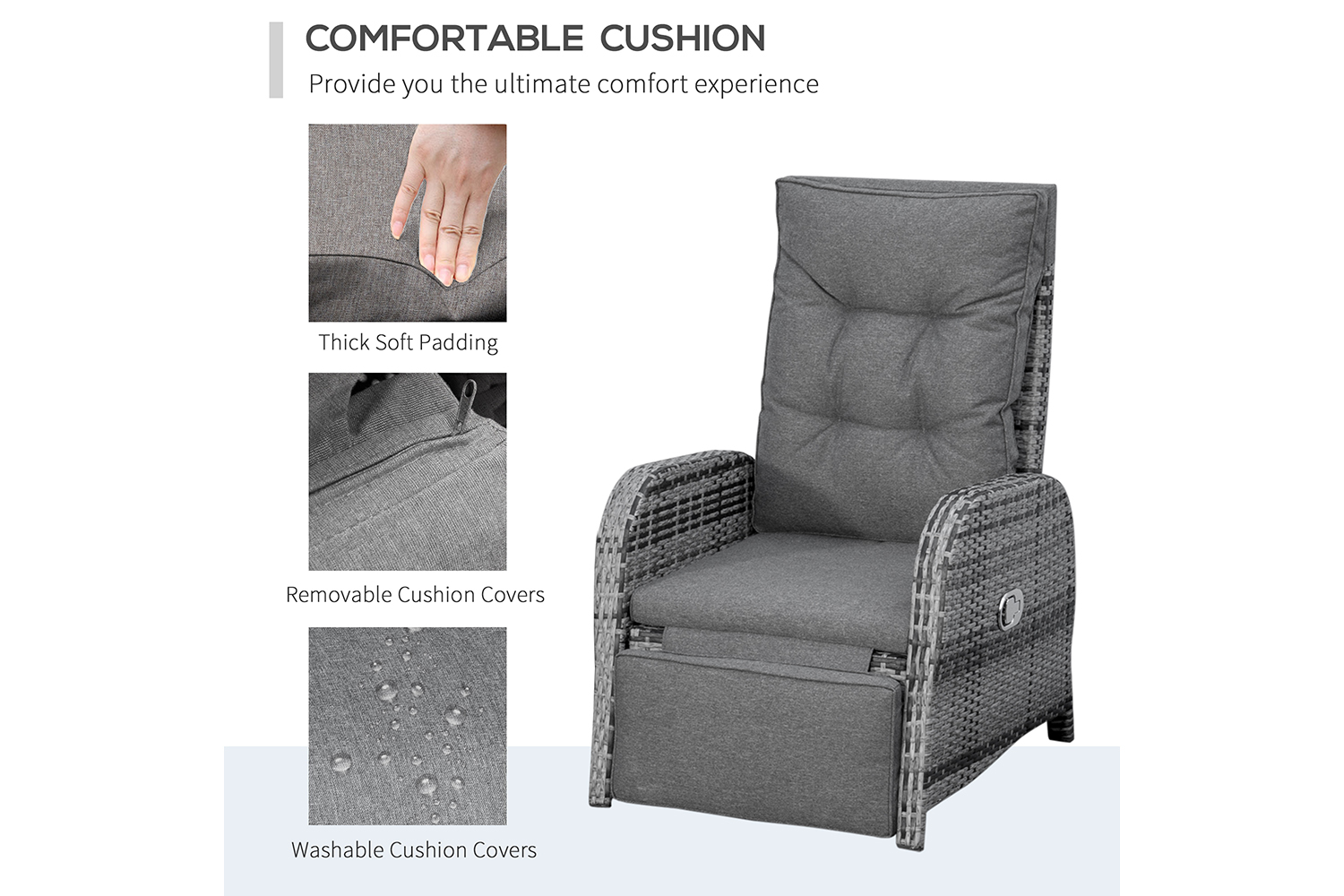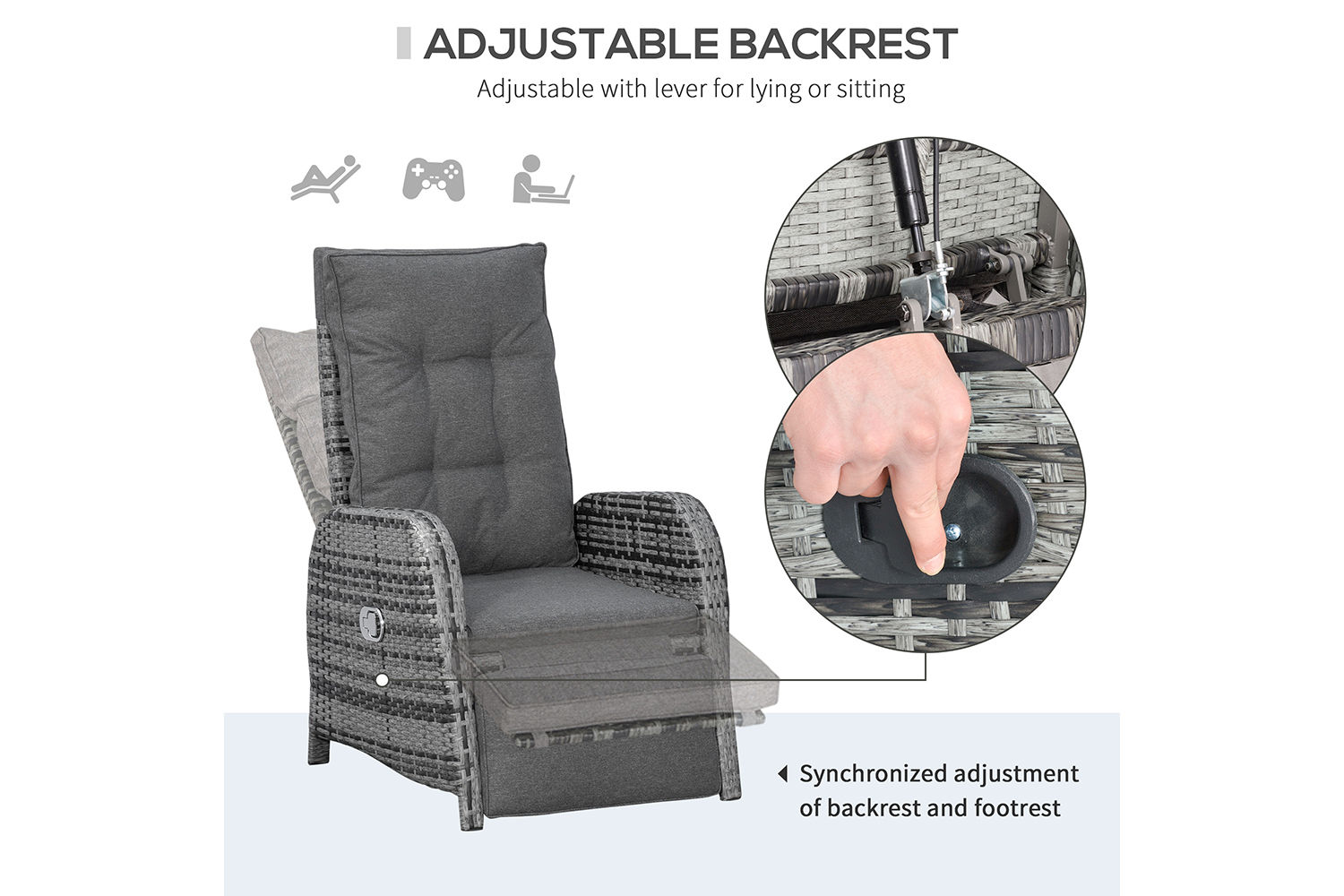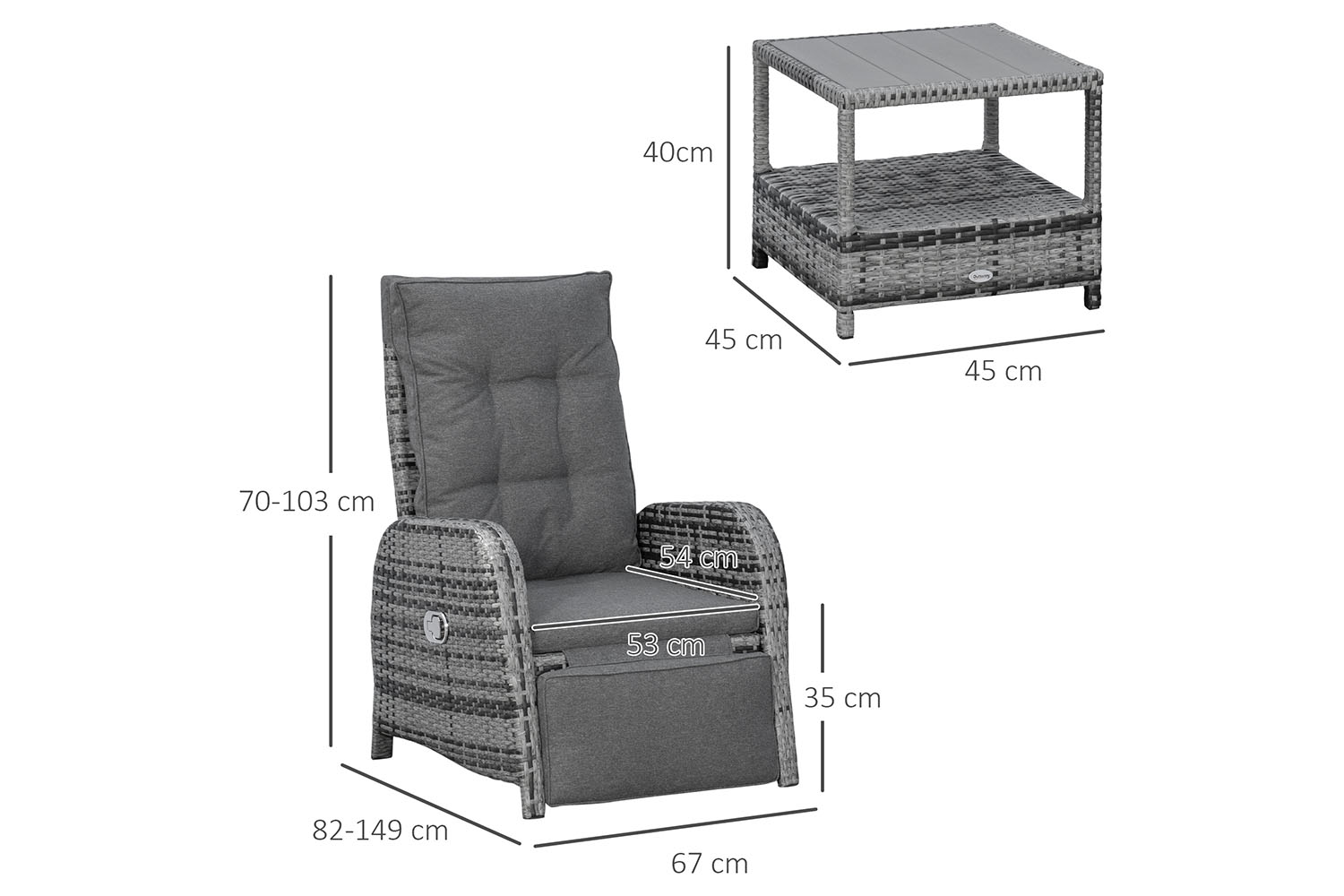 Your time spent relaxing outdoors just got so much better. Bring this seating set from Outsunny into the garden and beyond for unrivaled comfort. Formed of three pieces – two large reclining armchairs and a matching table. The main frame is made from aluminium so it's tough and supportive, with each piece wrapped in PE rattan to ensure strength and protection against the elements. Each chair reclines back to a maximum angle, and the footrest lifts up too. Both chairs come with seat and back cushions for comfort. A must-have set now the warmer days are fast approaching.