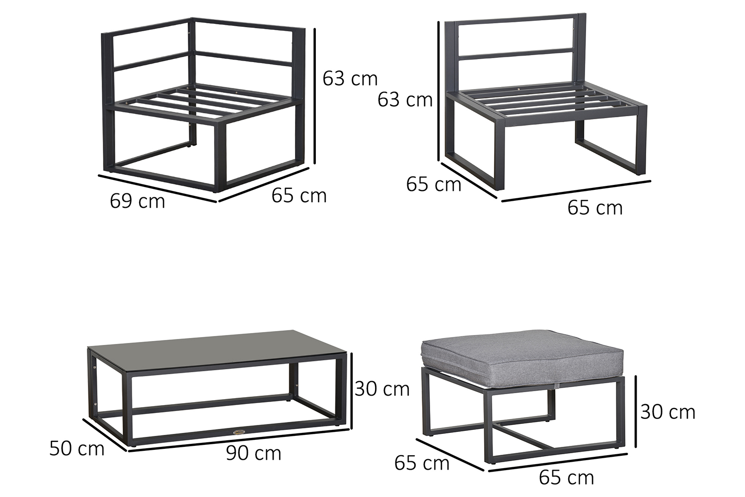 Understatedly stylish and extremely comfortable, this five-piece garden sofa set has it all. Includes an armless chair, two corner chairs, a footrest and coffee table. Padded cushions and pillows on the seats and back for comfort, with removable and washable covers for hygiene. With a tempered glass top, the coffee table adds a sleek finishing touch to the set. A fantastic addition for your garden and outdoor areas, you'll love inviting friends over to relax and dine with you.