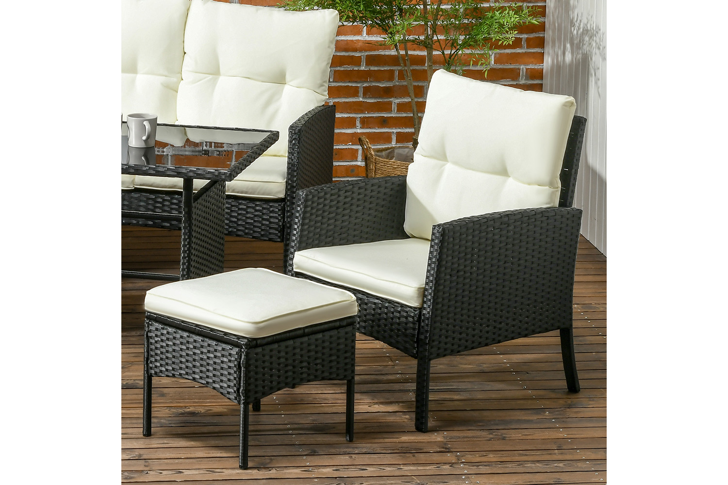 Your best company to gather round under the sun - say thanks to this Outsunny rattan garden sofa set. Each piece has a strong, powder coated steel frame, which is wrapped with plastic wicker - a stylish rattan look, which also protects the steel frame. Set comes with two armchairs, two footstools, a three-seater sofa and a matching coffee table. All seats and footstool come with padded cushions for comfort.