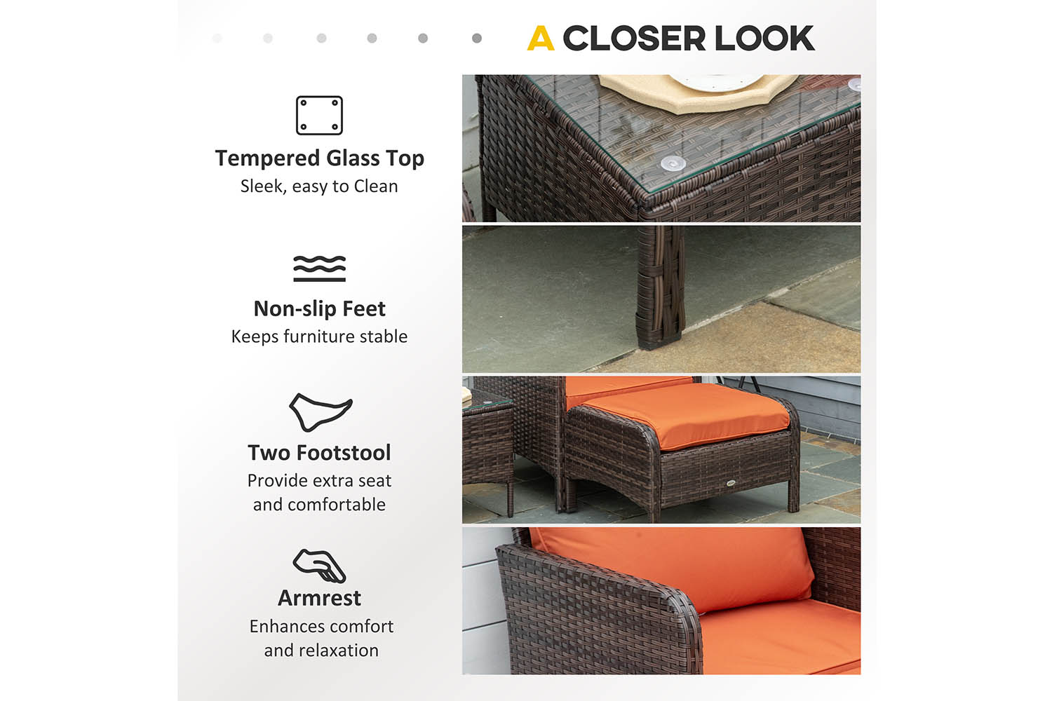 Sit back and relax in complete comfort with this rattan sofa set from Outsunny. Formed of five pieces, features two armchairs, two footstools and a matching coffee table. Made from hand woven PE rattan, with a steel frame underneath for extra support and stability. Thick padded cushions ensure you'll be relaxing comfortably for hours, You can put your feet on the footstool, or use it as an extra seat. This garden sofa set is a fantastic combination, comfortable and minimal hassle.