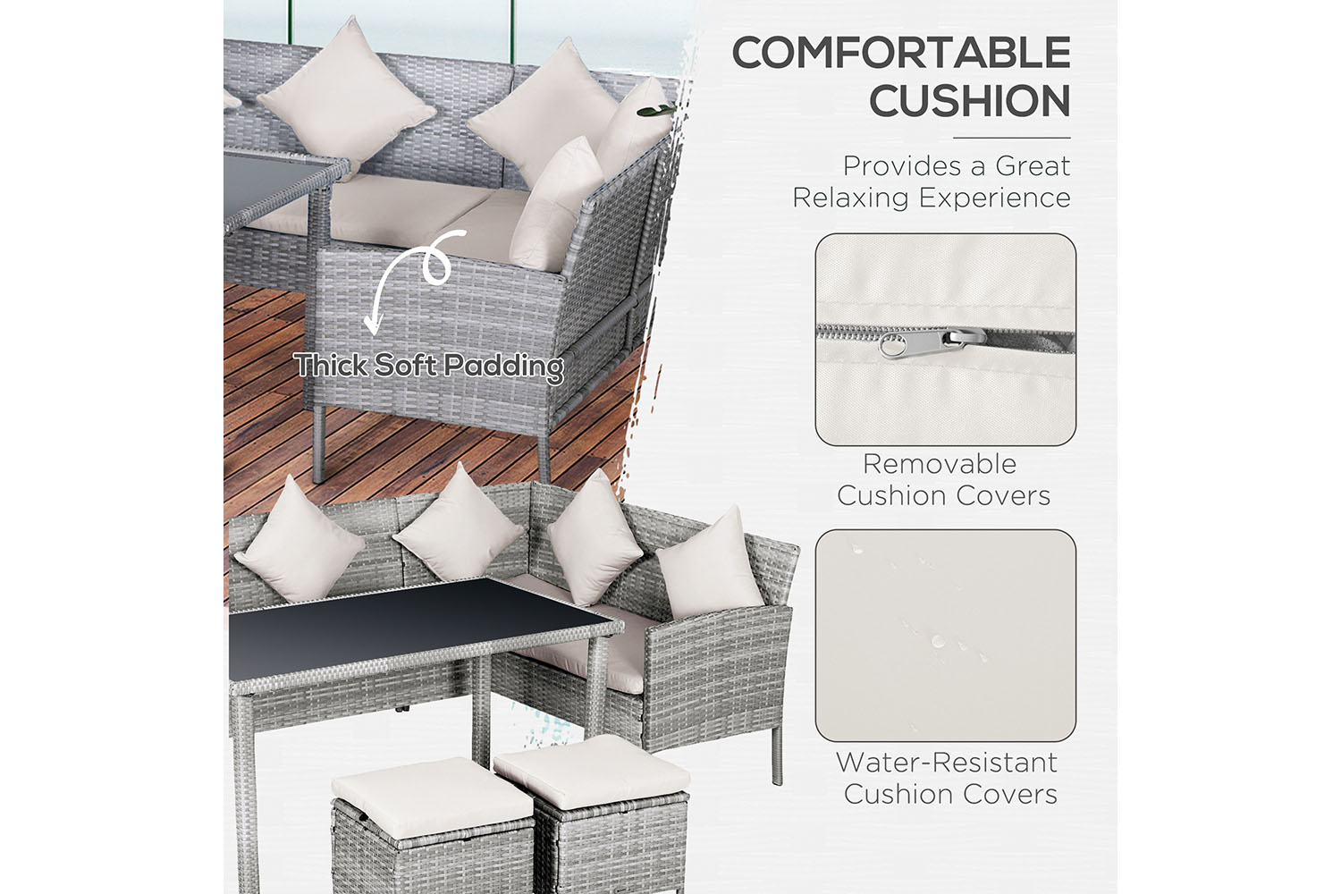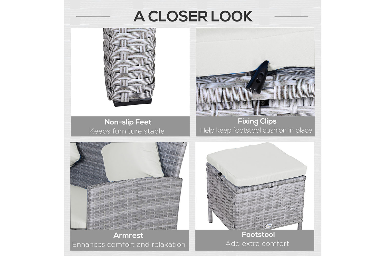 For an understatedly stylish and extremely comfortable garden and outdoor dining set, look to this five-piece rattan set from Outsunny. Featuring two 2-seat lounger sofa, 2 footstool and a matching long table. Built from PE rattan with a galvanised steel frame for support.You'll love inviting friends and family over when the sun comes out to shine.