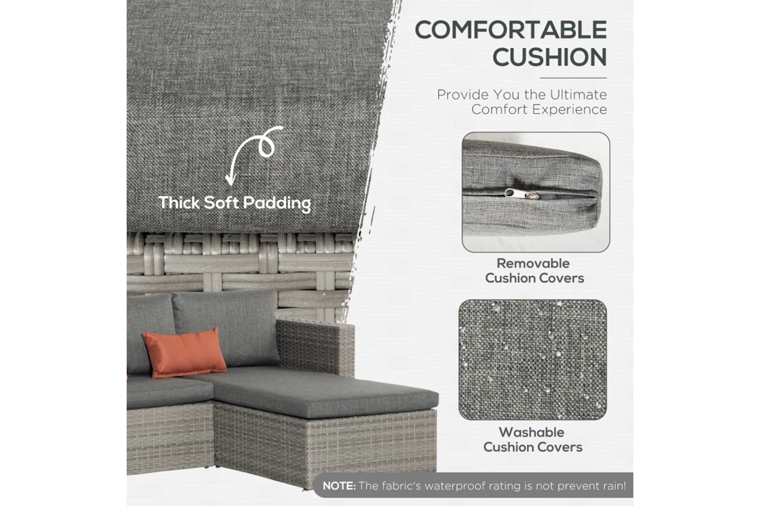- Soft padded seat and back cushions, two bolster cushions included. Removable and washable covers