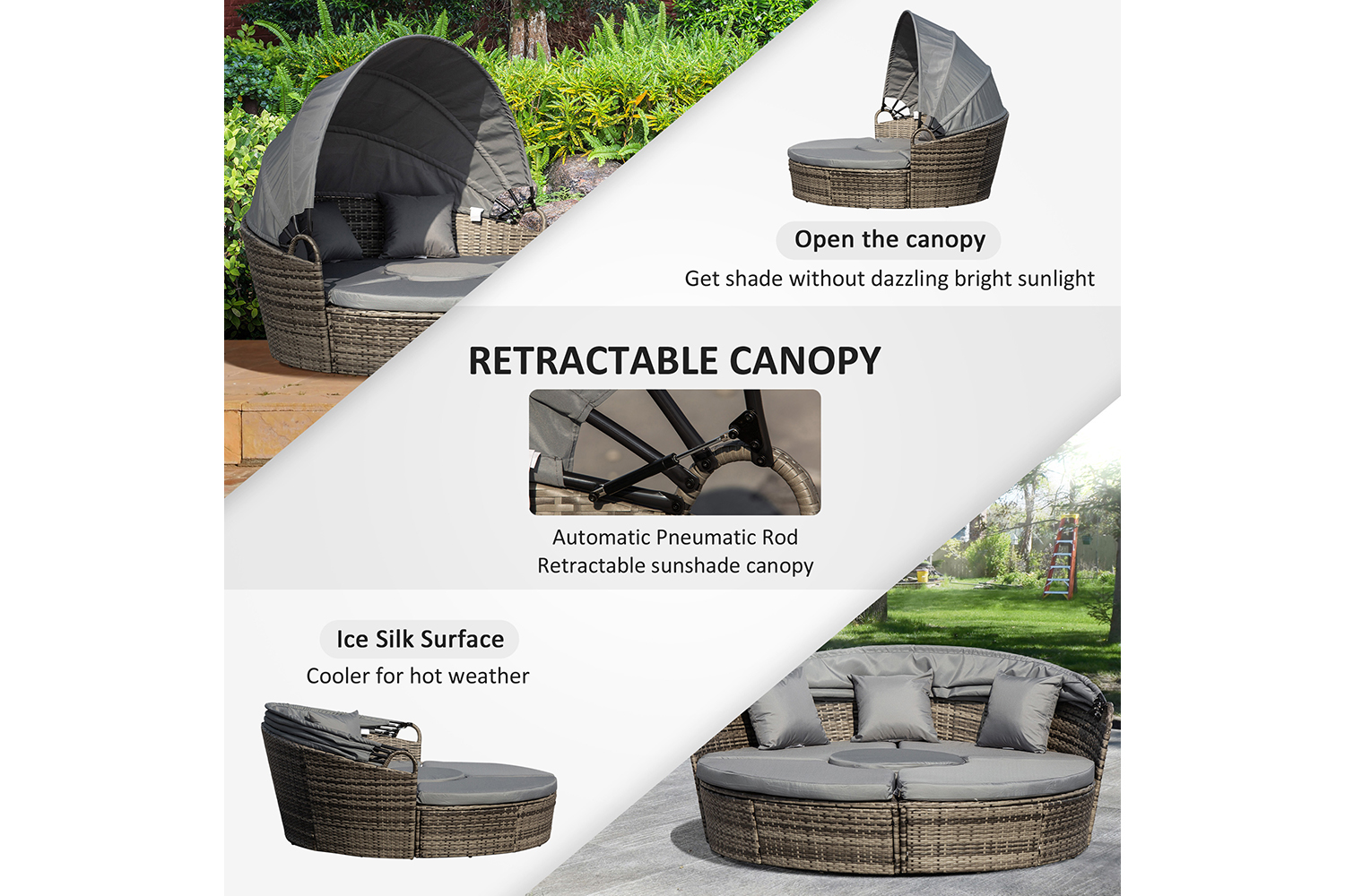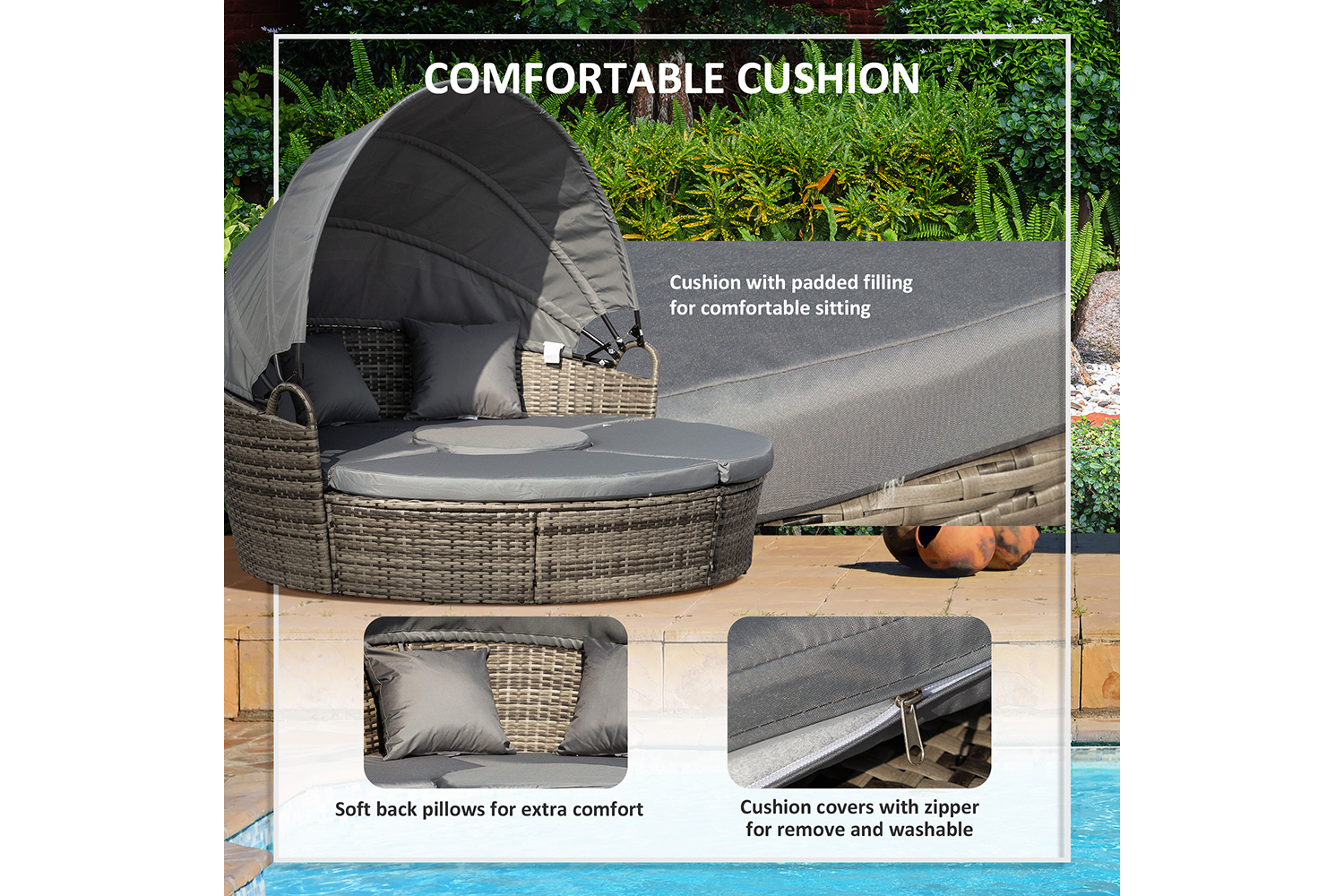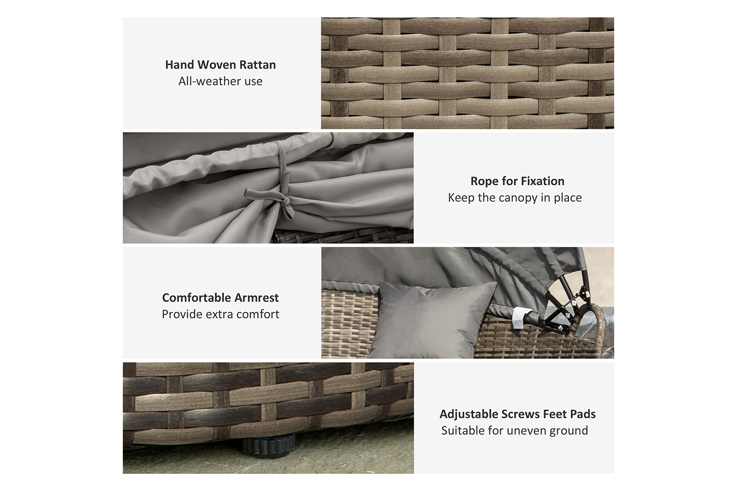 A hybrid of rattan loungers from Outsunny. The set include of two quarter round chairs, two quarter round chairs and a round table. Using metal as the base frame for a strong and sturdy structure, each piece is wrapped with PE rattan to provide a shield against light weather. Thick cushions on each seat of the rattan sun lounger are removable and washable covers, with a large overhead canopy completing this set to offer you protection from sun glare and wind. An innovative design to get out.