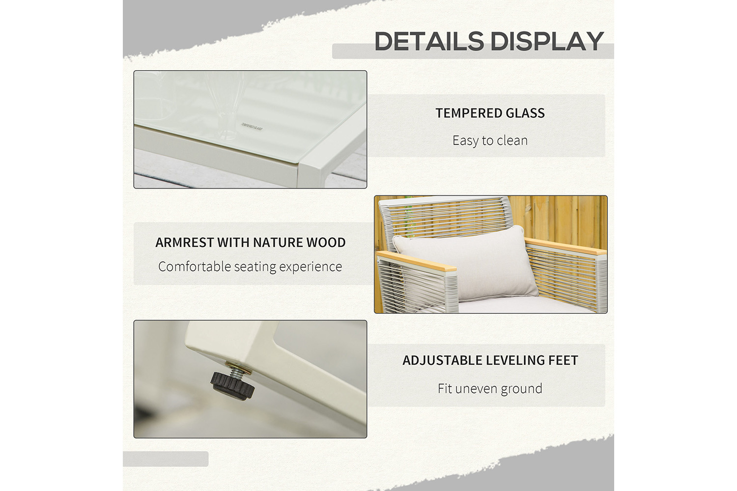 This 4 PCS PE rattan wicker patio sofa set from Outsunny is made of high-quality round PE rattan, with steel frame underneath. The rattan furniture has a modern look and feel, creating a raw aesthetic that fits in, perfect for indoor, outdoor patio, porch, poolside, and yard. Coffee table with wood grain ceramic tempered glass tabletop which is easy to clean and maintain. Start enjoying conversation and meals outdoors life with the Outsunny rattan set.