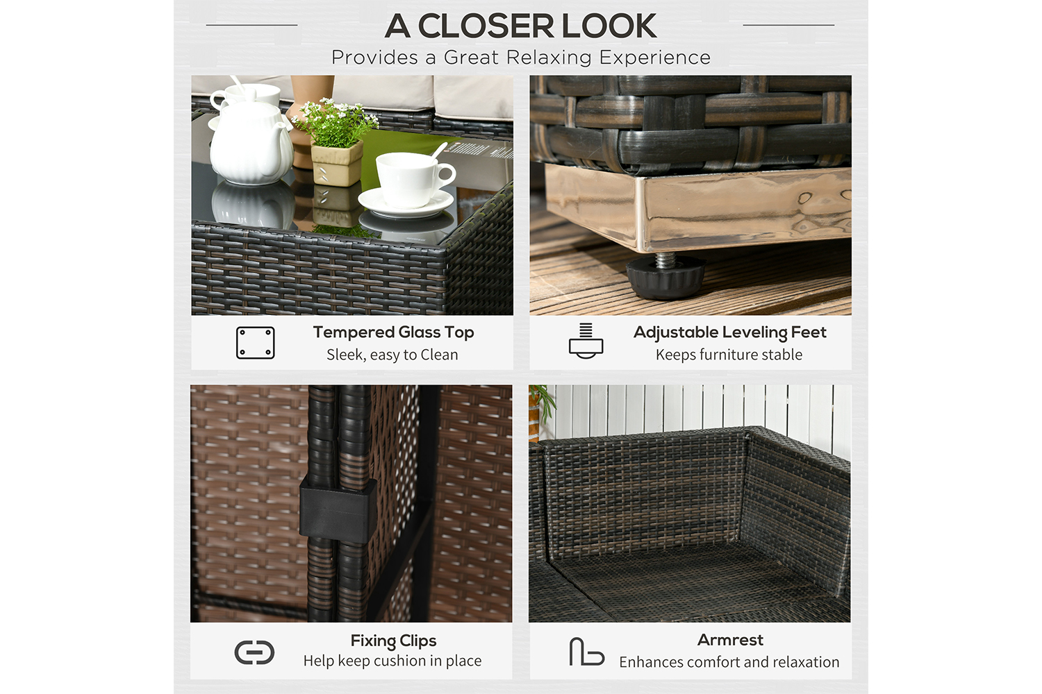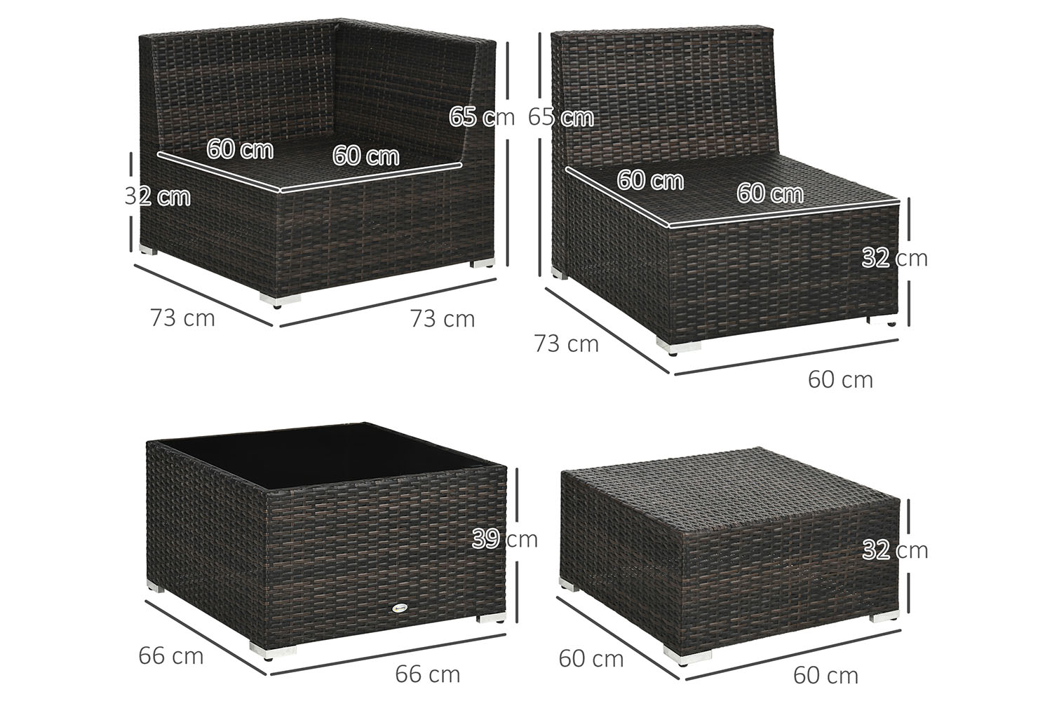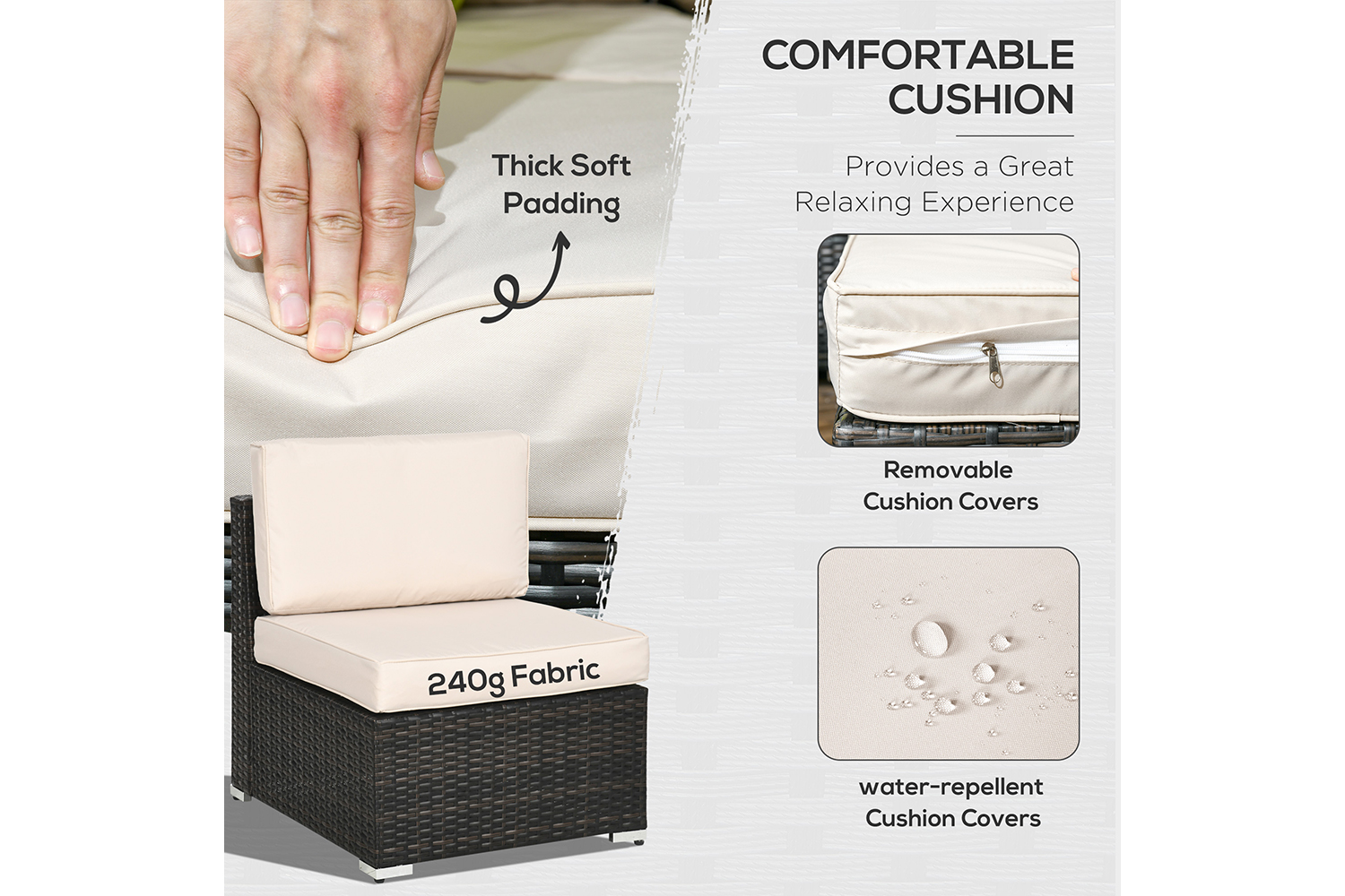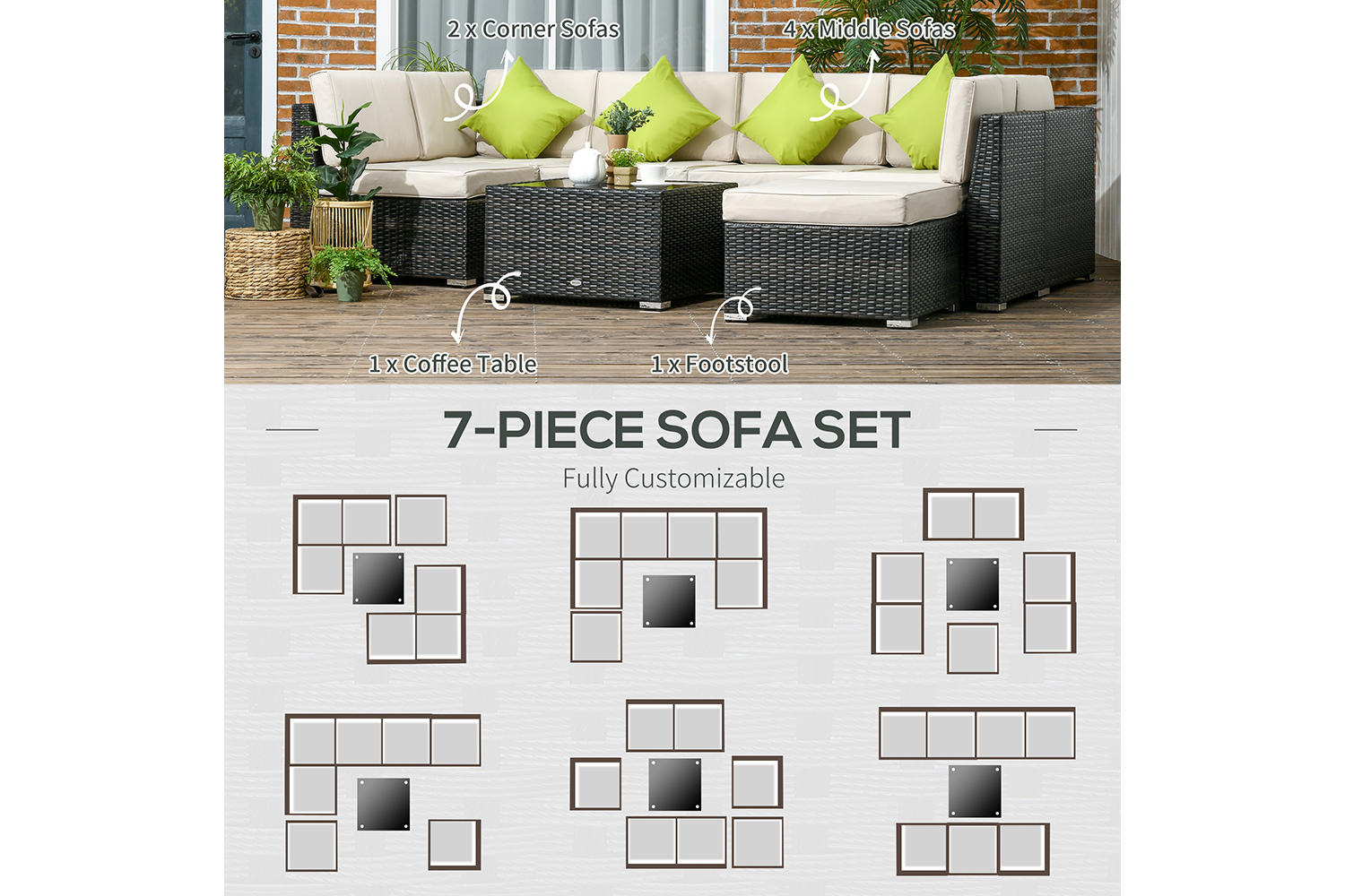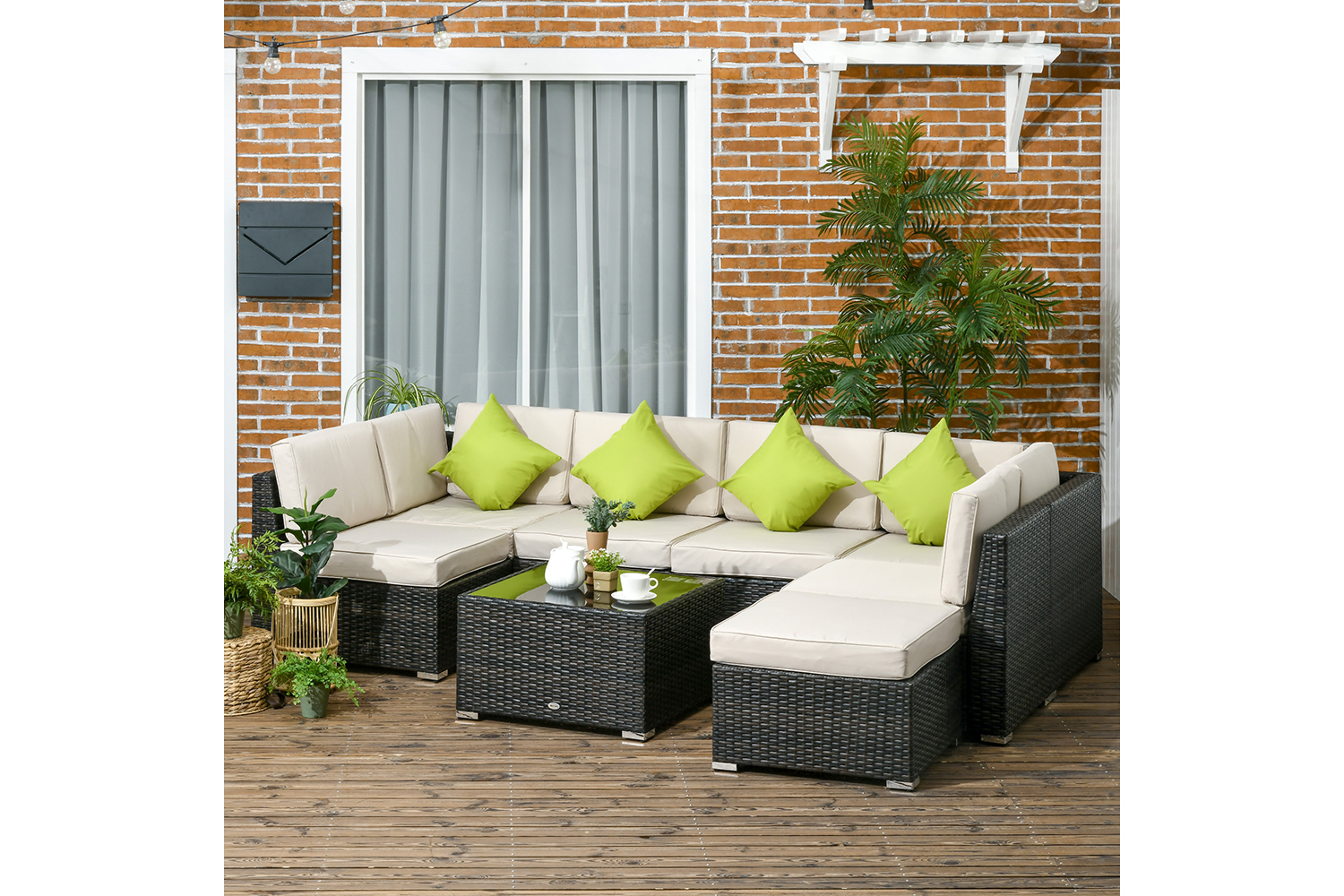 Make your garden stand out like never before. Say hello to this Outsunny garden corner sofa set. Each piece has a steel frame for strong support, wrapped in plastic wicker for double the durability; also creating a forever-stylish set for your outdoor space. Comes with two corner seats, four normal seats, a footstool and table - set up into a shape which you want. Padded cushions for comfort, with four coloured cushions for a touch of bold beauty.