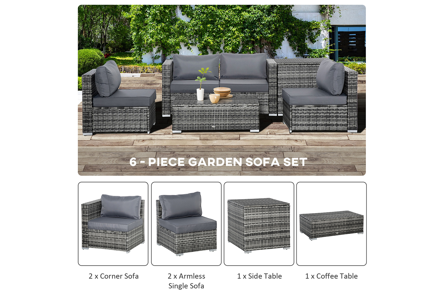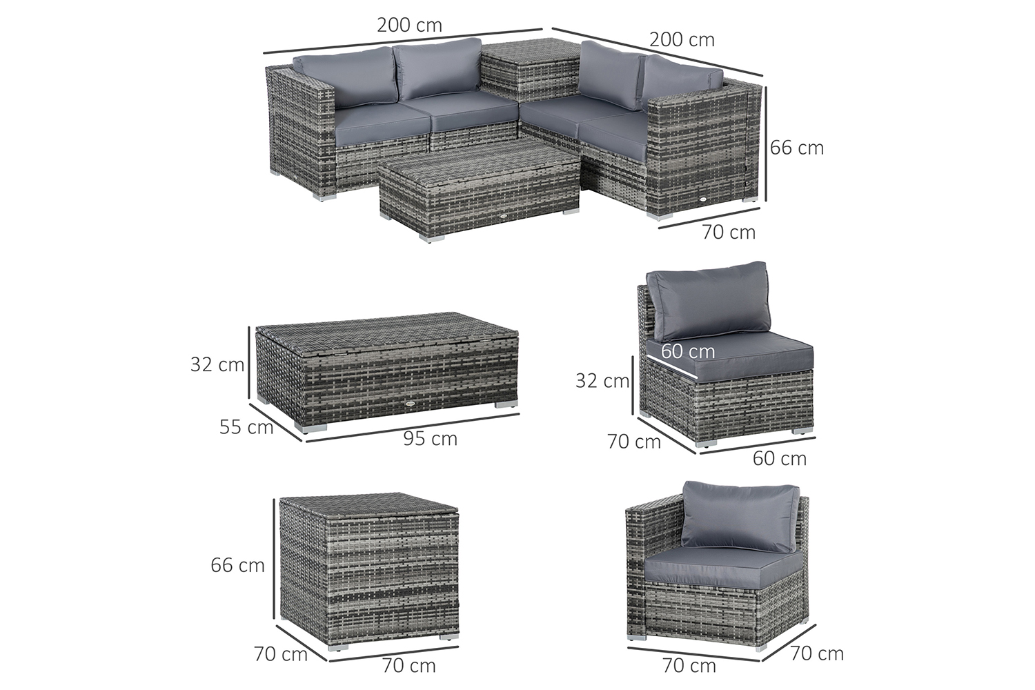 This Outsunny rattan set is a great addition to your outdoor living space, ideal for conservatories, patio or paved seating area. The set consists of 2 corner seats, 2 single seats a side table and a coffee table. All seats come with backrest and seating cushions. The set is constructed using a metal frame and covered with PE rattan, it has been designed so that it can be placed in different combinations if required, also the side table and coffee table have the ability to store items. The set is stylish and modern in design and will match any outdoor décor, a great set to have for entertaining and relax in your outdoor space.