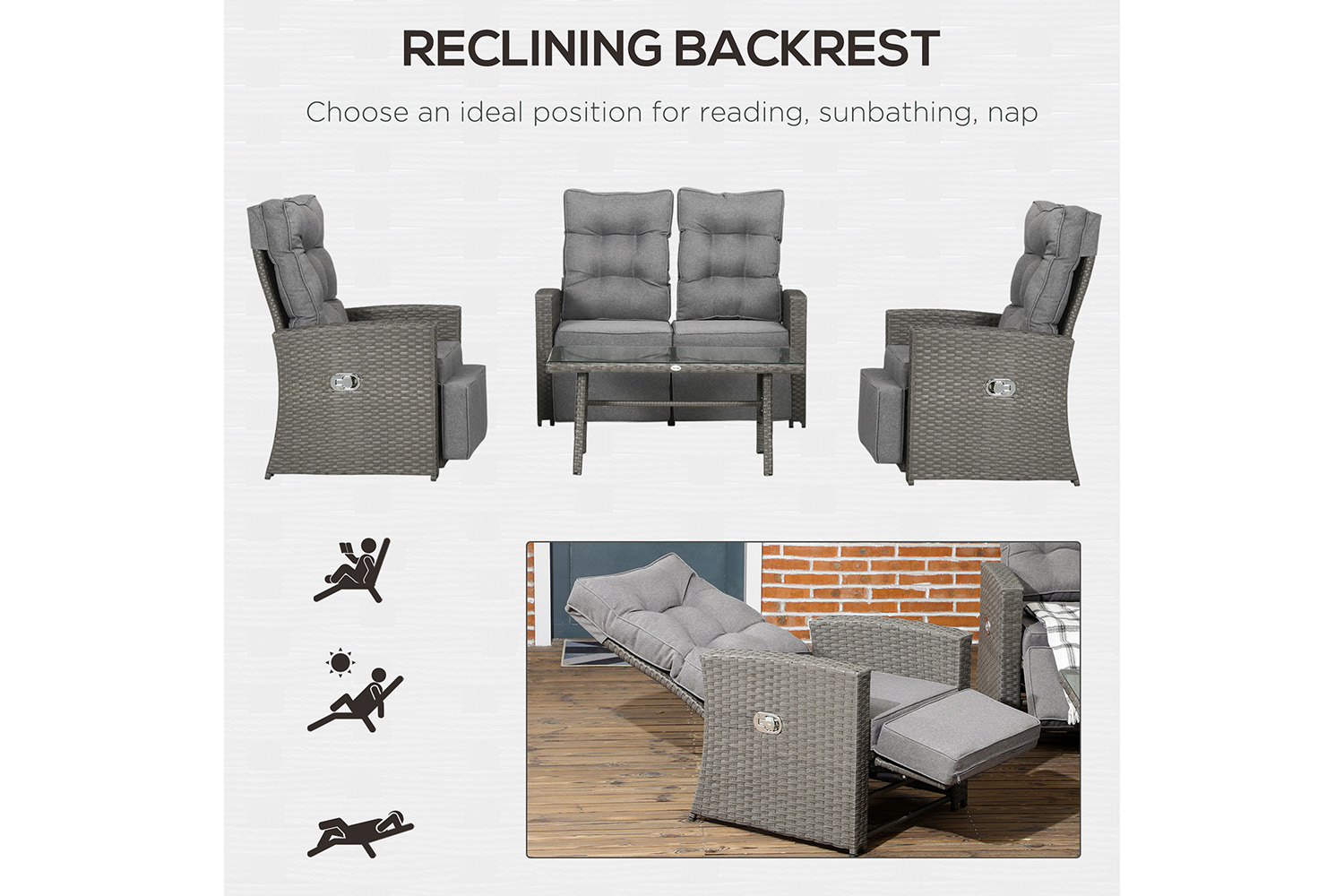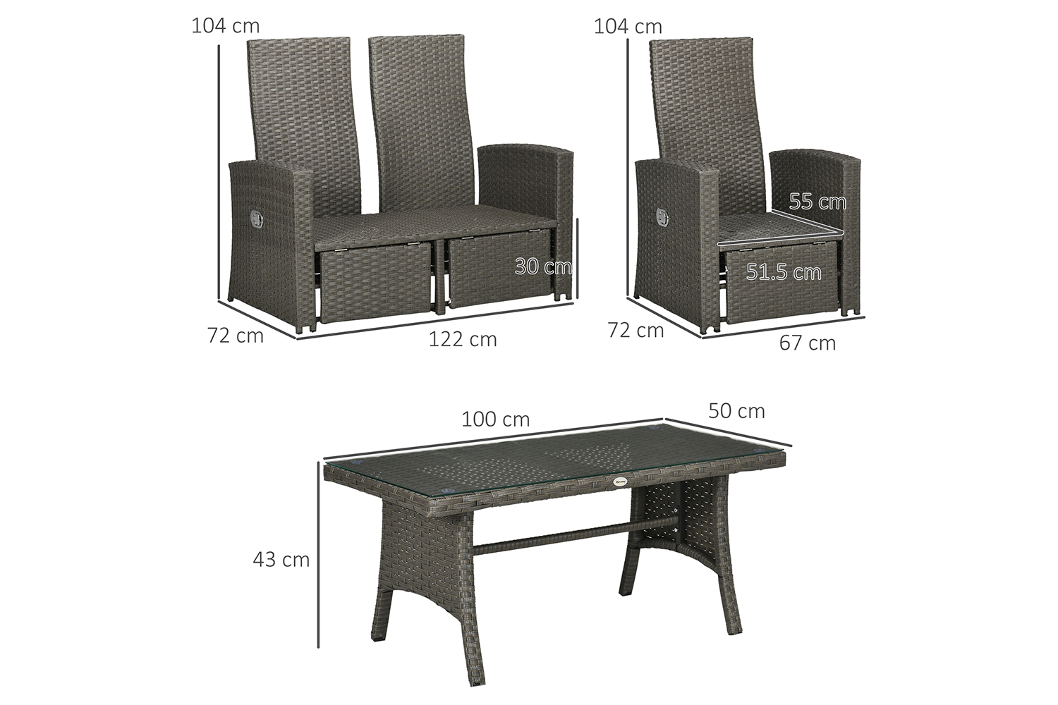 An inviting outdoors, this season and beyond: say hello to this Outsunny rattan furniture set. All pieces have a galvanised steel frame for a strong core, wrapped in plastic wicker for double the durability - and style, of course. The two armchairs have 90°-135° reclining backs - extra relaxing points scored! Seat and back cushions for comfort. Complete with a glass-top coffee table.