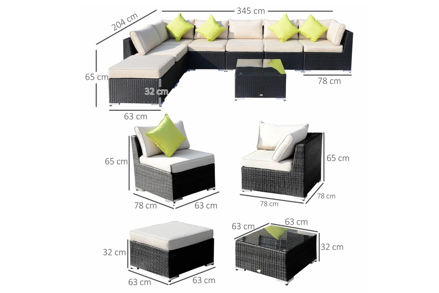 - Footstool: 63L x 63W x 32H cm