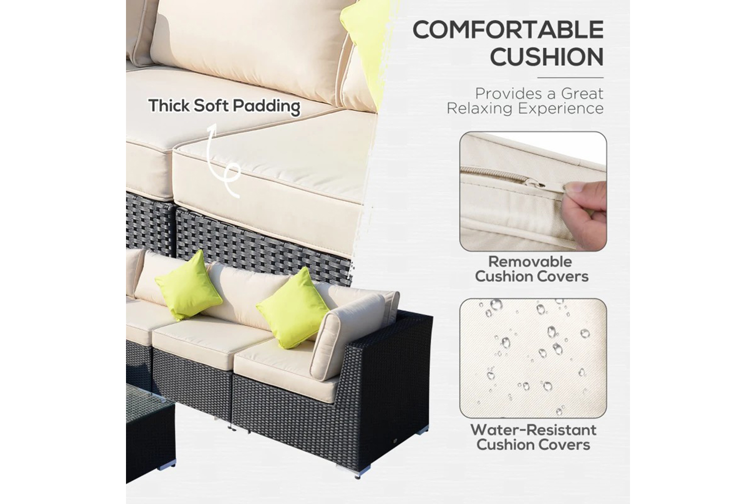 - Thick grey seat and back cushions to sink in and relax