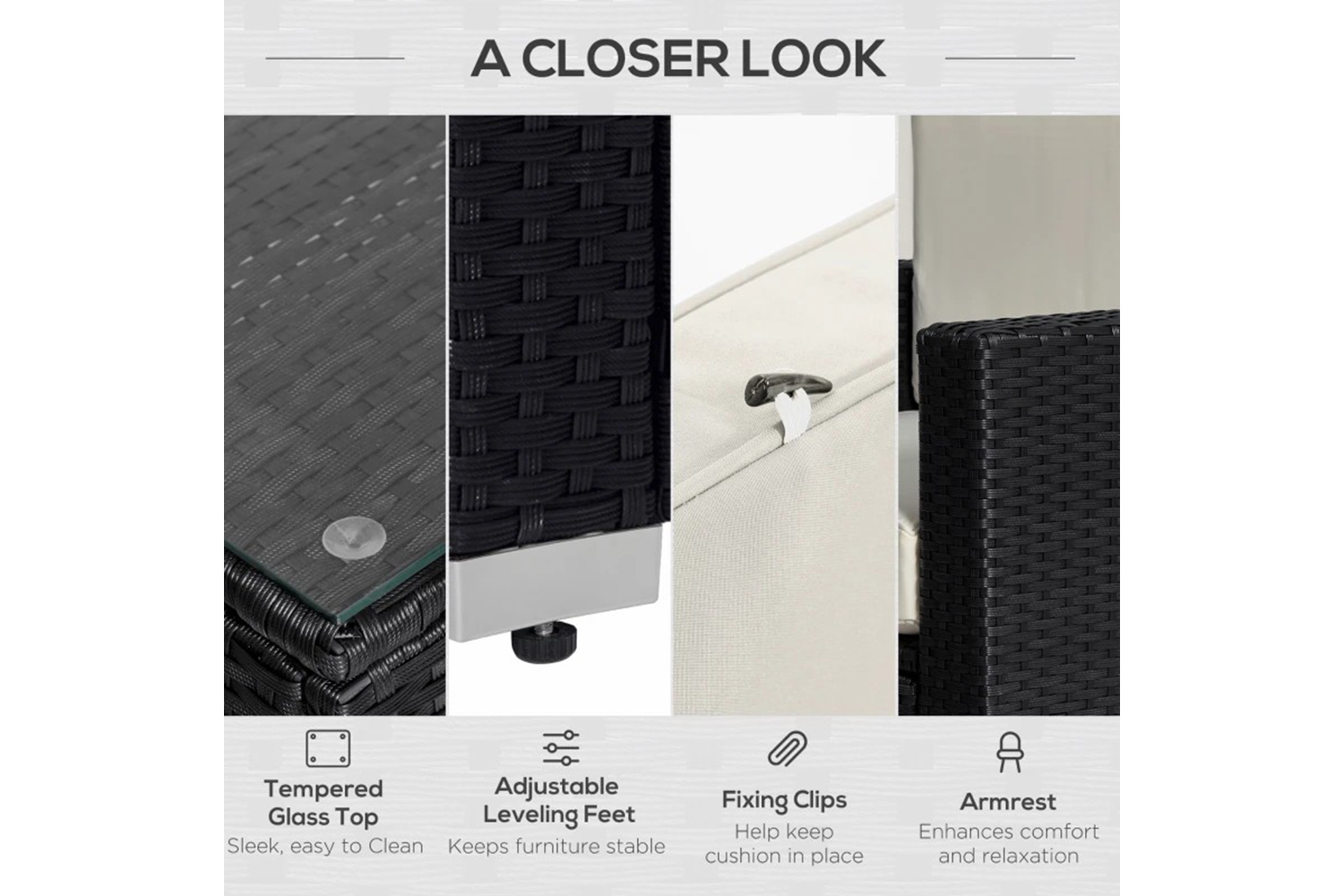Make your garden stand out like never before with this beautiful outdoor corner sofa from Outsunny. Using aluminum for the base frame of the garden sofa to create a long-term and stable structure, each of the eight pieces included (two corner seats, four normal seats, a footstool, and table) are wrapped in mixed-grey rattan to ensure strength of the conservatory furniture, with a smooth finish that can be wiped clean easily. Padded seats and back cushions provide comfort.