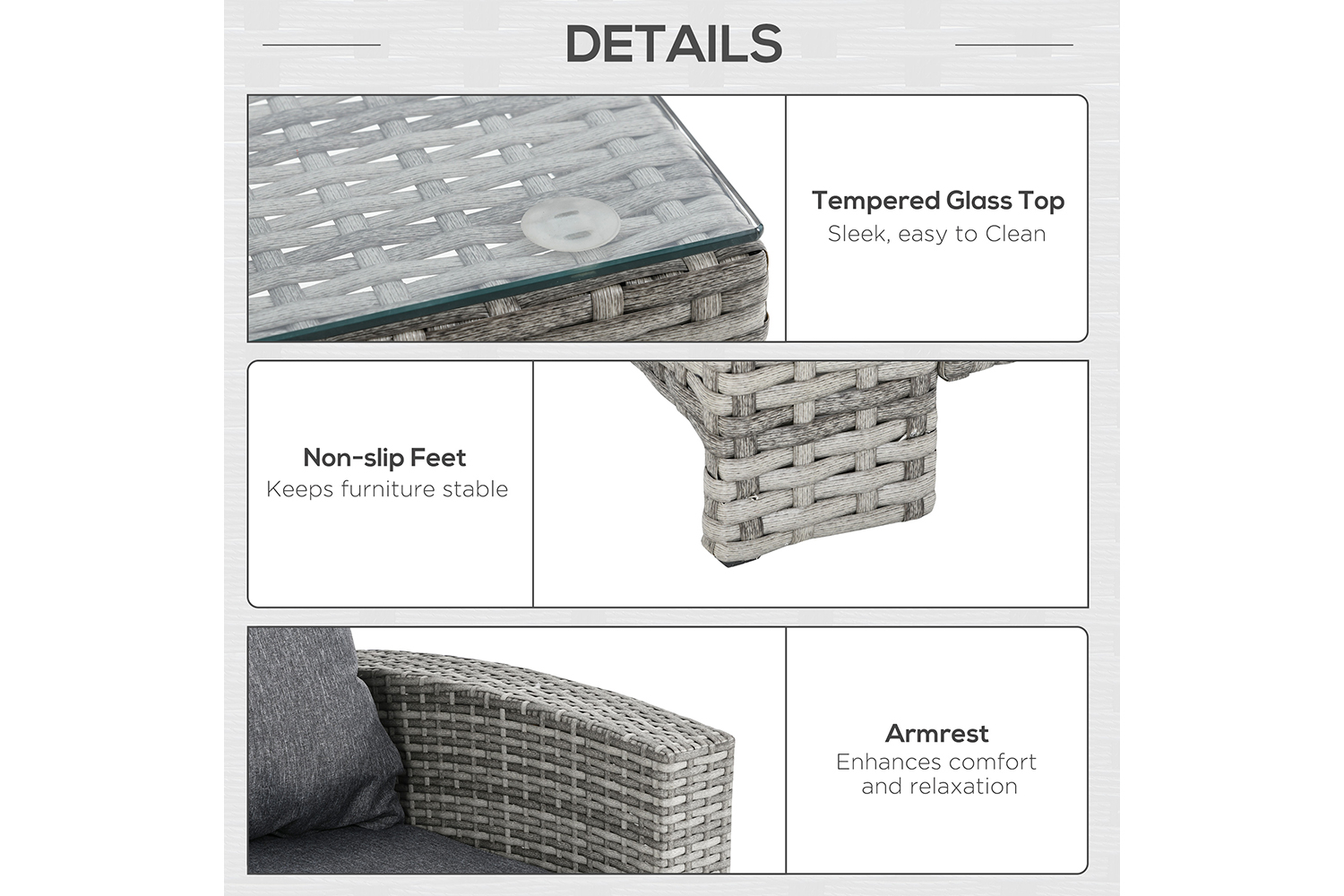 - Material used: PE rattan, tempered glass, aluminium pipe, polyester cloth, 25D sponge