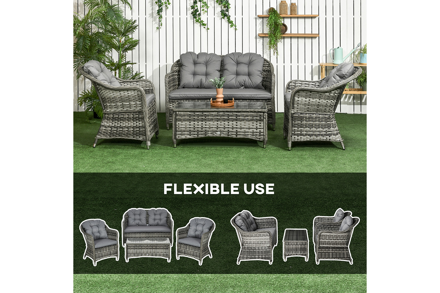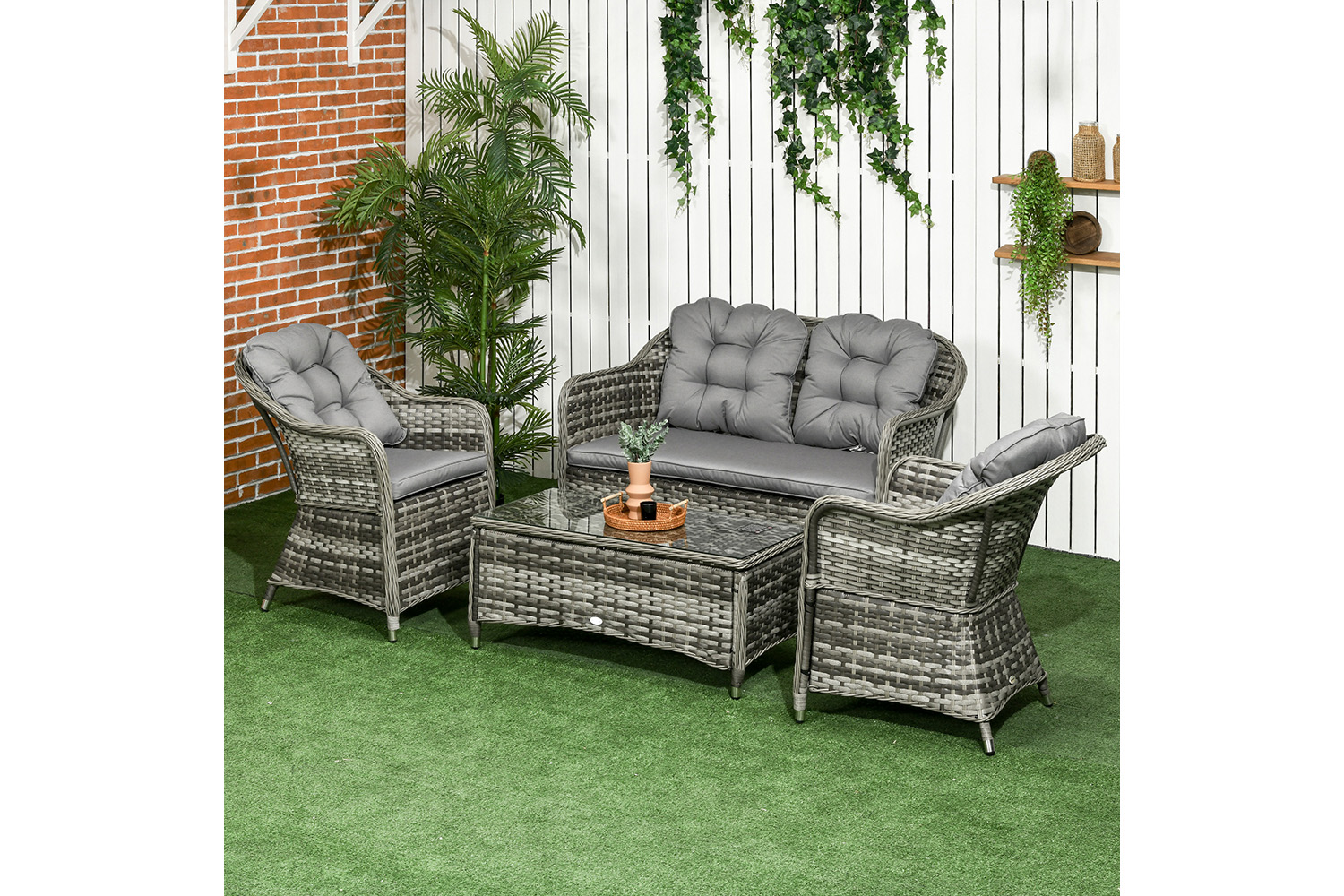 Bring the whole family together outdoors this summer, thanks to this conservatory furniture from Outsunny. It comes with two chairs, a double sofa and table. The frames of the garden furniture sets are made from tough and durable aluminium, wrapped in weather and fade resistant rattan for double the protection and durability. Outdoor furniture is easy to clean to keep it fresh and beautiful. Finished with seat and back cushions on each piece - you'll find it hard to get out once settled in.