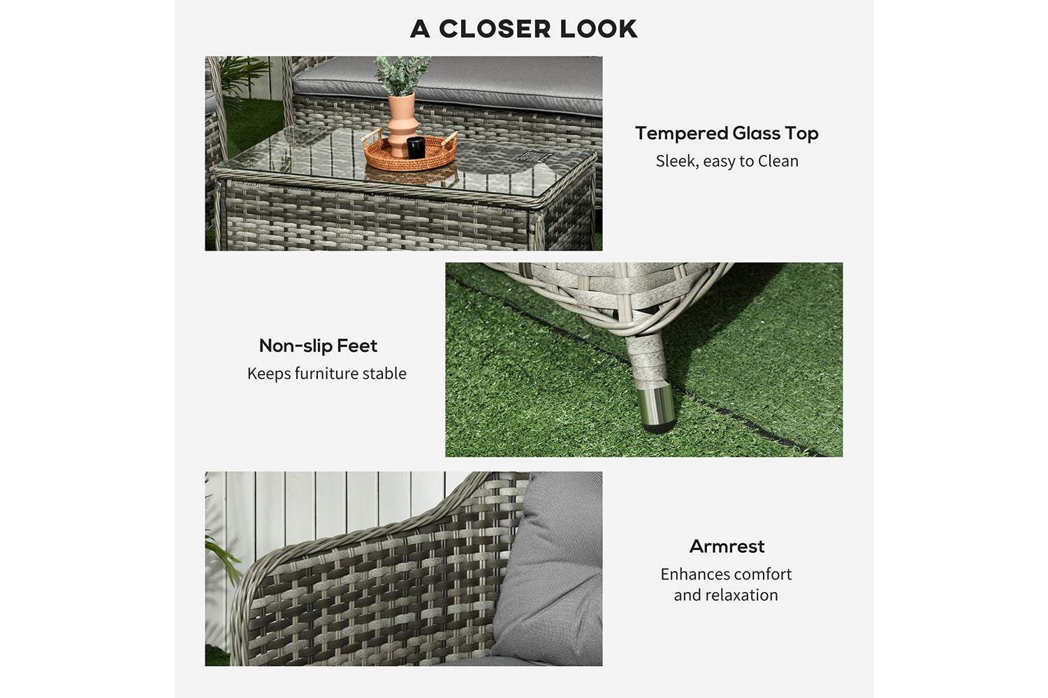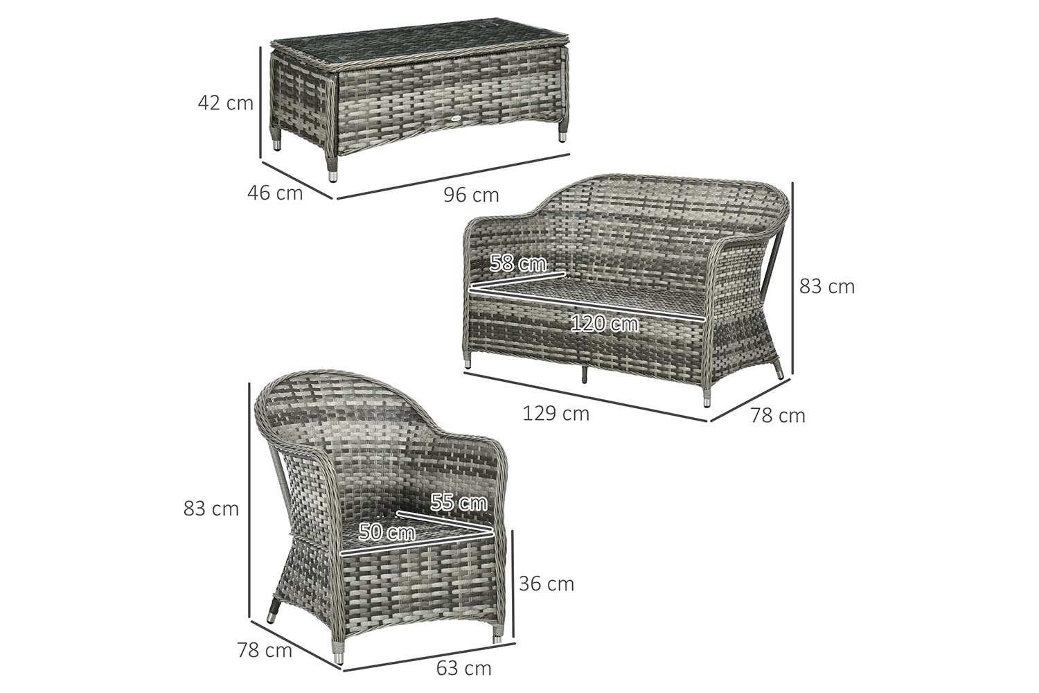 - Weight capacity: 220 kg(loveseat), 160 kg(armchair), 30 kg(table)