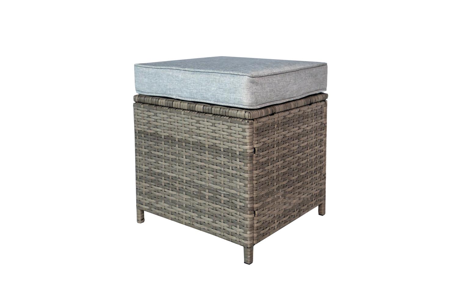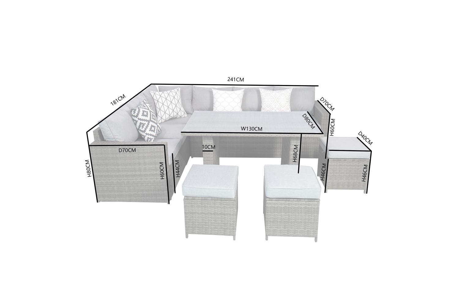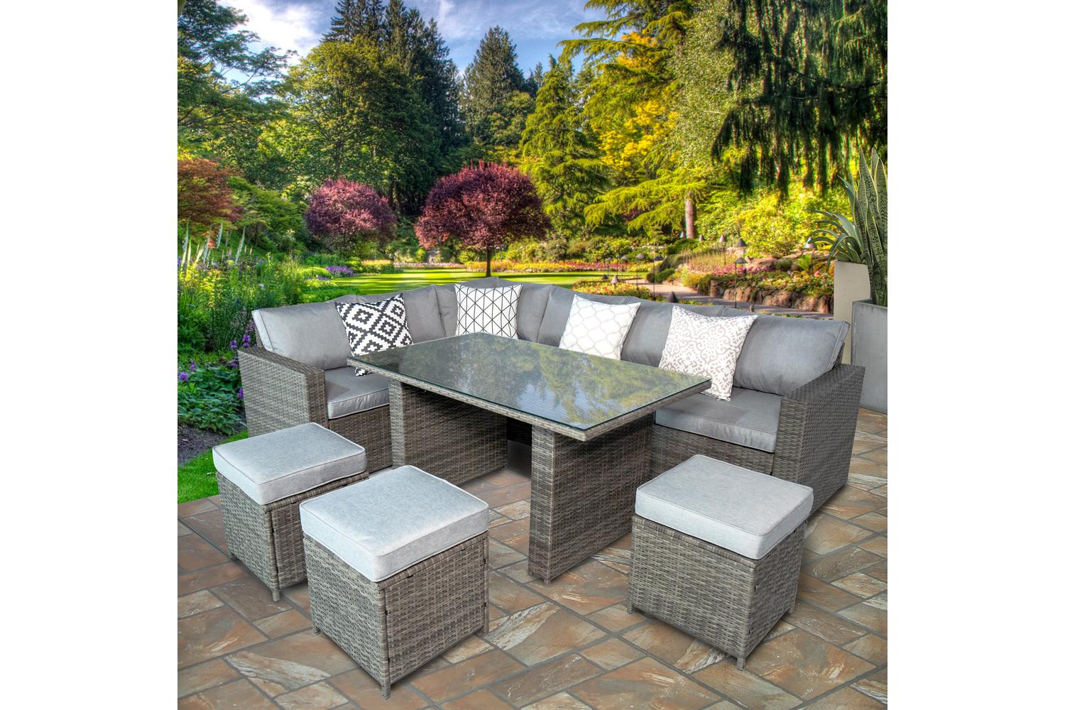 The capacious corner sofa and three comfy stools perfectly accommodate a lively gathering or a peaceful family evening. The sophisticated high table, layered with tempered safety glass, extends its practicality beyond beauty. Relaxing on the lavishly padded grey cushions of the sofa and stools, you will melt into the ultimate outdoor comfort. The four additional throw cushions further amplify the luxury.