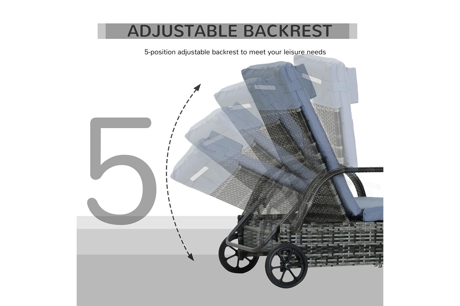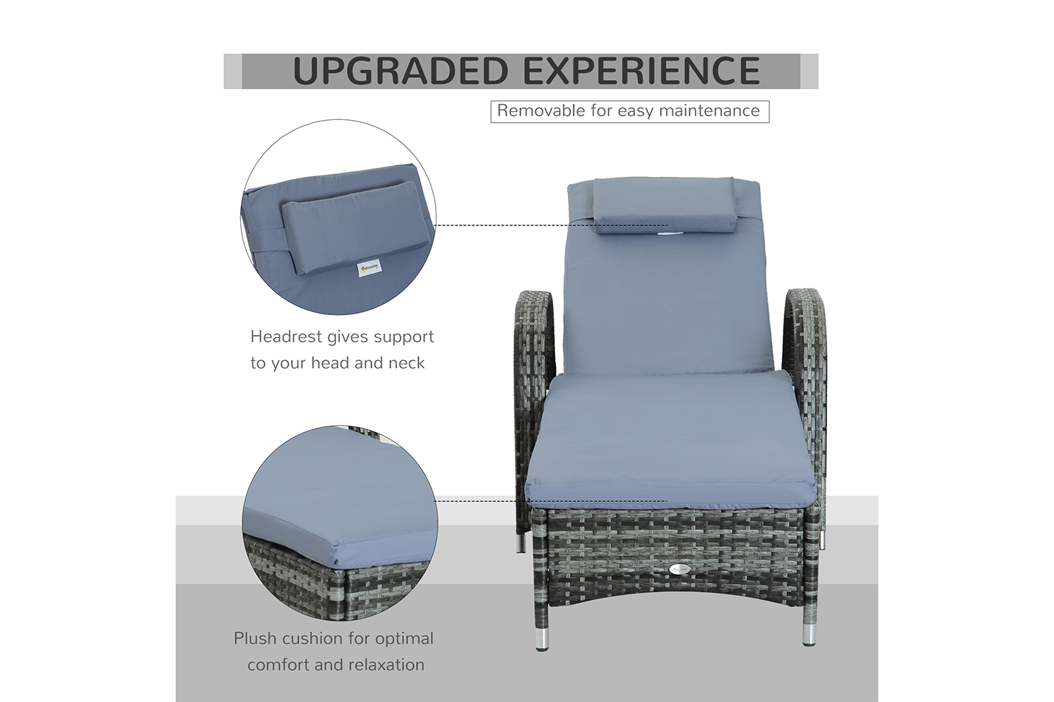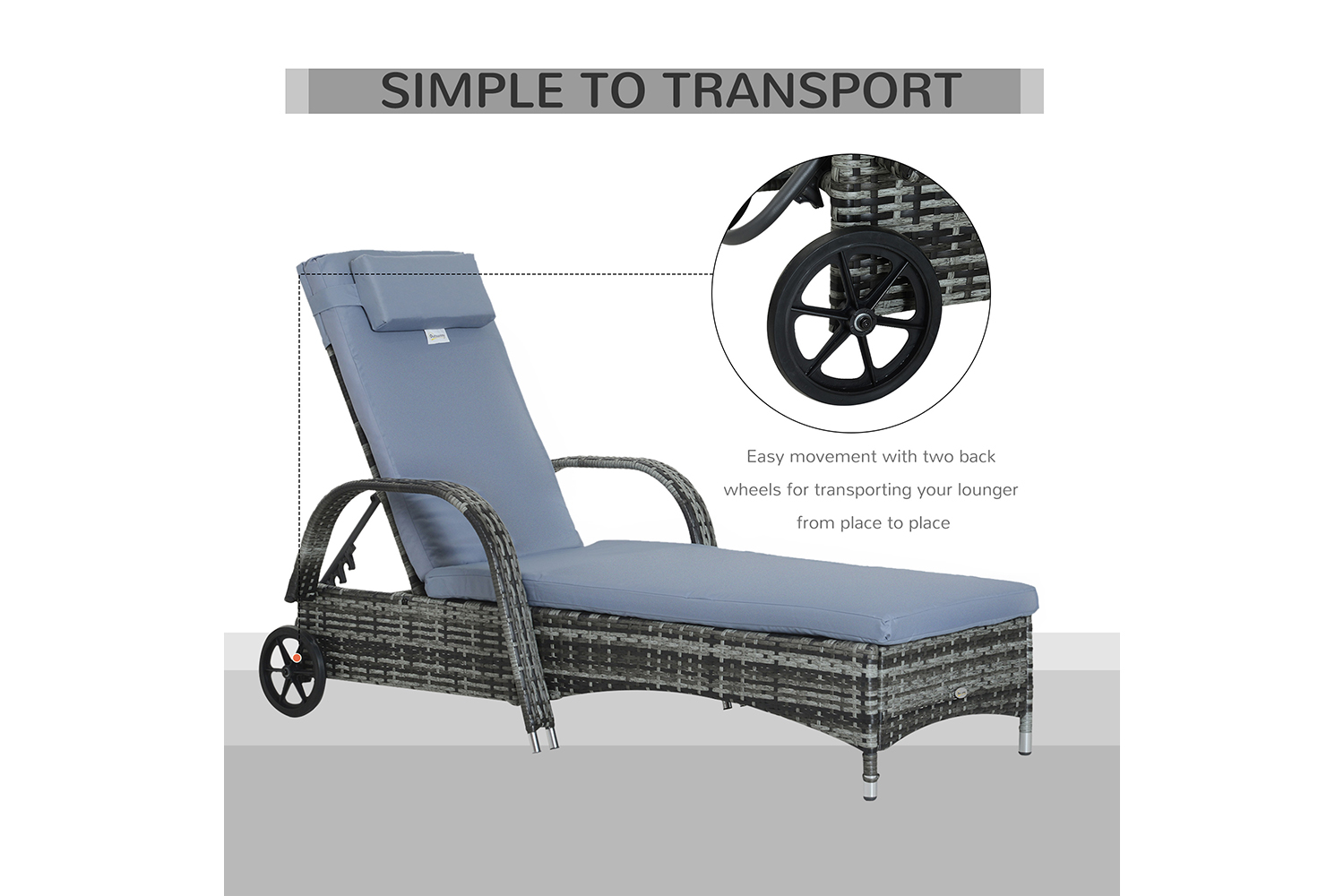 Soak up the sun with this Rattan Lounger from Outsunny. Made from weather-resistant PE wicker, with a strong steel frame underneath, the base is extremely sturdy and will provide you with many years of relaxation outside. On the top there is a thick foam cushion seat with a removable headrest for comfort and the back can be adjusted five different levels to suit your preferences. It is finished with two wheels to you can move it easily, whenever you wish.