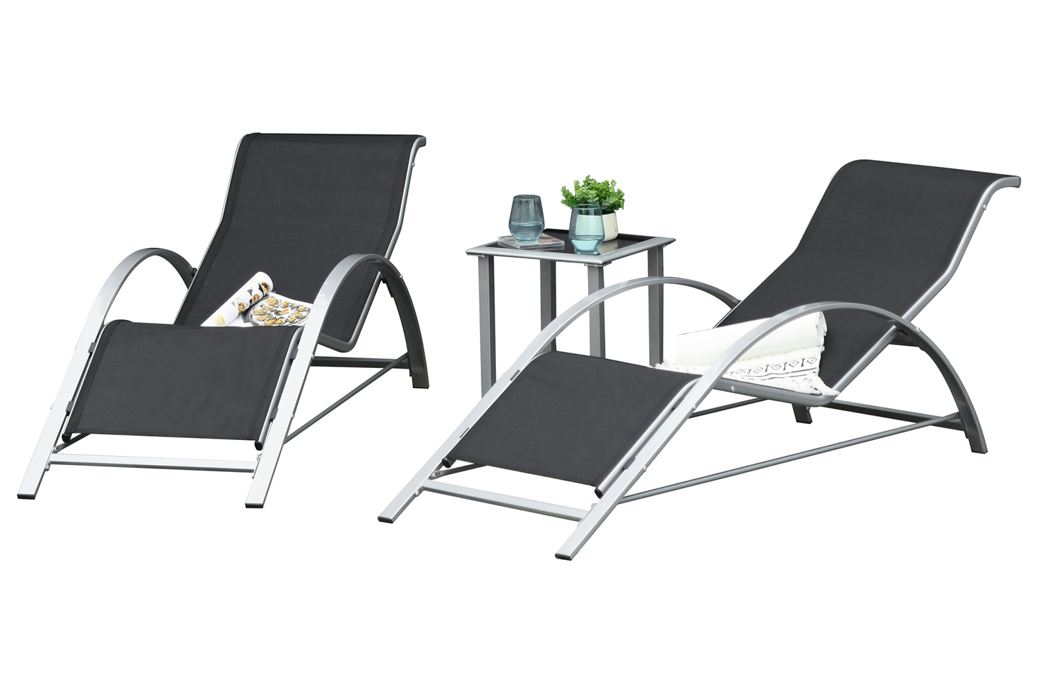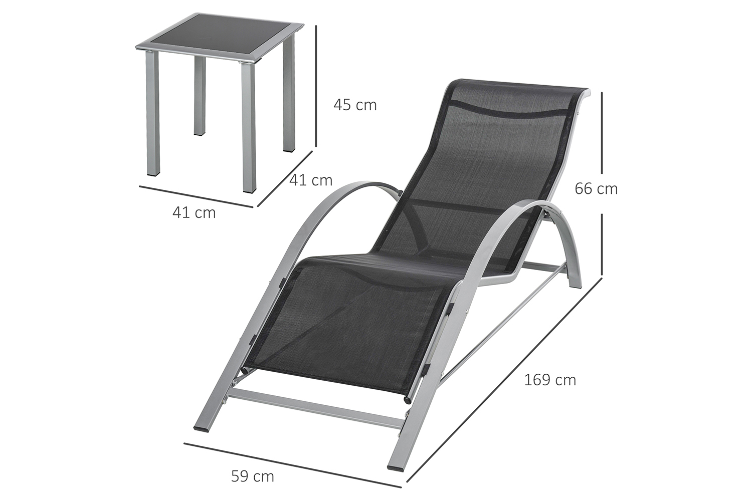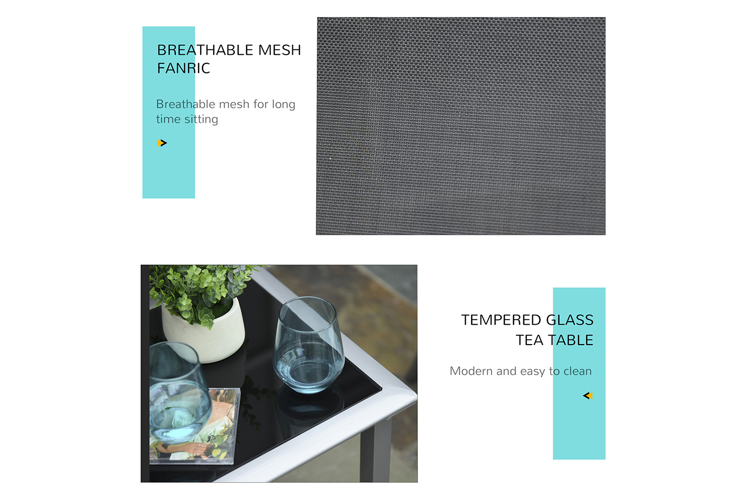 Refresh you outdoor space with this lounging set Outsunny. Using metal for the frame of both chairs and table, the structure is tough and durable so it can be used every day. The chairs are wrapped in breathable mesh for comfort and smoothness on the skin. The table comes with a thick glass top for a safe and secure holding place. Stylish and functional, this set is perfect for patios, gardens, balconies and any other outdoor space. Assembly is required.