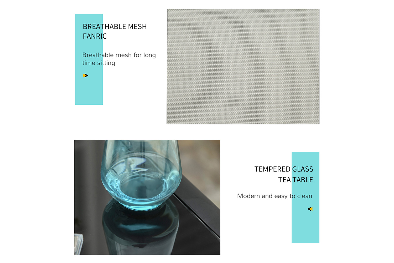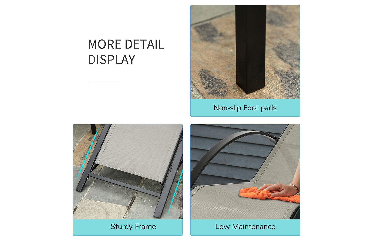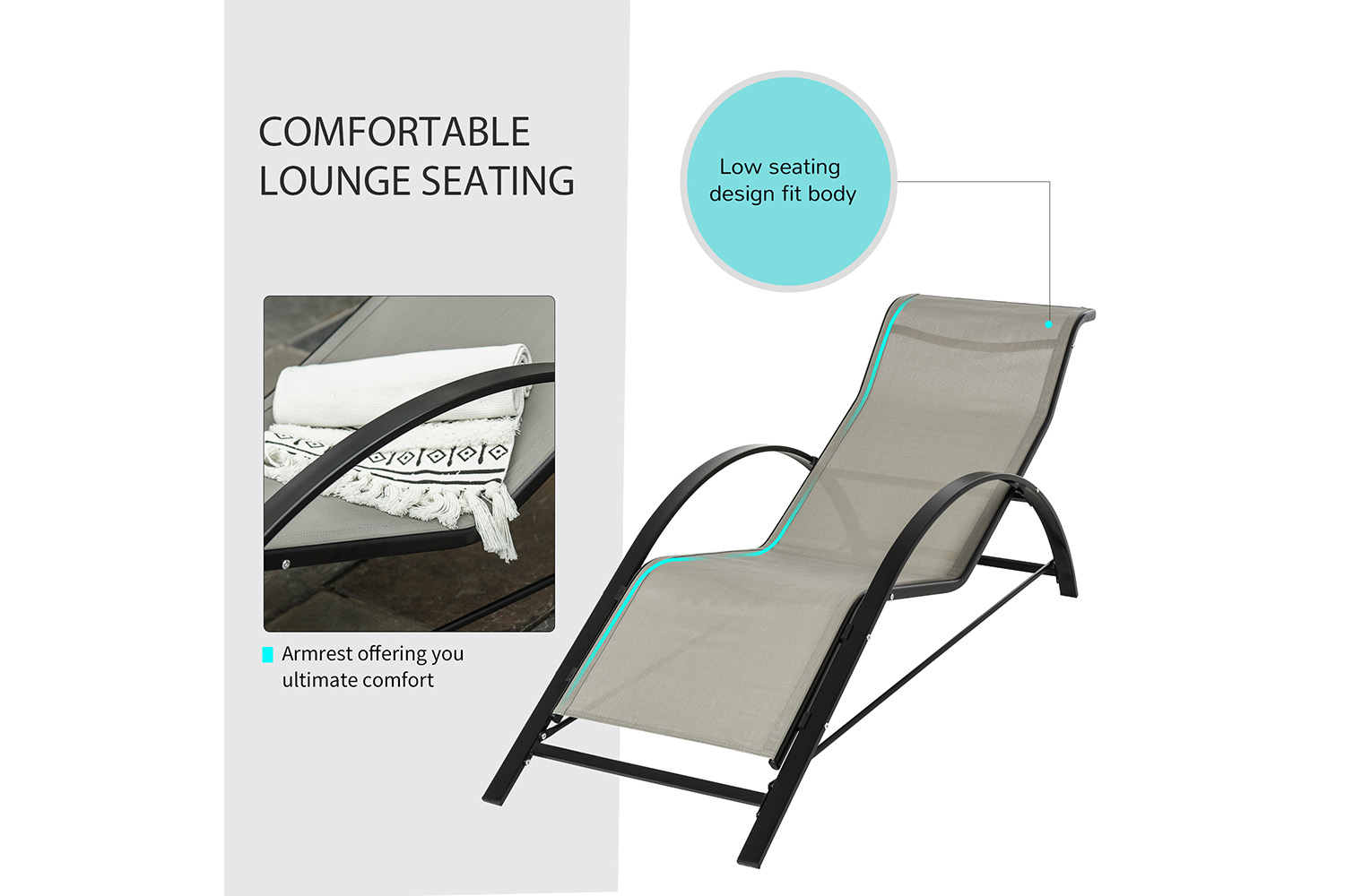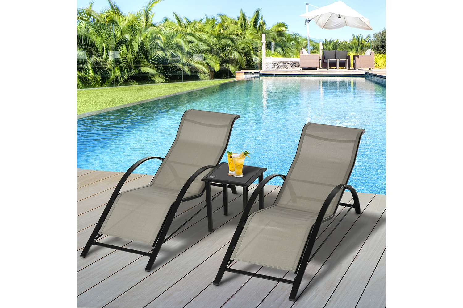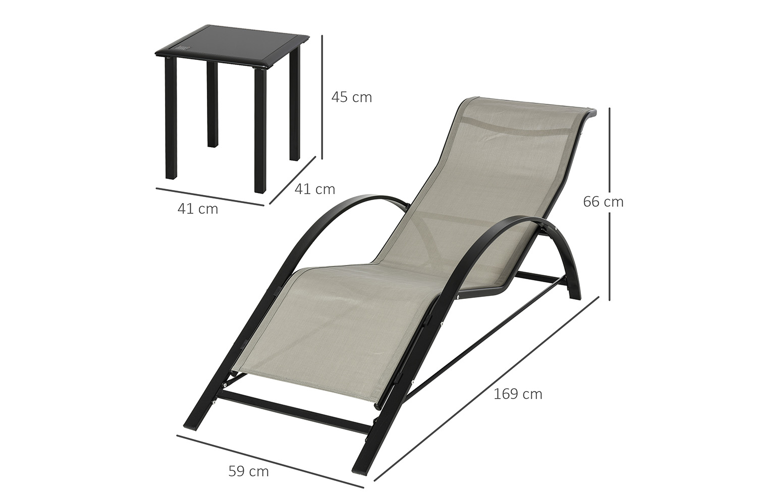 Refresh your outdoor space with the garden recliner chairs set of 3 Outsunny. Using metal for the frame of both chairs and a table, the structure is tough and durable, so it can be used every day. The sun loungers for garden are wrapped in breathable mesh for comfort and smoothness on the skin. The table comes with a thick glass top for a safe and secure holding place. Stylish and functional, this set is perfect for patios, gardens, balconies and any other outdoor space. Assembly is required.