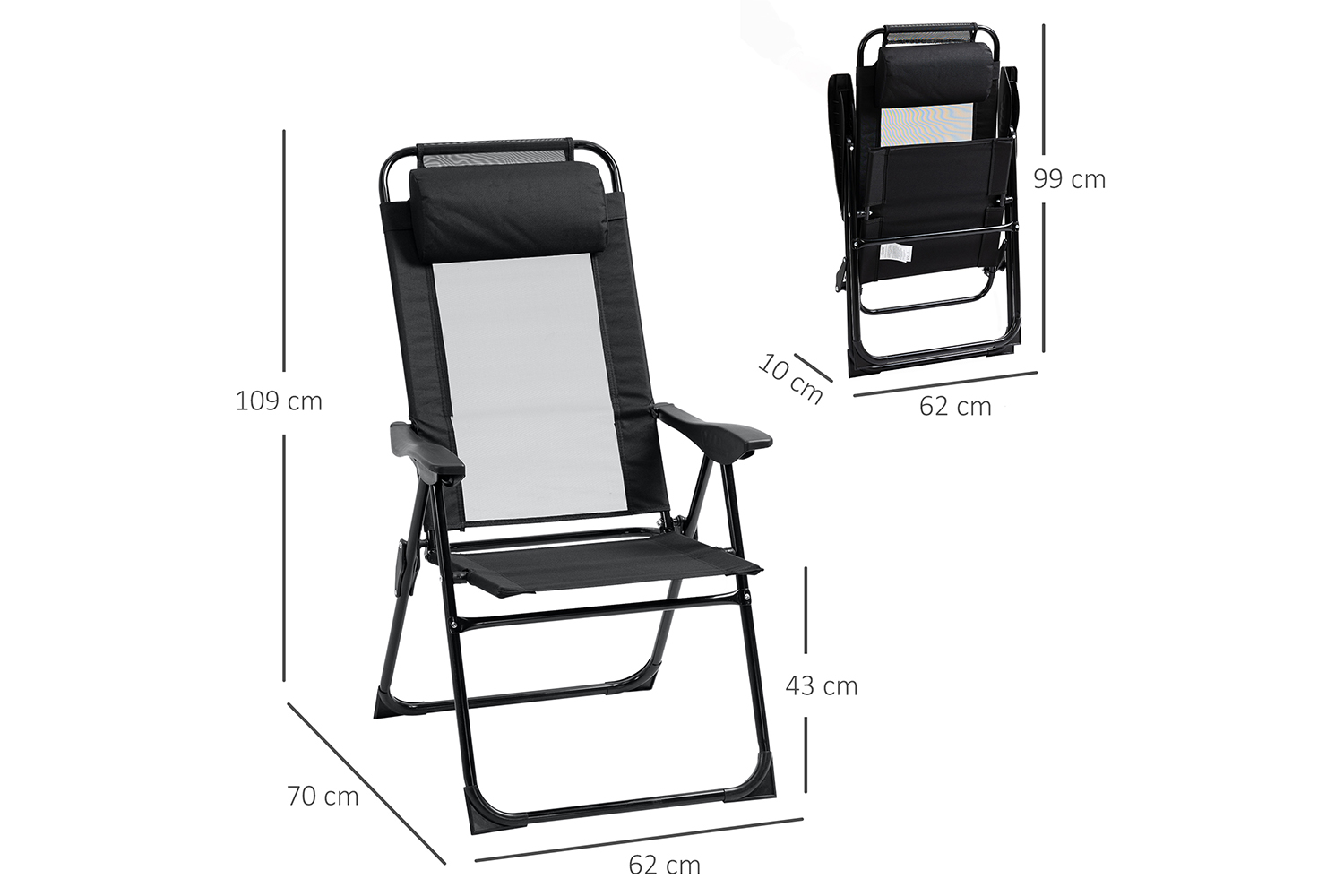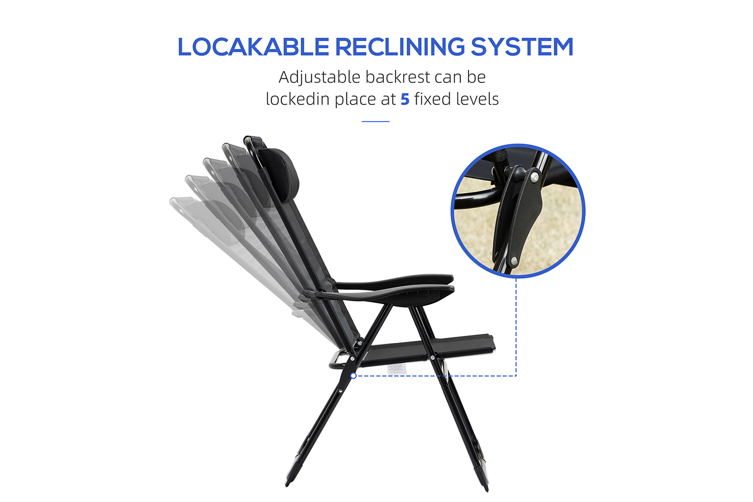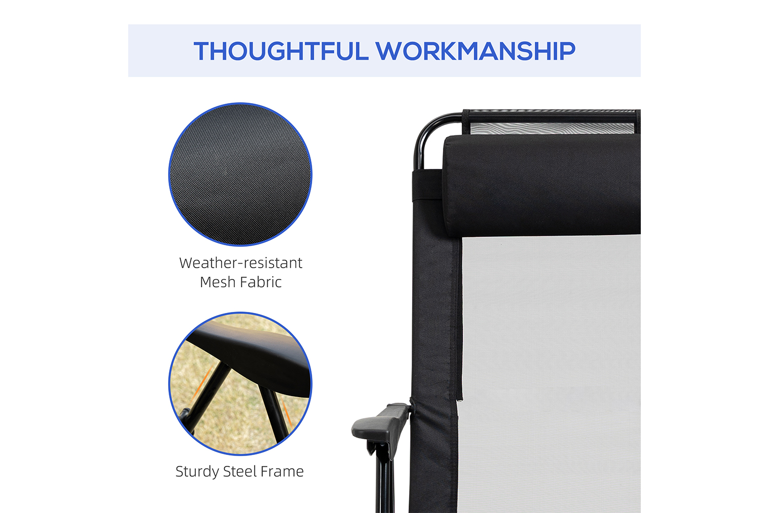 Let the stress melt away whenever with these two sun chairs from Outsunny! The duo set is great for enjoying the outdoors with a friend. The backs recline to five different positions, so you can relax the way you want. The fabric mesh weather-resistant seats are breathable, with a padded headrest for comfort and support. A foldable design, you can take these garden chairs wherever you want - whether that's around your outdoors or beyond.