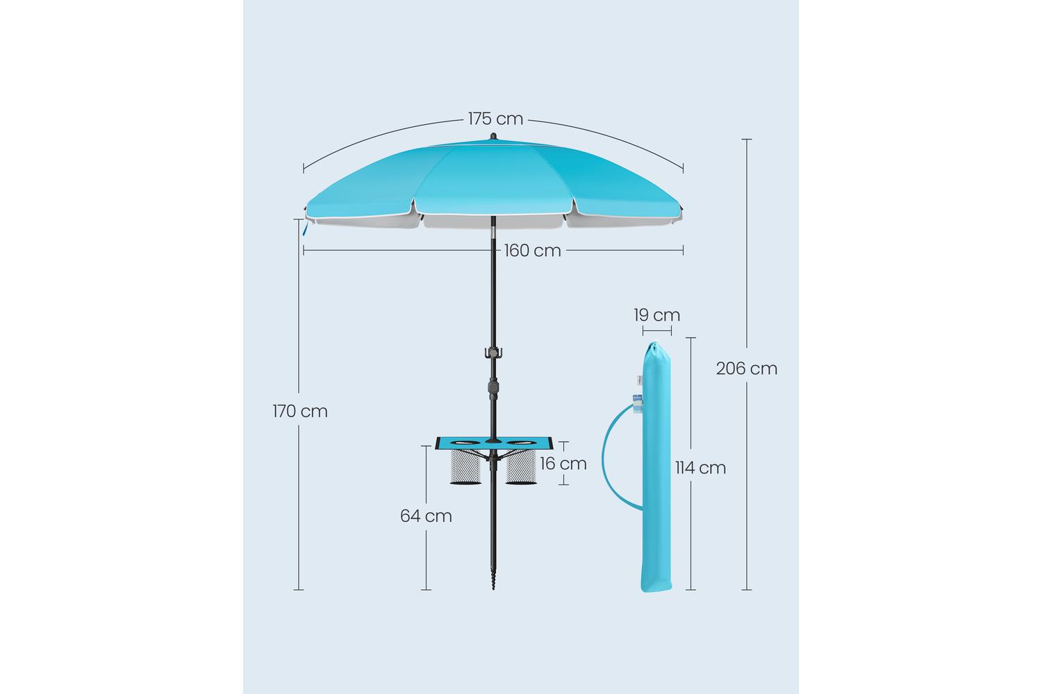 Practicality is at the heart of this design. The integrated storage area can hold up to 10 kg, perfect for keeping your drinks chilled and close at hand. Handy hooks on the pole let you hang towels, hats, or bags, keeping your essentials organised and within easy reach. When it is time to pack up, simply disassemble the parasol and slip it into the included carry bag for easy transport and storage—ideal for spontaneous trips to the coast or afternoons in the back garden.