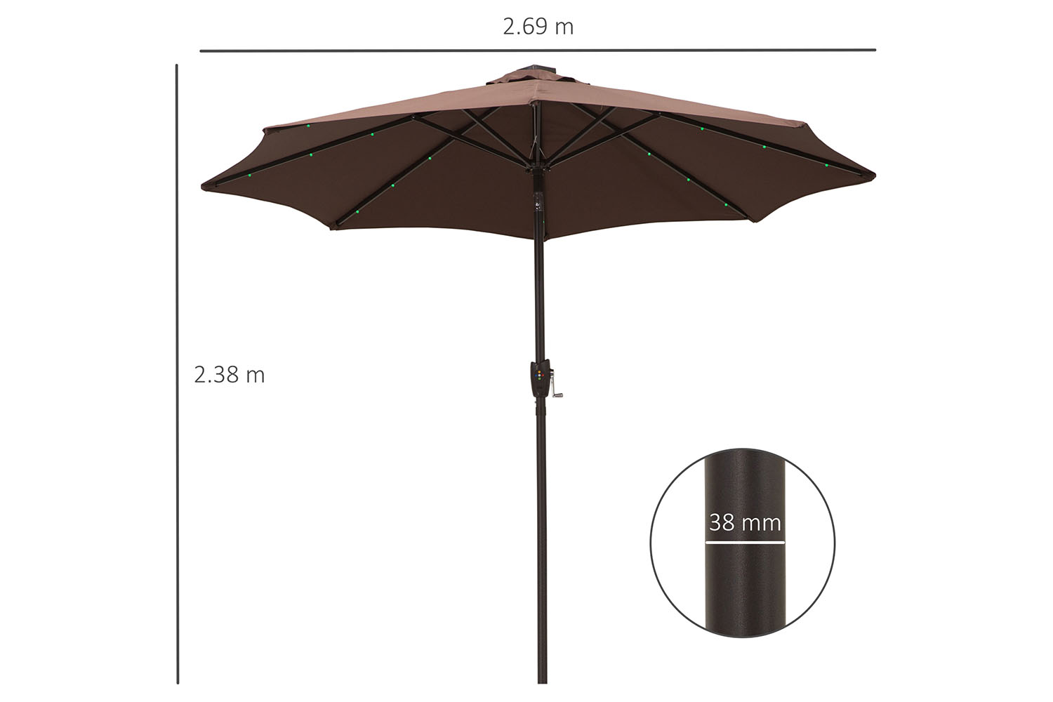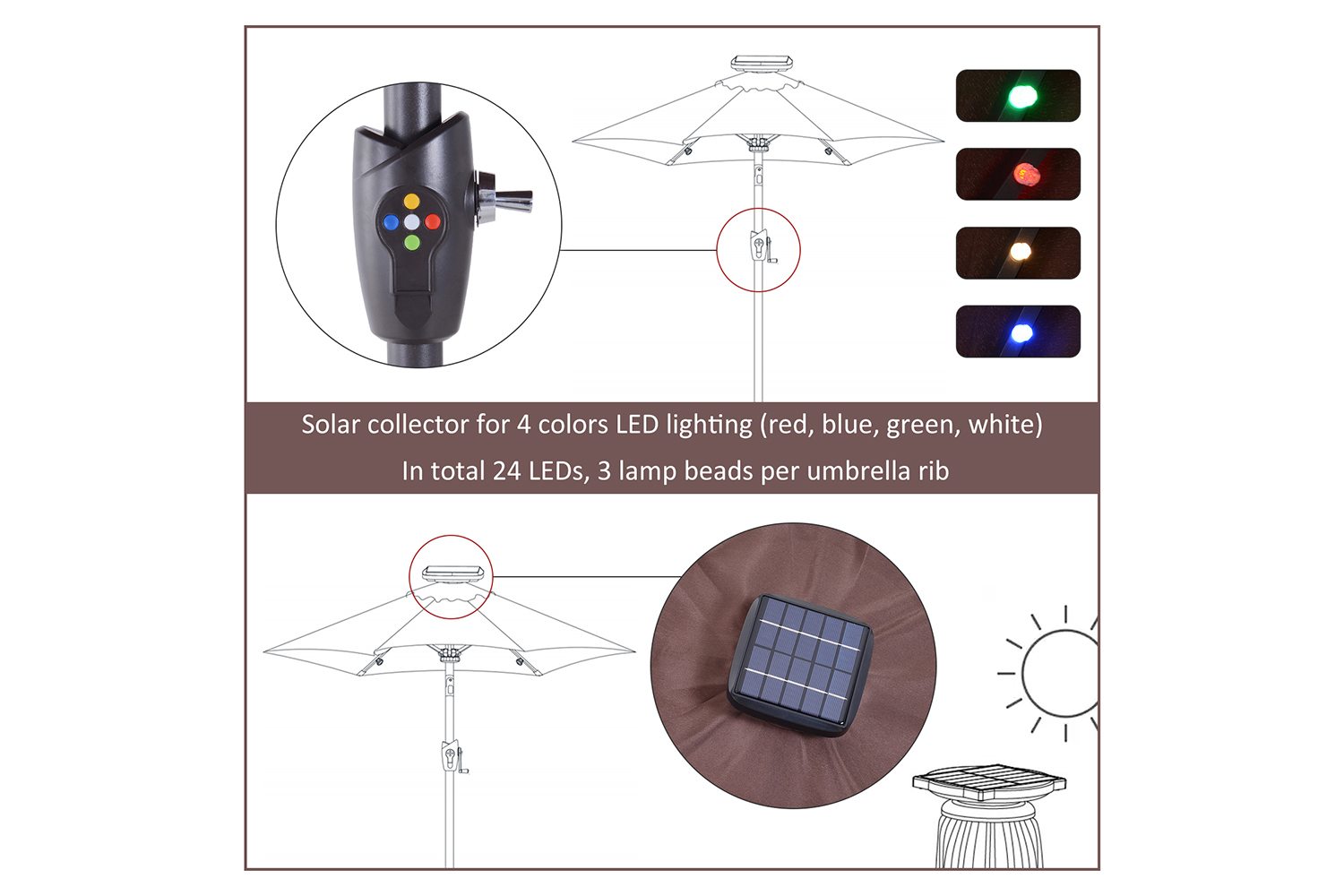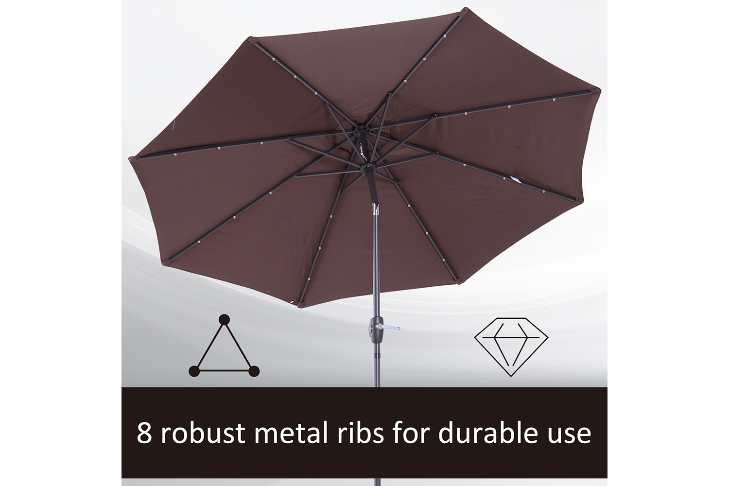 This Outsunny patio umbrella is a perfect choice to give shade on those sunny days, it has the ability to tilt for better protection. The umbrella is made using a metal frame and the umbrella shade is made of polyester fabric. Featuring a classic tranquil colour and sleek lines, It is design to maximize the shade capability. It is suitable for your patio, garden, and can be used with existing garden furniture. The metal structure and 180g/? polyester fabric gives optimum support and long lasting features. Too make it even better, they come complete with Solar powered Led lights with adjustable 4 colours. So when it gets dark you can still continue enjoying the outdoors.