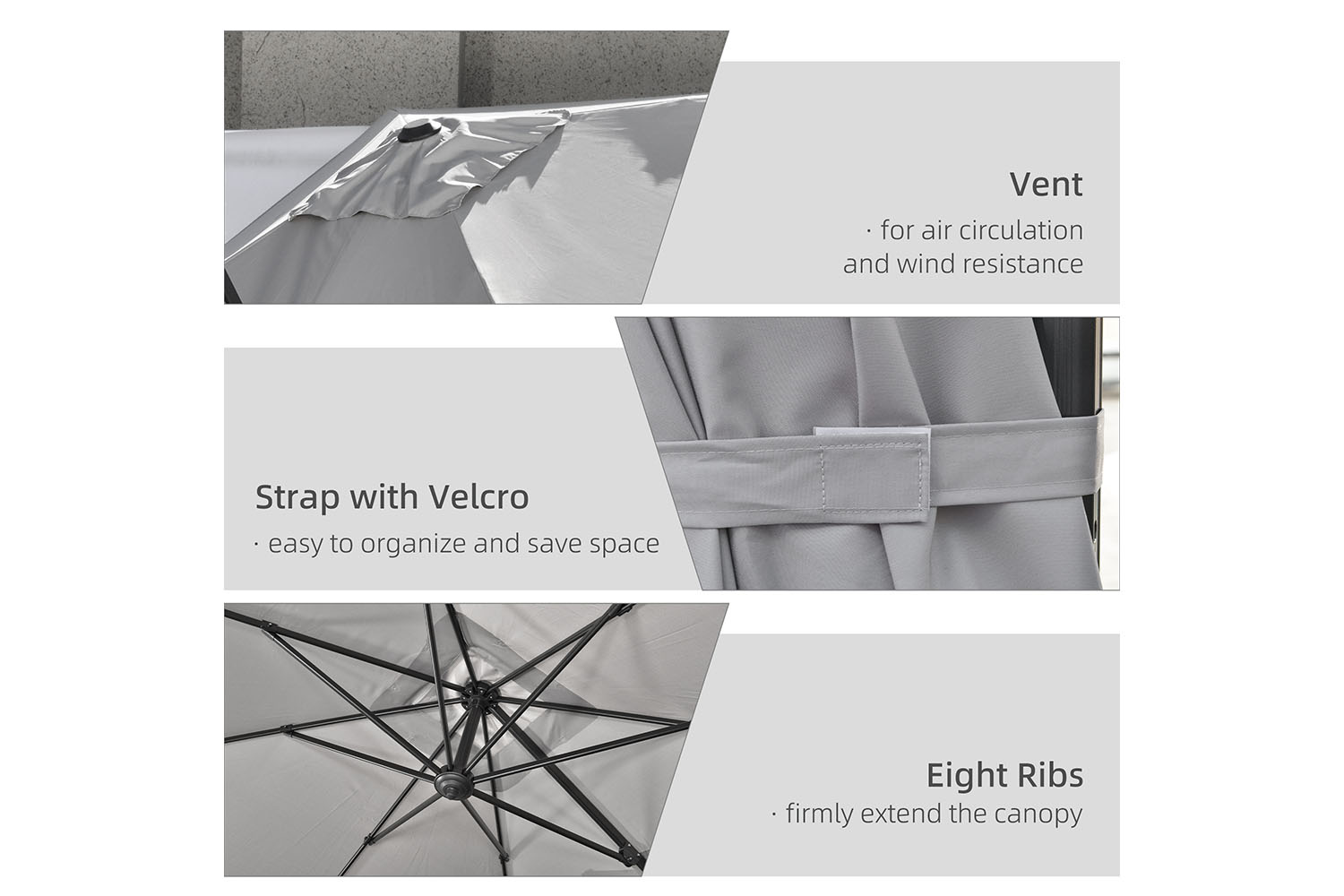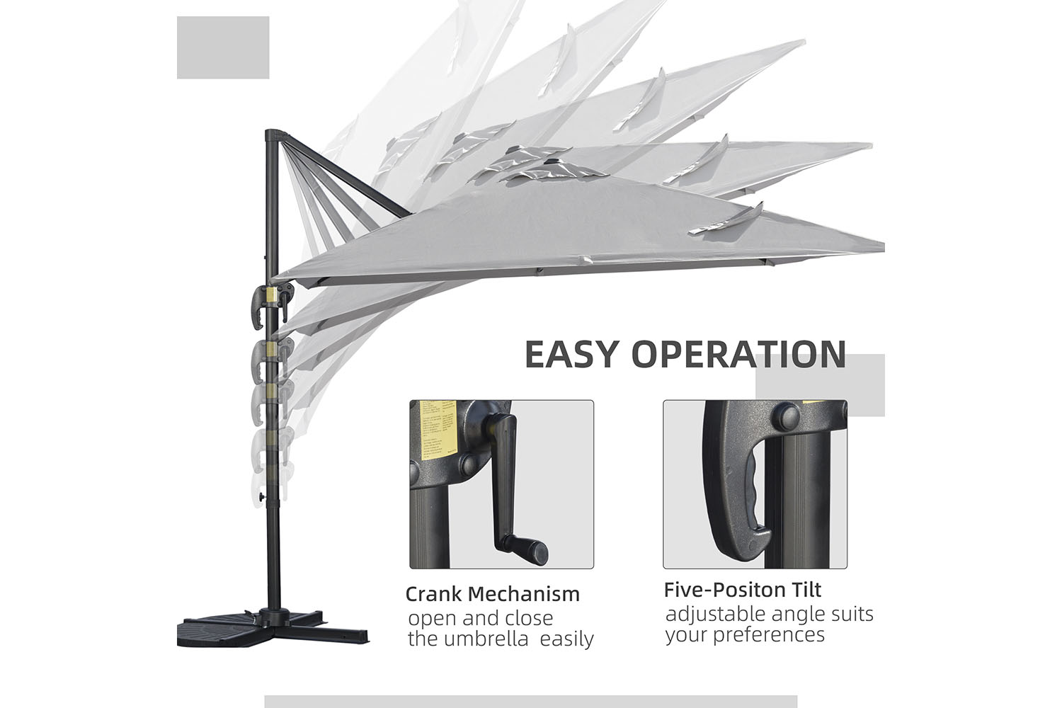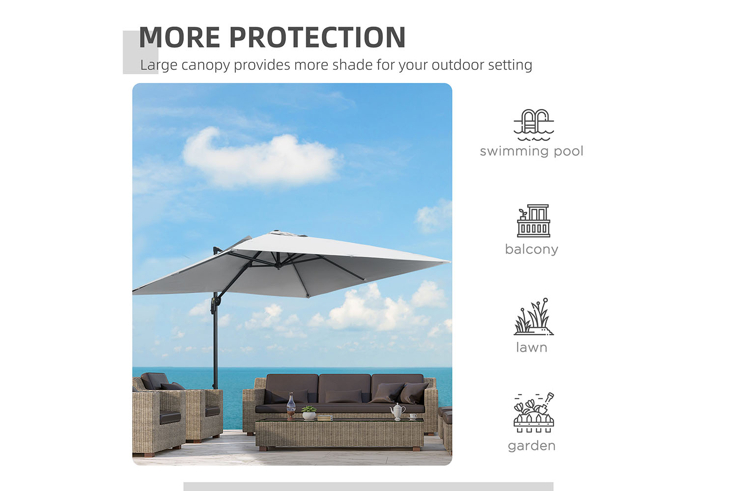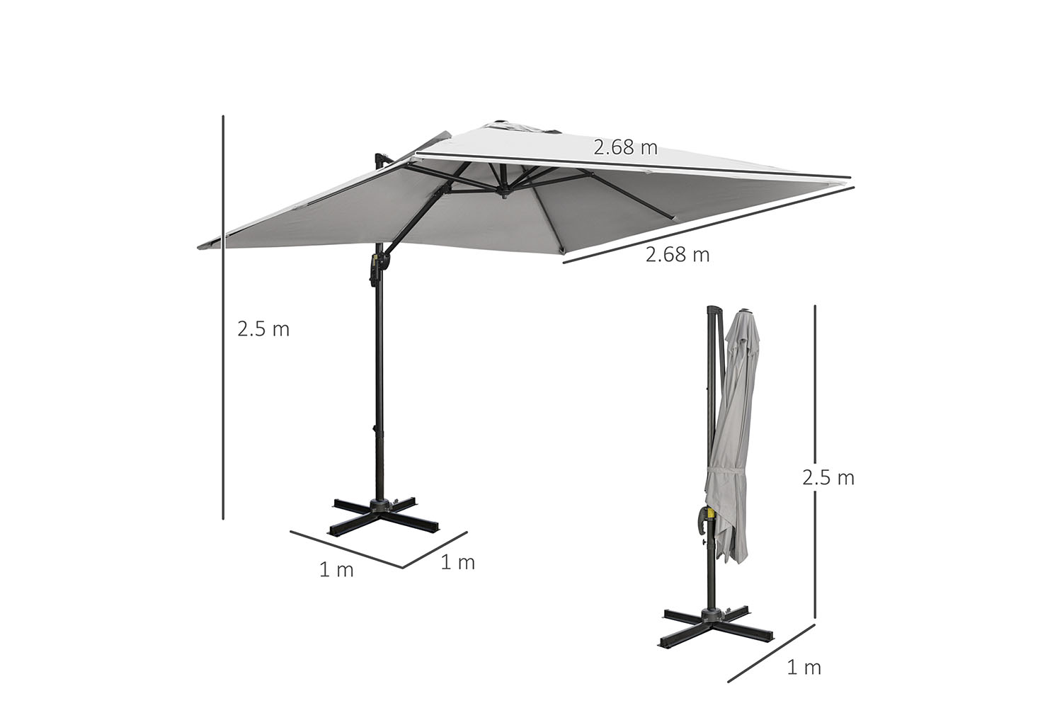 Keep yourself protected whilst enjoying the sun all day. Say hello to this Outsunny cantilever parasol. The overhanging parasol design is great for dining: no pole in the middle of your view. The crank handle opens and closes the canopy easily, with a foot pedal to rotate to a position you want. An aluminium pole means a strong core structure, with ribs to connect to the canopy for extra support.