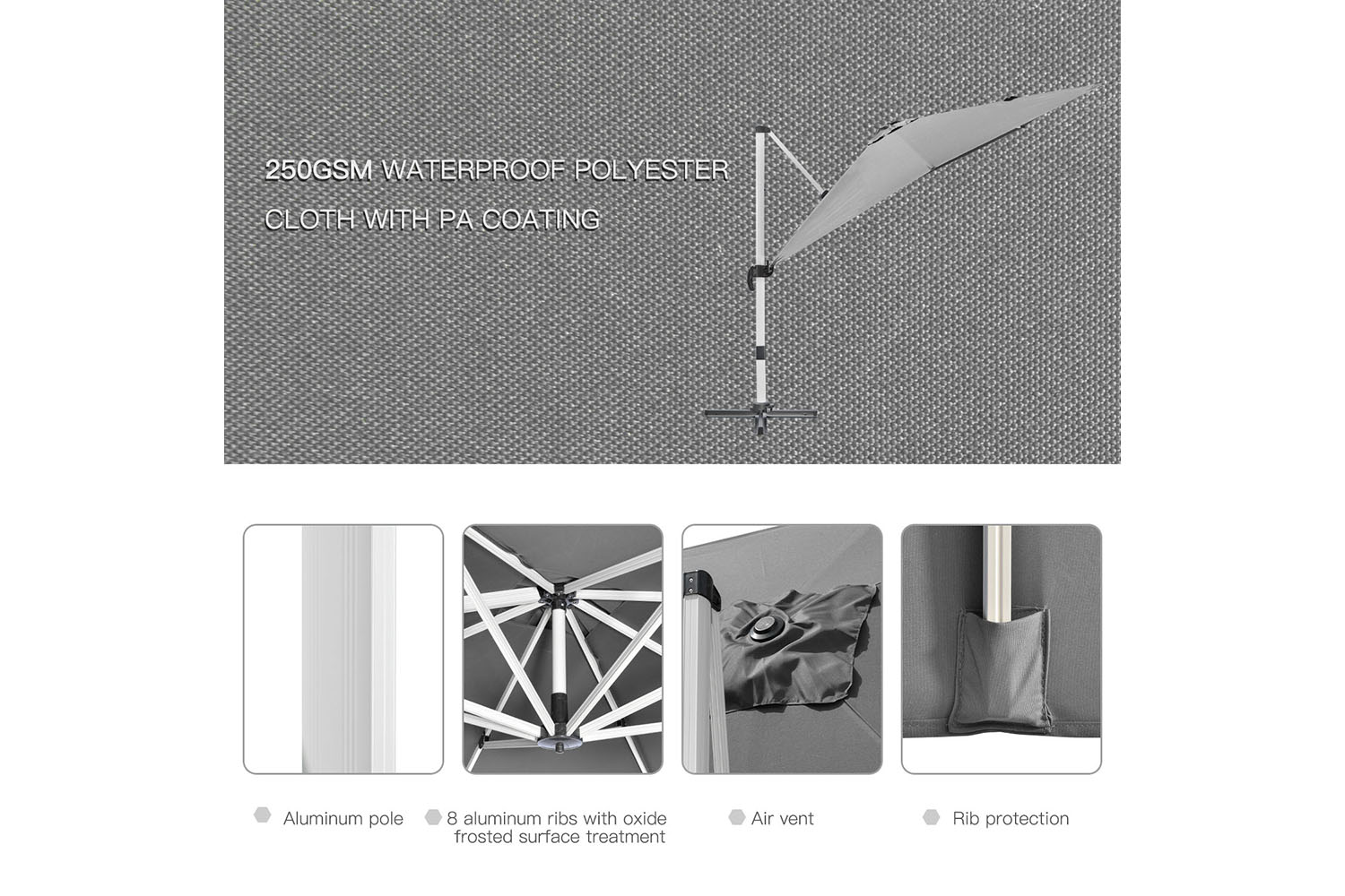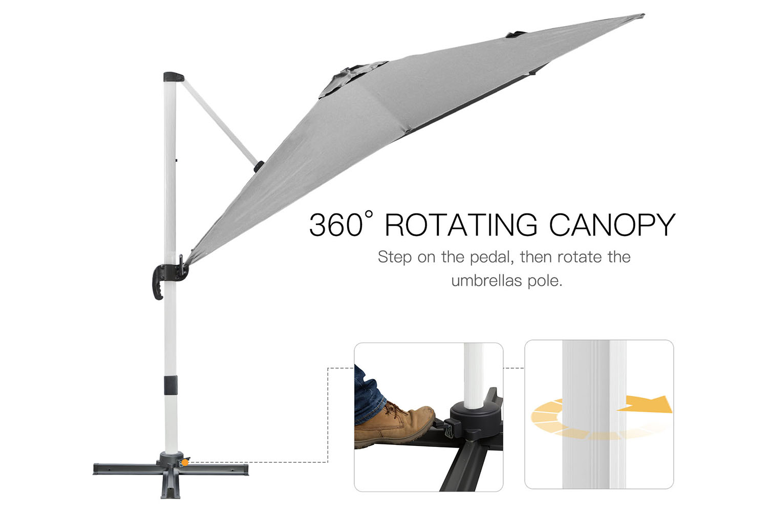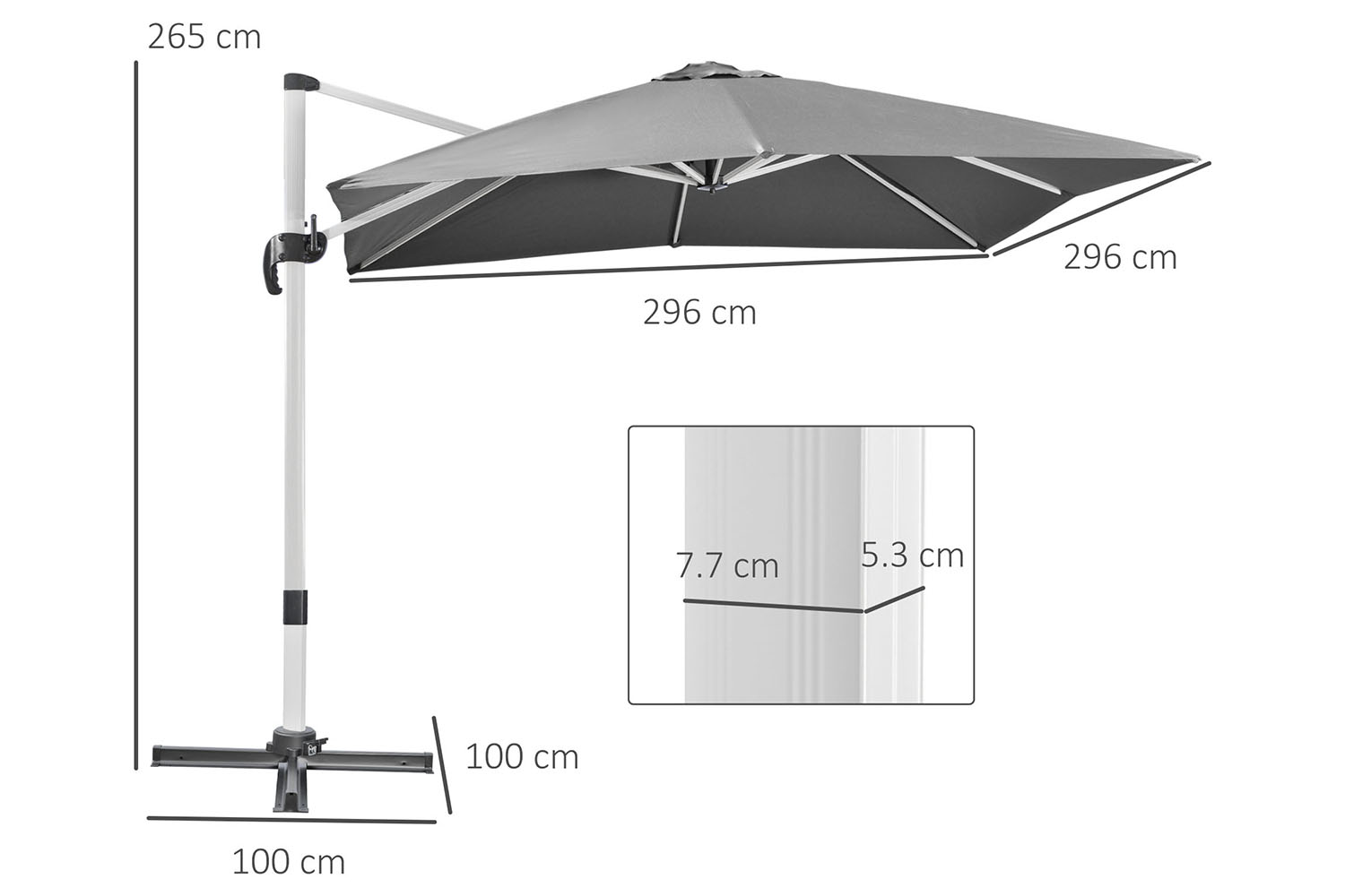 Keep yourself protected whilst enjoying the sun all day with this cantilever parasol from Outsunny. A two-tier canopy for better airflow: reduces chances of it turning inside out. It's connected to the frame via eight aluminium ribs for support. The crank mechanism makes the canopy easy to open and close, with a foot pedal to change the 360° movement. Cross base included, 100 kg+ weight is required.